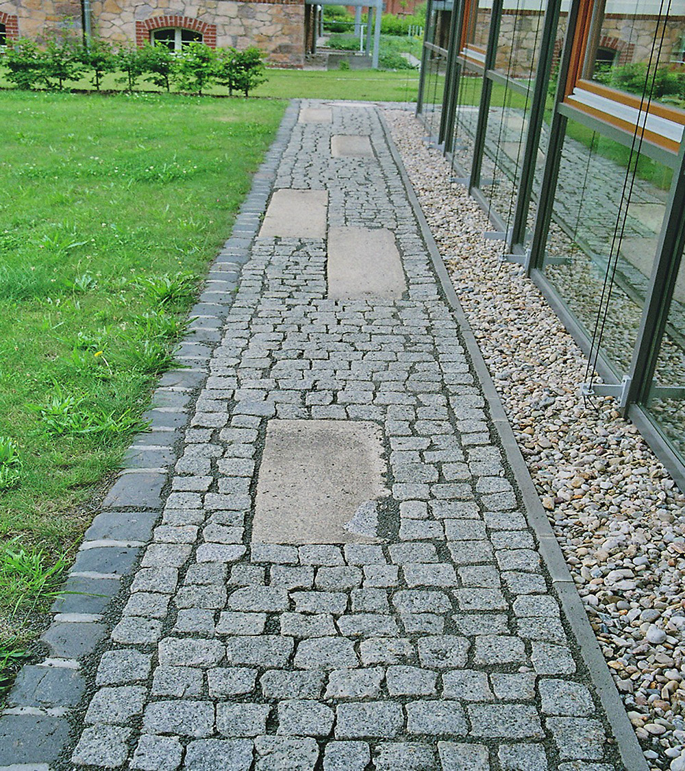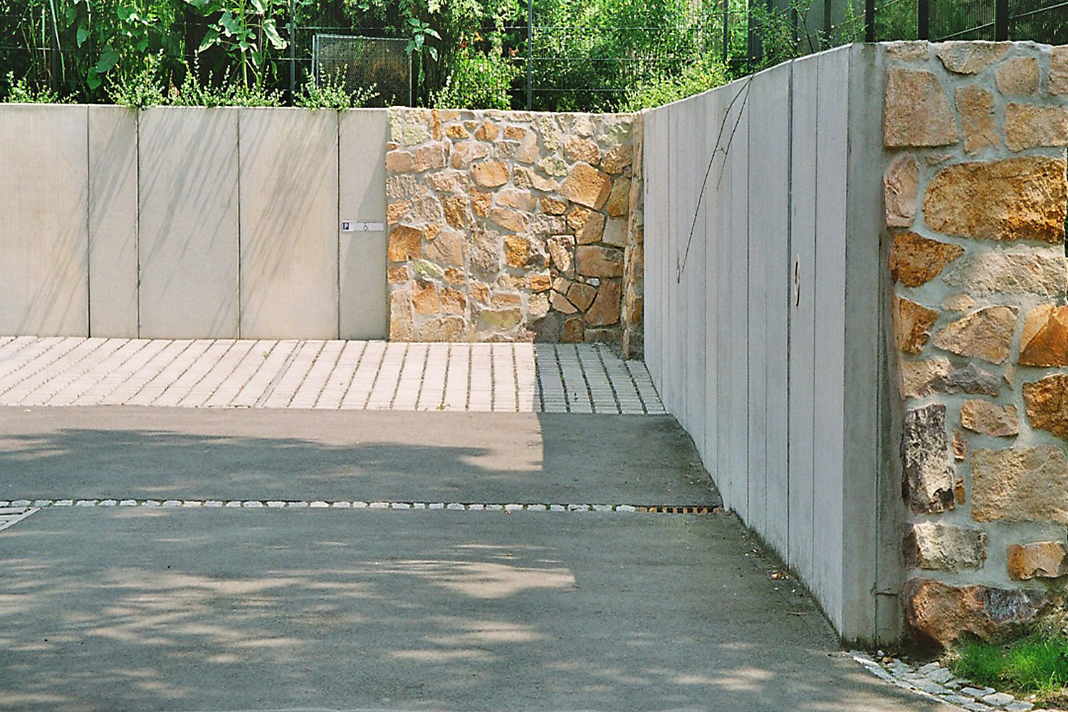 Zur Straße hin ist das Grundstück mit einer Mauer aus Sichtbeton begrenzt, die in unregelmäßigen Abständen mit Naturstein ausgemauert ist. Diese waren auf dem Grundstück bereits vorhanden und fanden so eine sinnvolle Verwendung.