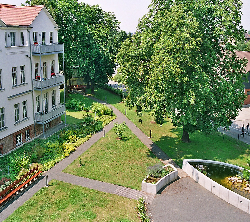 Im Rahmen des Neubaus des Altenpflegeheimes Carl Heinrich Haus in Borna wurden altengerechte Außenanlagen des 91-Betten Hauses realisiert.