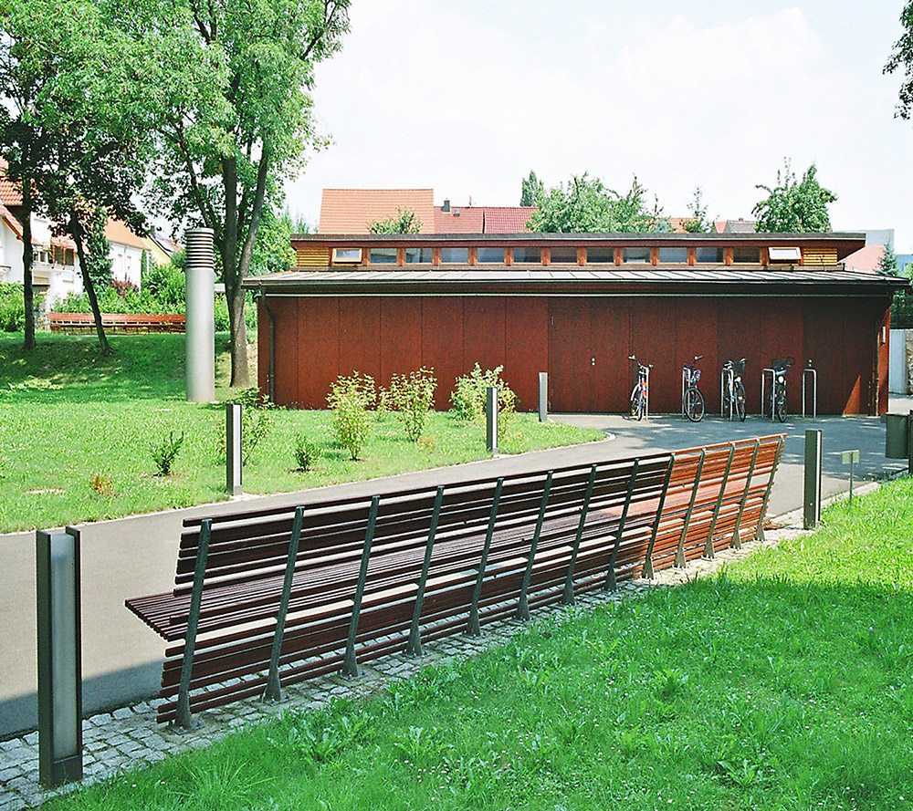 Für das verwinkelte Grundstück wurde als Form der Kreis gewählt, der als Endpunkt von Sackgassen öffentliche Aufenthaltsräume in unterschiedlichen Größen bildet und als Terrasse im Erdgeschoss kleine private Bereiche bildet. Vier Meter lange Holzplateaus führen auf diese Plätze, von Rundbänken aus Holz werden sie gefasst, die speziell für diese Situation entworfen wurden. Die unregelmäßige Holzlattung der Bänke findet sich beim Carport und der Mülleinfassung wieder.