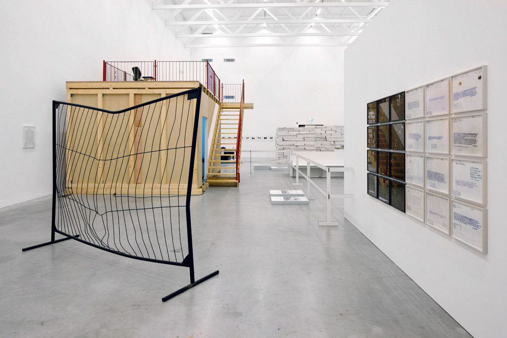 „… die Ausstellung „squatting. erinnern, vergessen, besetzen“ – das vierte von Künstlerinnen und Künstlern kuratierte Projekt in der temporären Kunsthalle. Der Künstler Tilo Schulz hat den Kurator Jörg van den Berg als Partner eingeladen, und gemeinsam entwickelte das Kuratorenduo eine thematische Ausstellung, die 22 Arbeiten von siebzehn Künstlern versammelt und sich dabei auf die Präsenz der Werke und deren Dialog untereinander verlässt. […] Durch eine zaunartige Struktur, die den Raum in drei Bereiche trennt, werden die Besucher immer wieder vor die Tür geschickt und so angeregt, die unmittelbare Umgebung auf dem Schlossplatz mit in ihre Betrachtung einzubeziehen.“