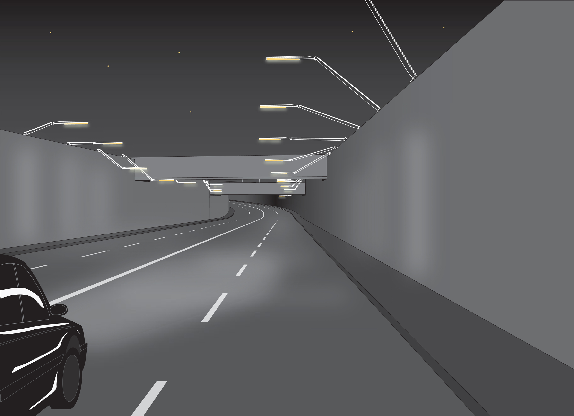 Zur Auseinandersetzung mit der Thematik Geschwindigkeit und zur Unterstreichung der Spezifik des Ortes werden das verkehrstechnische Bauwerk, die Lärmschutzwand und das Element Licht genutzt.