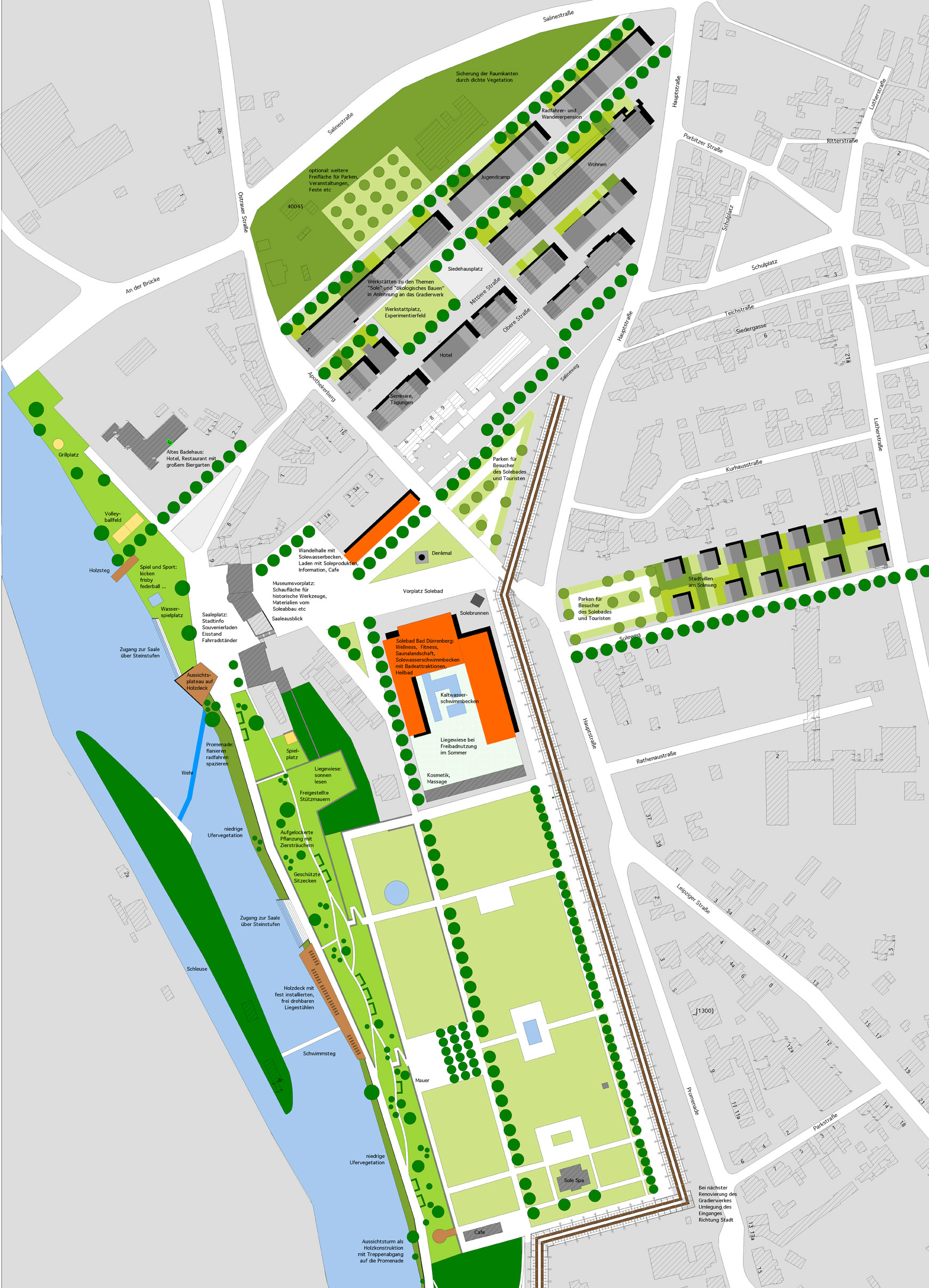 Im Rahmenplan sind Stabilisierungs- und Optionsfelder festgelegt. In den Stabilisierungsfeldern wird prioritäre Sicherung und Aufwertung empfohlen, die Optionsfelder dagegen bedürfen kurzfristig keiner Maßnahmen, sondern halten Flächen für zukünftige Investitionen frei, damit die Stadt bei Bedarf schnell handeln kann. Weiterhin sind die wichtigsten städtebaulichen Entwicklungs-empfehlungen dargestellt, wie z.B. das Vorrücken der städtischen Kante an die Saale oder die Stärkung des Parkcharakters im Kurpark und des Gartencharakters in den Mauergärten, um eine Vielfalt an öffentlichen Räumen zu erhalten. Als wichtigste Maßnahme gilt die Aufwertung der Saalepromenade als hohes Potenzial der Stadt für Bewohner und Touristen – mit Hilfe kleiner Impulsprojekte, die schnell und unkompliziert zu realisieren sind, nicht viel Geld kosten und trotzdem eine verbessernde Wirkung auf das Gesamte erzielen.