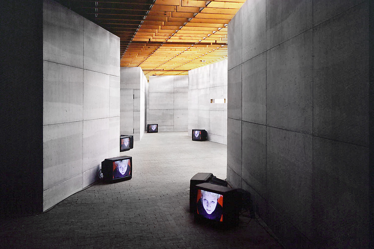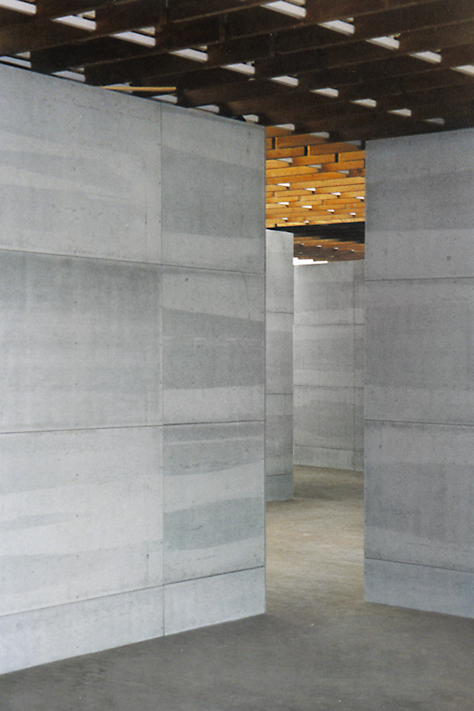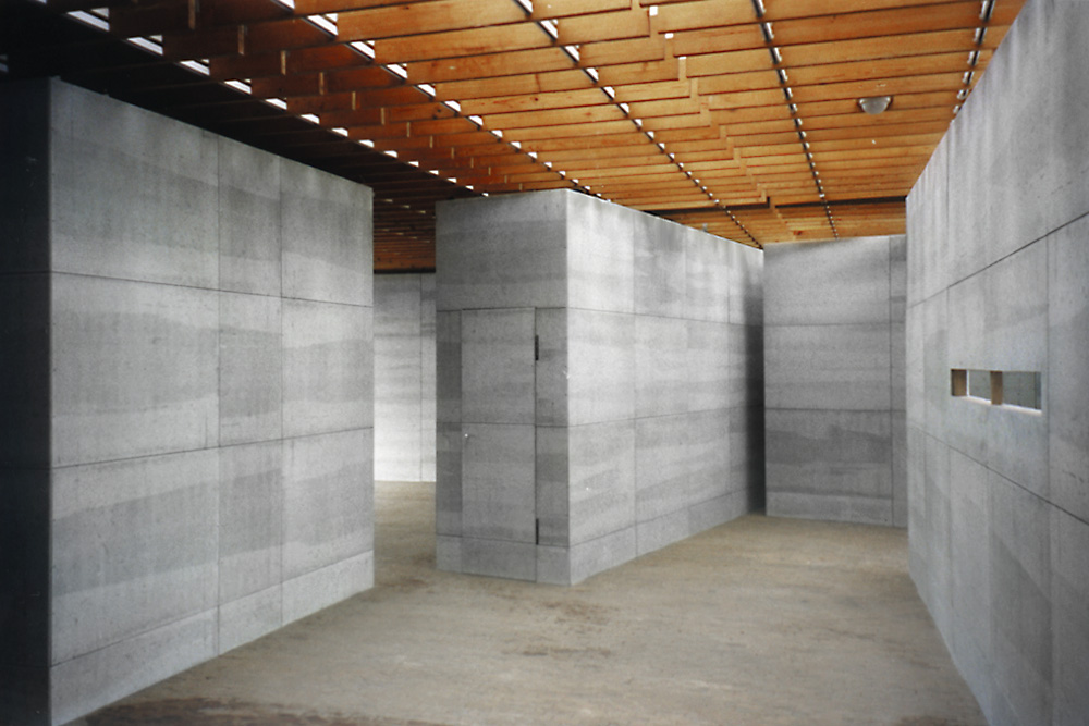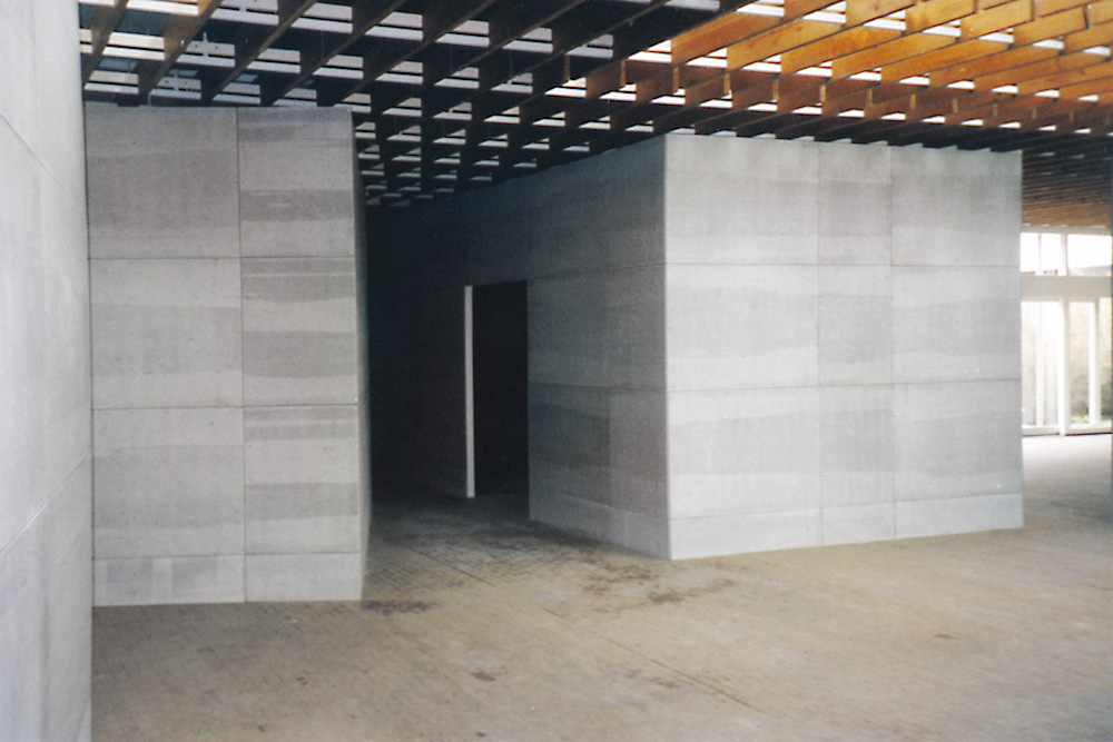 In der größten der drei Hallen ordnete sich die Ausstellungsarchitektur durch wenige zurückhaltende Einbauten der Weite des Raums unter und verstärkte diese zugleich. Die Box, die den Übergang von Halle 1 zu Halle 2 bildet, entläßt den Besucher durch einen engen Gang in eine neue Maßstäblichkeit. Während sich der Einbau von außen als leicht gegliedertes weißes Volumen präsentiert, wird der Besucher innerhalb einer für drei Videoprojektionen abgedunkelten Box noch von den rauen Betonplatten begleitet. Ein großes Deckensegel verhält sich dem gegenüberliegenden Hallendrittel als schwebendes Pendant.