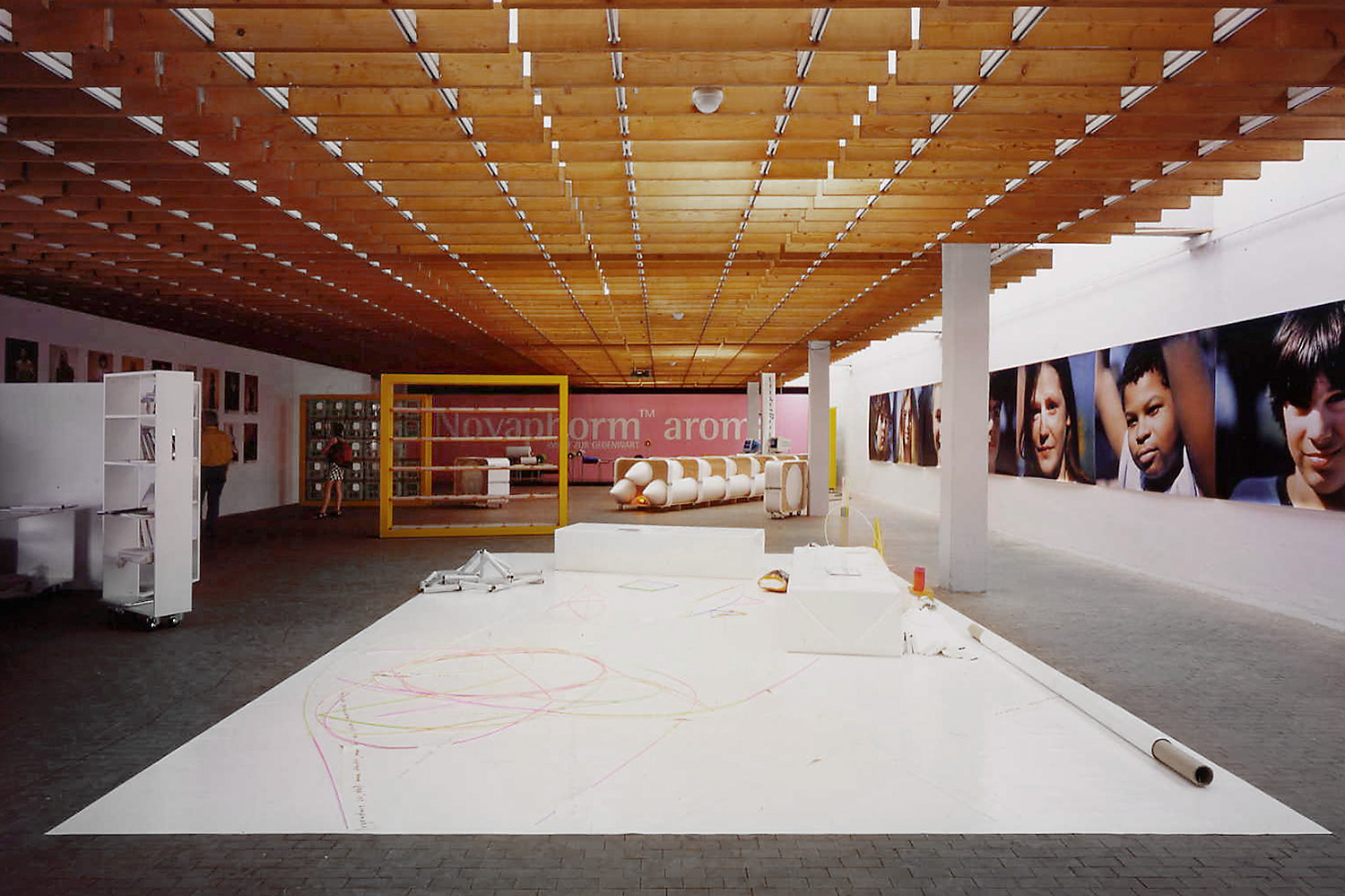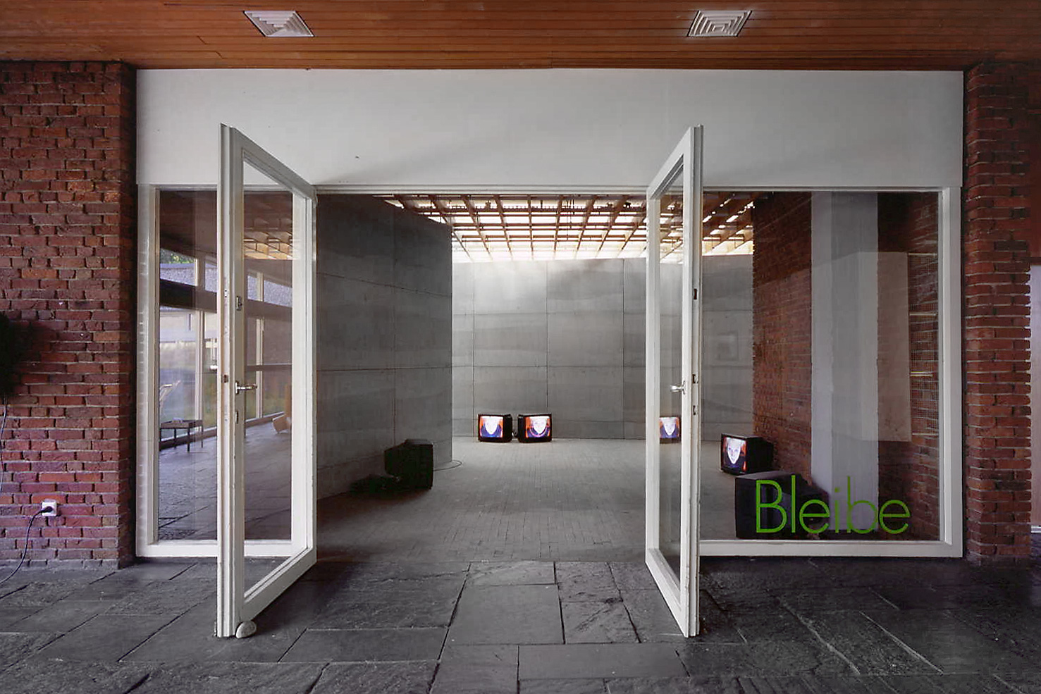 Die Ausstellung „Bleibe“ stellte sehr vielfältige Anforderungen an die Ausstellungsarchitektur. Auf einer Fläche von rund 4000 qm wurde ein sehr umfangreiches Spektrum künstlerischer Produktionen, vom Tafelbild über Tageslichtprojektionen bis hin zum Dienstleistungsangebot, präsentiert. Positionen junger Designer, die in direktem Zusammenhang mit den künstlerischen Arbeiten standen, wurden als nutzbares Mobiliar integriert. Eine für die Dauer der Ausstellung entwickelte Bar und das „guest curators office“ waren ebenfalls Teil der Konzeption.