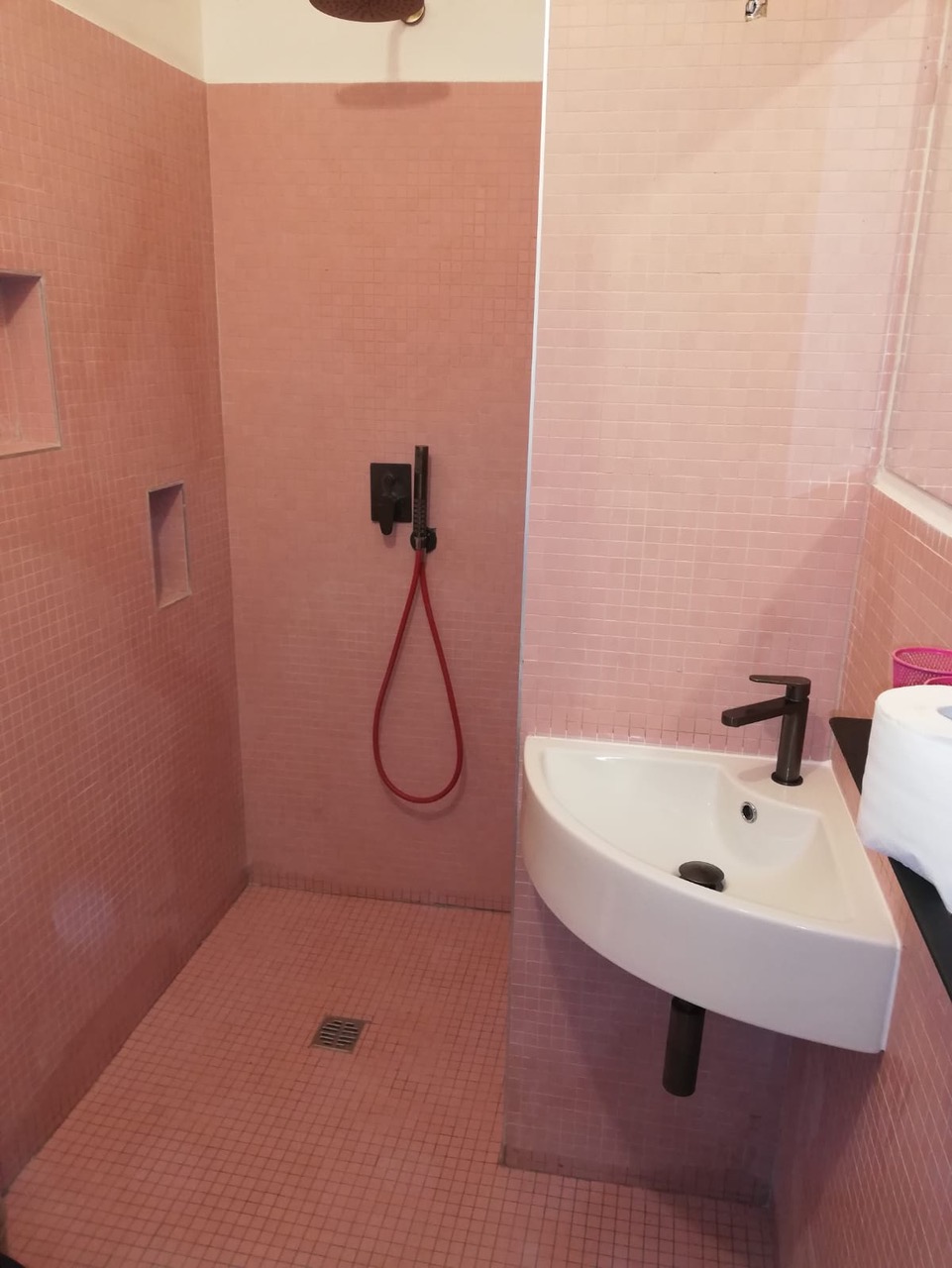 Dem Fliesenmaterial wurde besondere Aufmerksamkeit zu Teil. So bot nicht nur die traditionelle Fliesenherstellung und damit verbundene Anwendung des Materials in Bosa Inspiration sondern auch die spezielle Bauform des Turmhauses. Die Farblichkeit der Bodenfliesen gehen mit der Belichtung der einzelnen 5 Geschosse einher und sind stets im Kreuzverband mit wechselnder Farbgebung verlegt, beginnend mit schwarz-grau dominierenden Fliesen im Erdgeschoss, farblichen Applikationen im dritten Geschoss und mehrheitlich helleren Tönen im Dachgeschoss, um so Belichtung und Behaglichkeit der Räume bestmöglich herzustellen. In den Bädern finden sich im Kontrast kräftige und leuchtende Farben in Form von ebenso traditionellen Mosaikfliesen an Wand und Boden wieder.