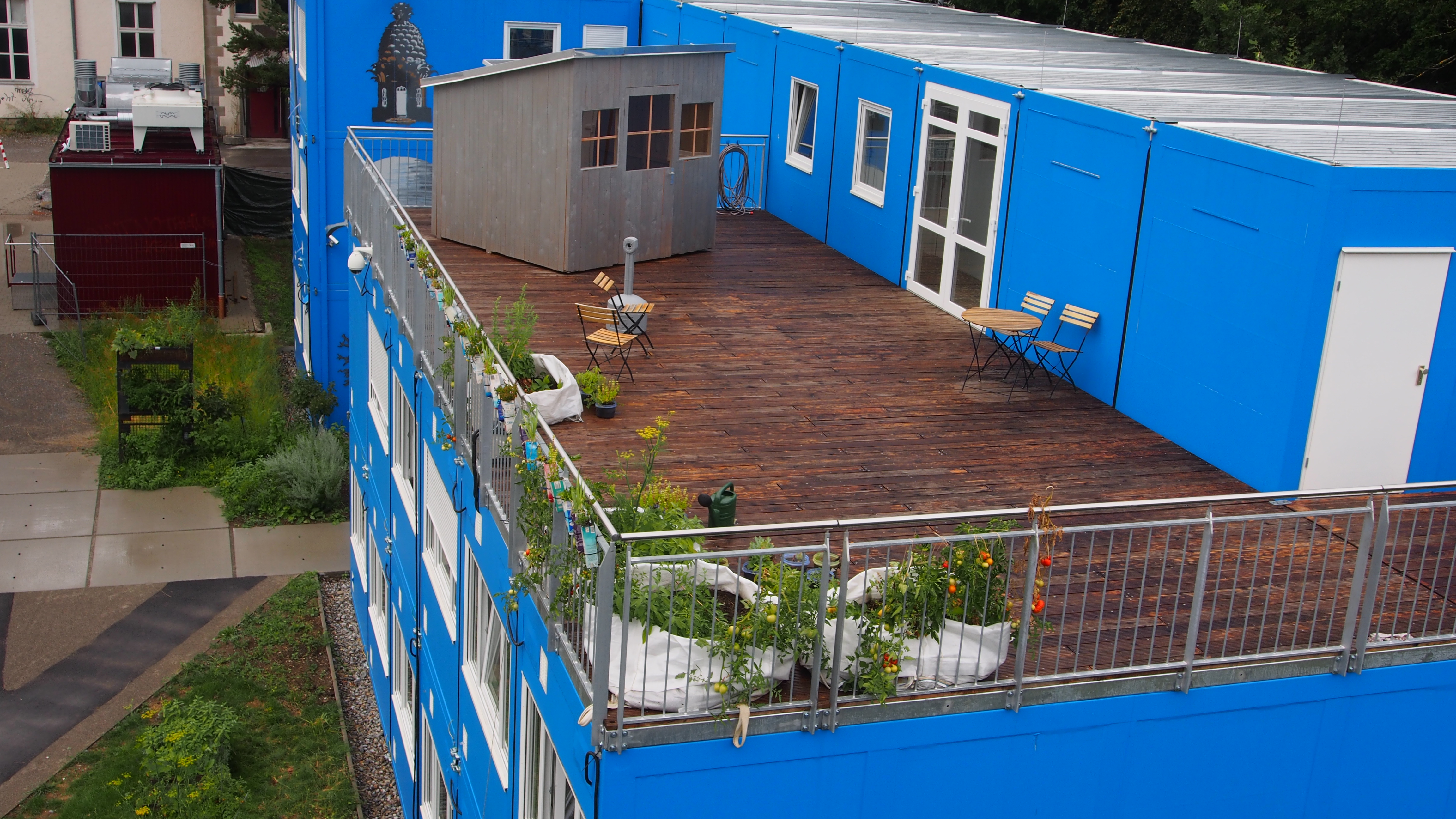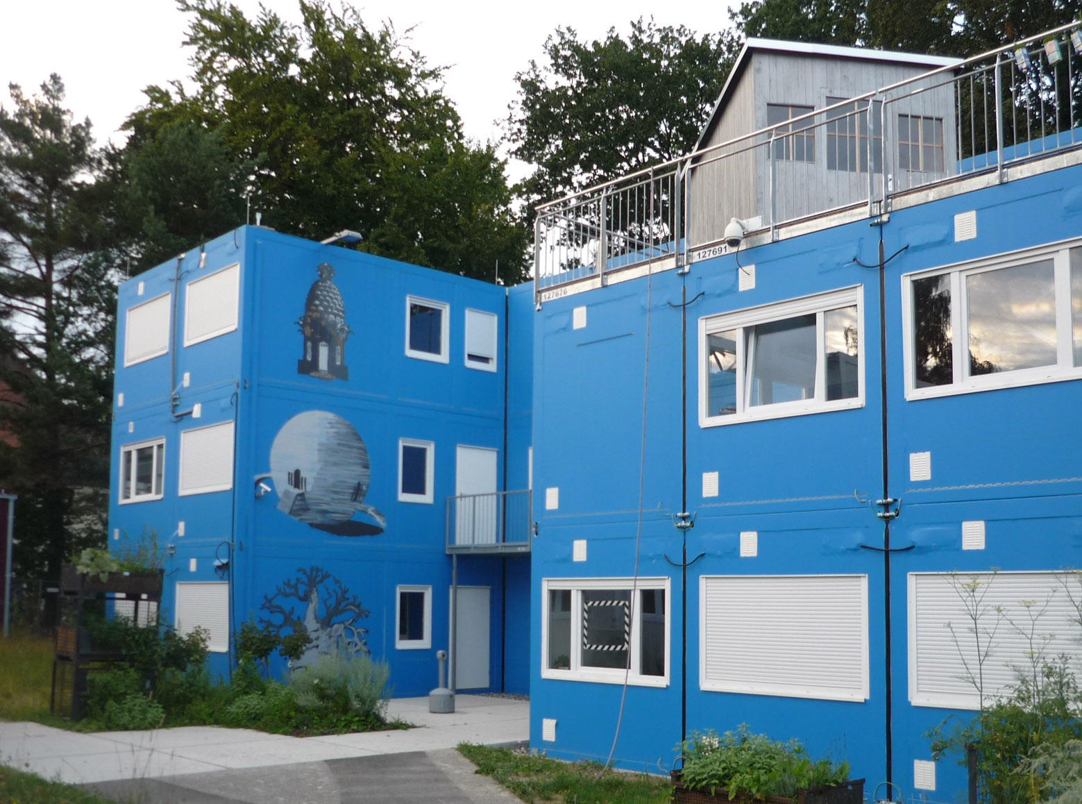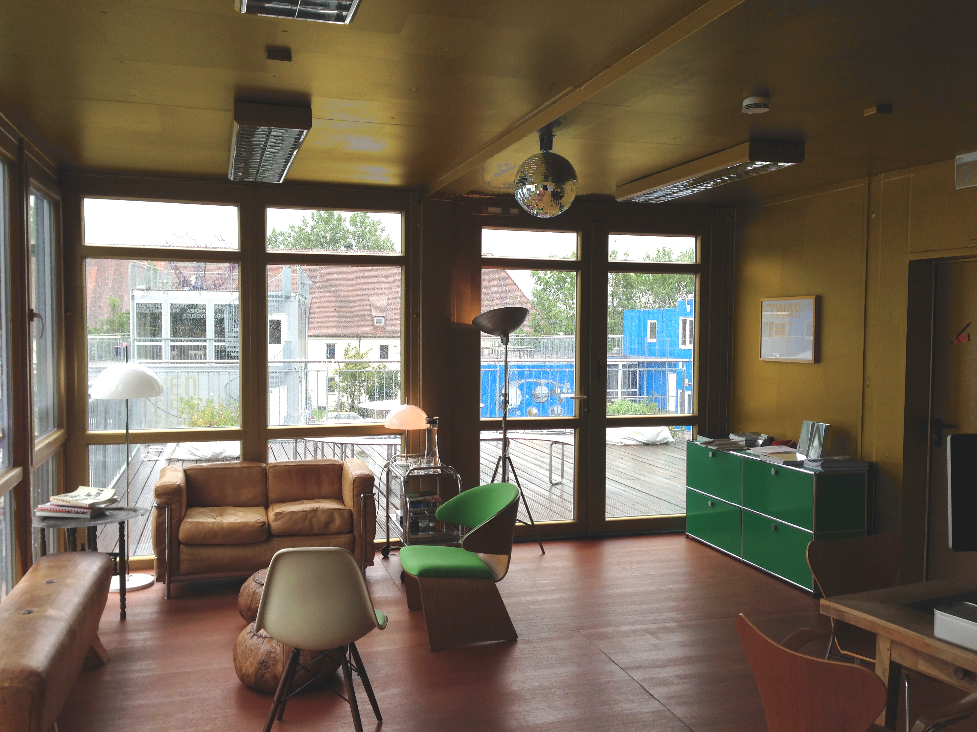 „Auf diese Art ist eine, zum restlichen Fallenbrunnen in seiner ursprünglichen Form als Kaserne eher introvertiert daherkommenden Struktur, sehr offene und sich dem Umfeld darbietende Architektur von Fertigbauteilen entstanden. Die besitzt eine weit höhere Qualität, als das Bauteil Container zunächst vermuten ließe.“
