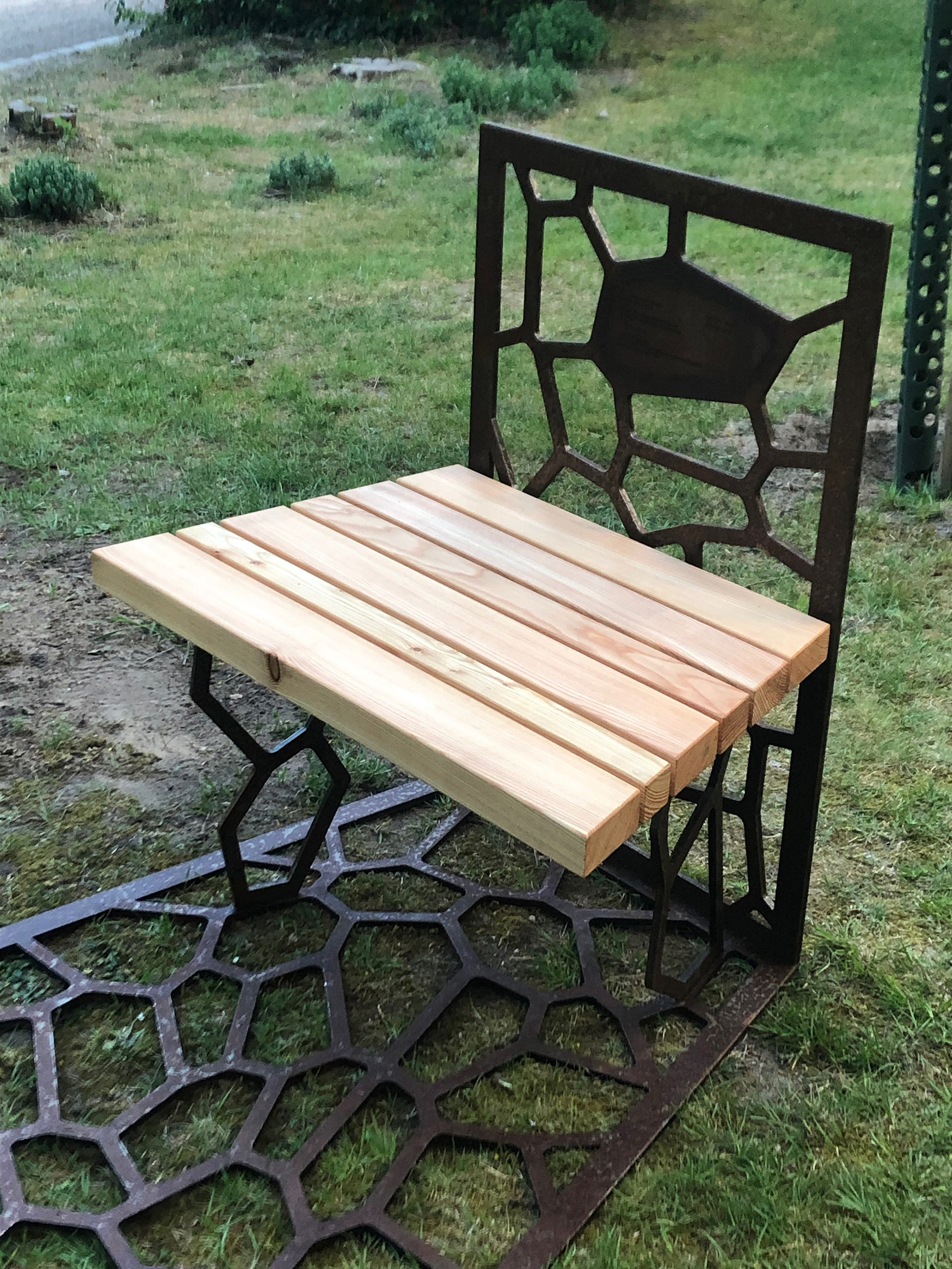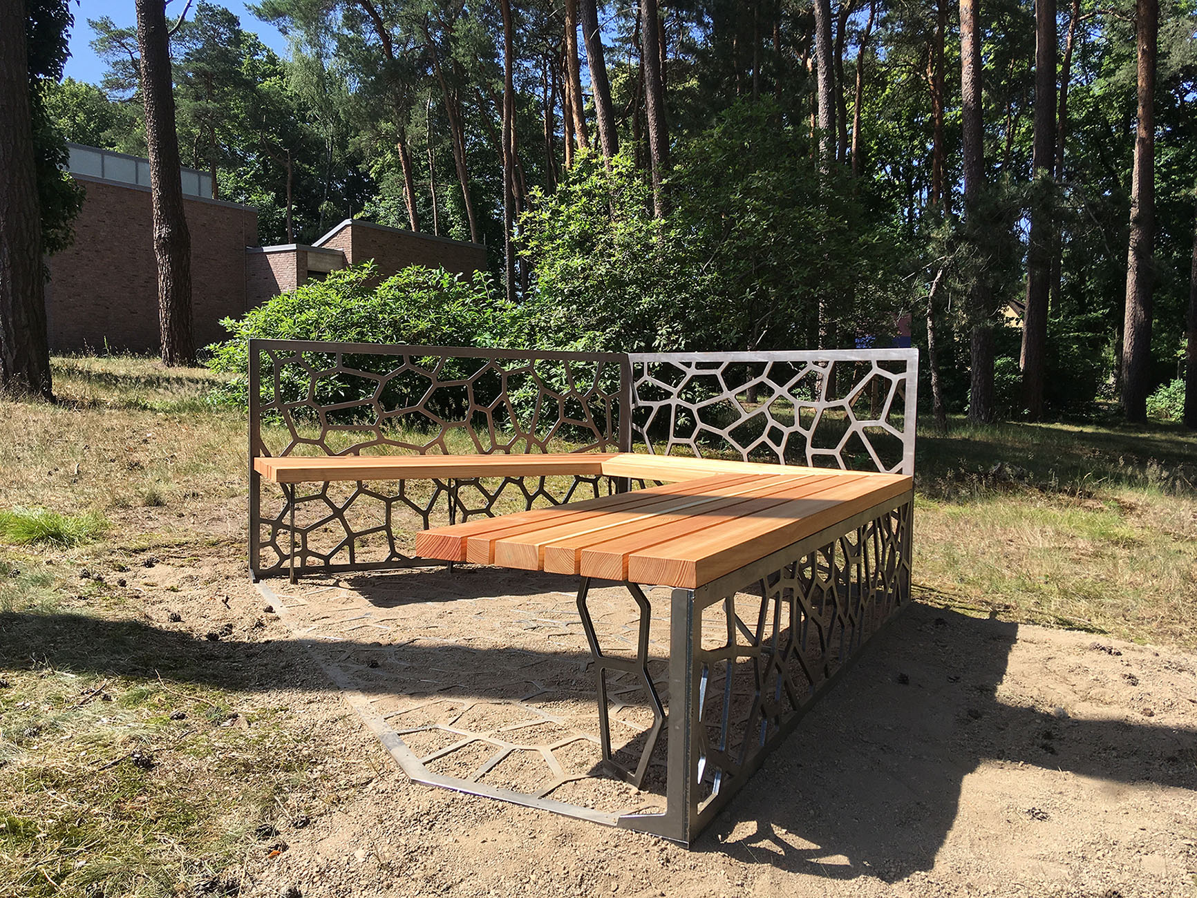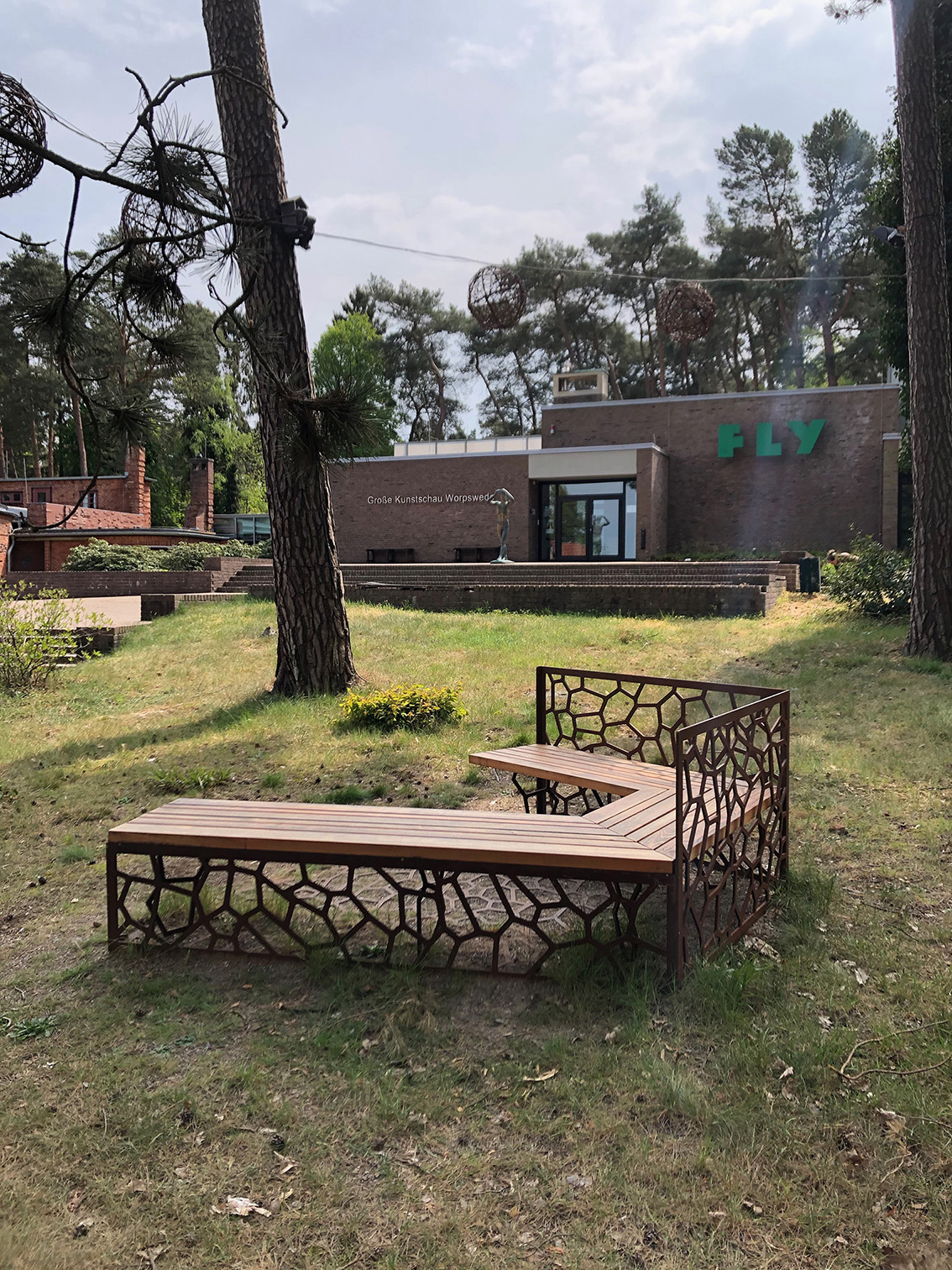 Gelaserter Schwarzstahl bildet die zelluläre Tragstruktur, eine Referenz an die vegetativen Formen des Jugendstils und geölte Lärche bildet die Sitzflächen. Weitere Bänke werden folgen und im Ortsbild von Worpswede kleine Akzente setzen !