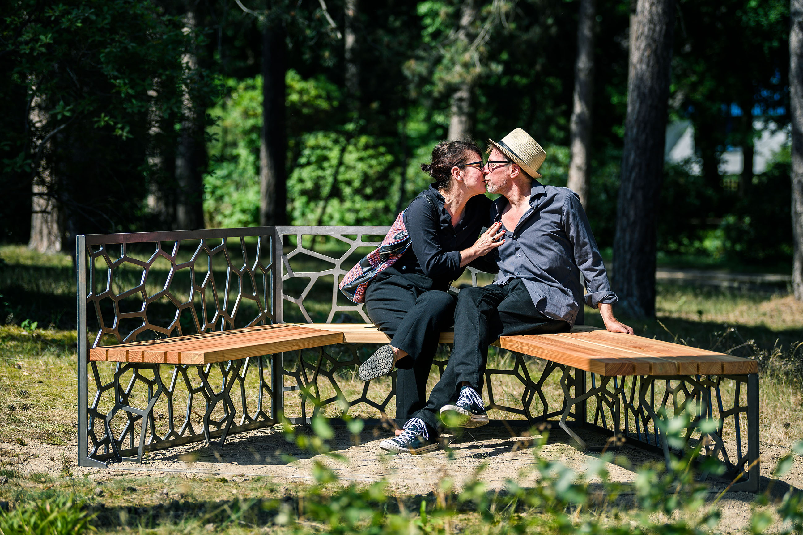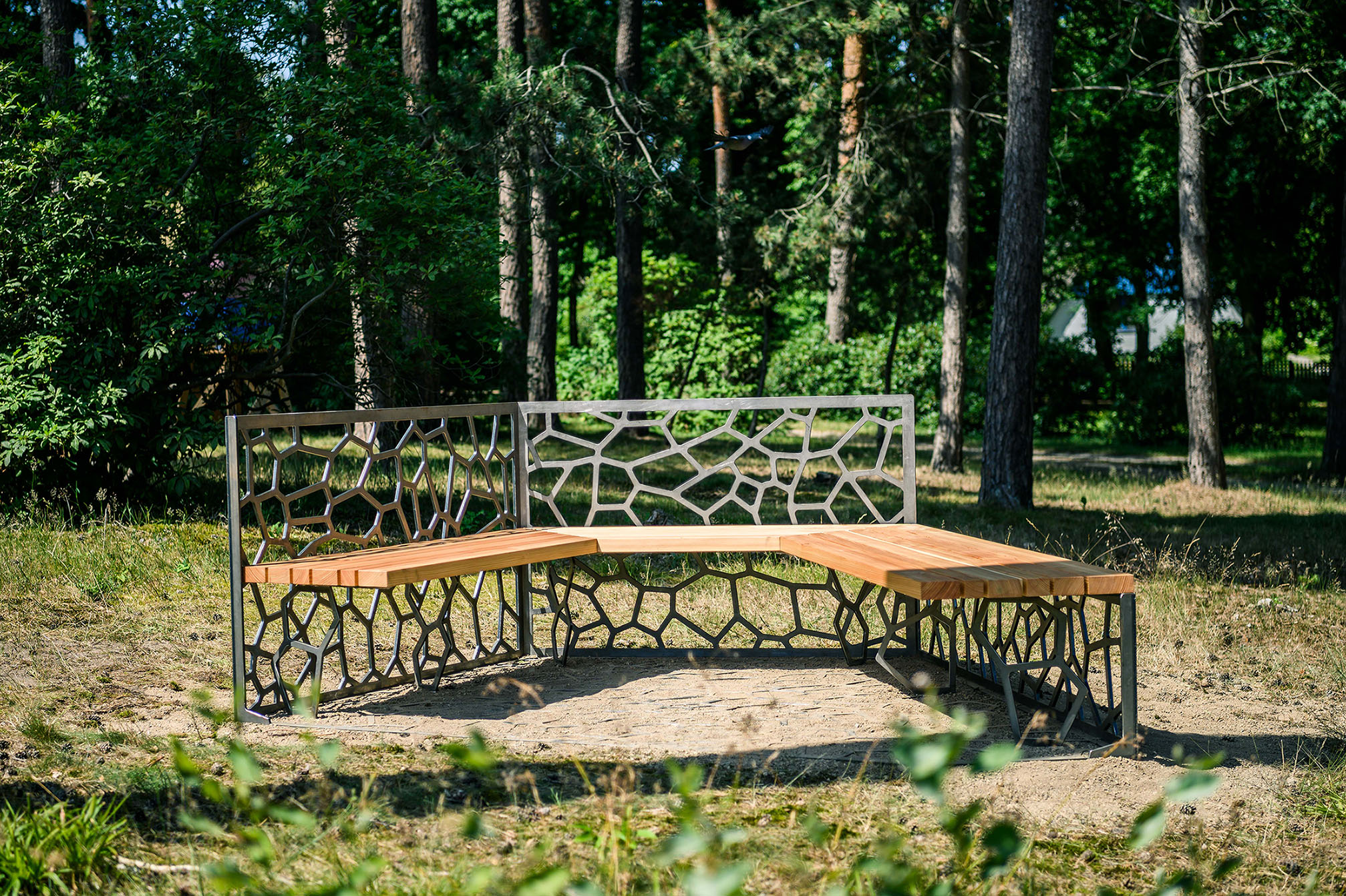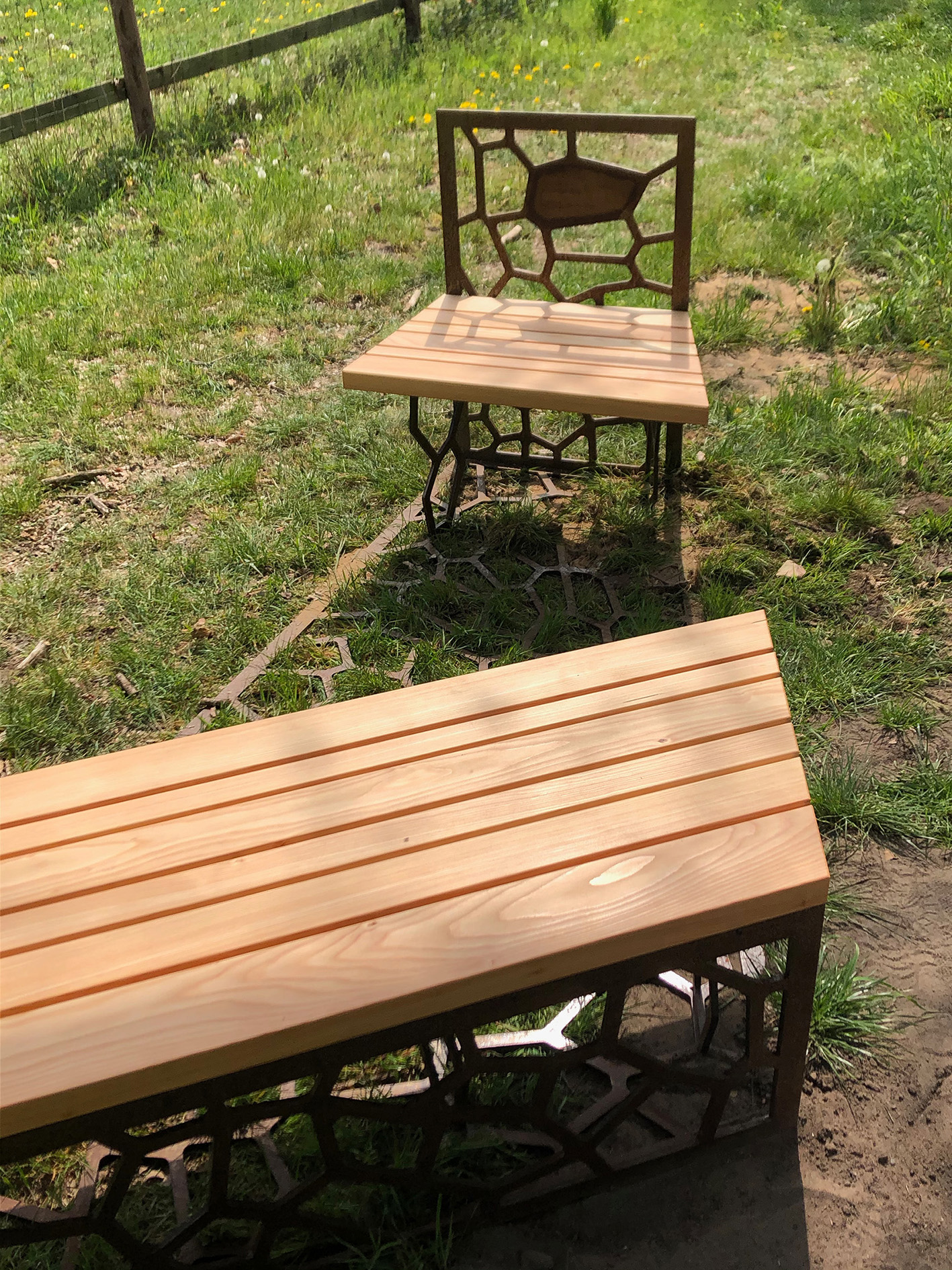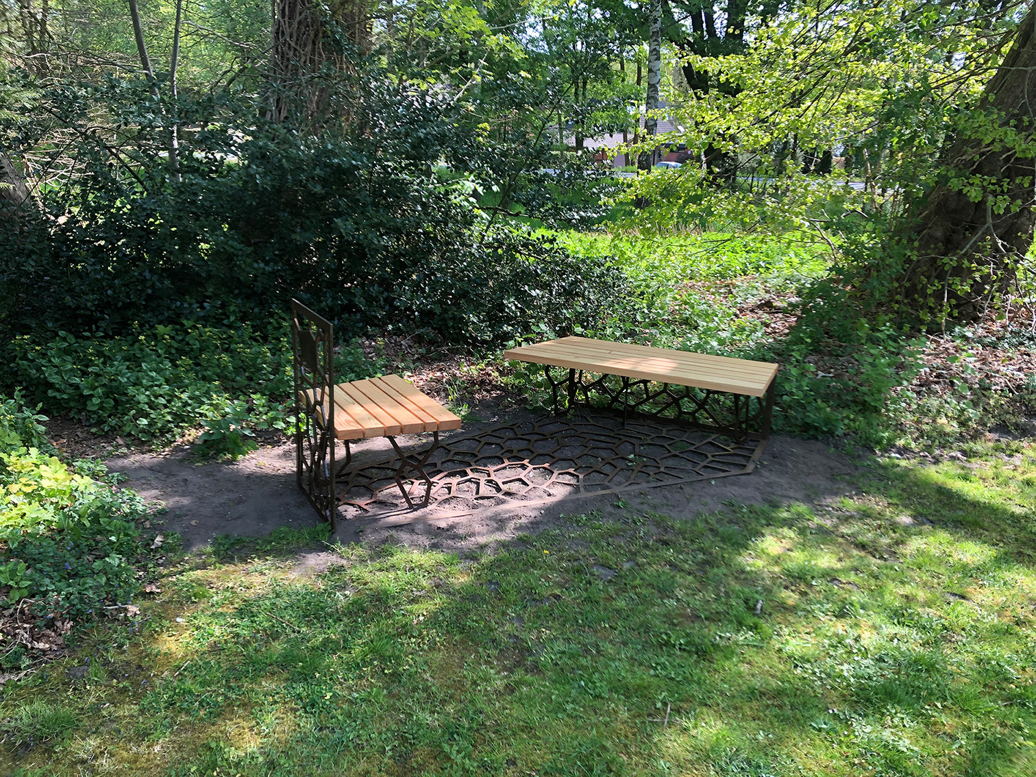Gelaserter Schwarzstahl bildet die zelluläre Tragstruktur, eine Referenz an die vegetativen Formen des Jugendstils und geölte Lärche bildet die Sitzflächen. Weitere Bänke werden folgen und im Ortsbild von Worpswede kleine Akzente setzen !