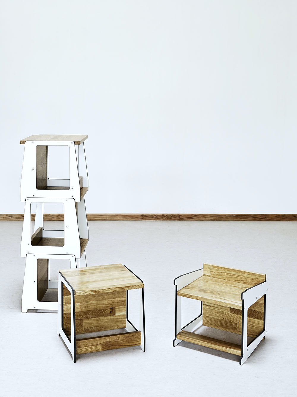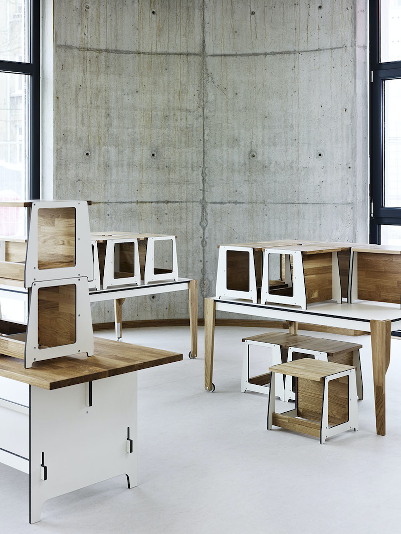 Hocker und Tische entworfen für den Buchkindergarten Mobiliar Hocker Kinderstuhl Ablage zum Drehen zum Stapeln Esstisch Schreibtisch mit Rollen..