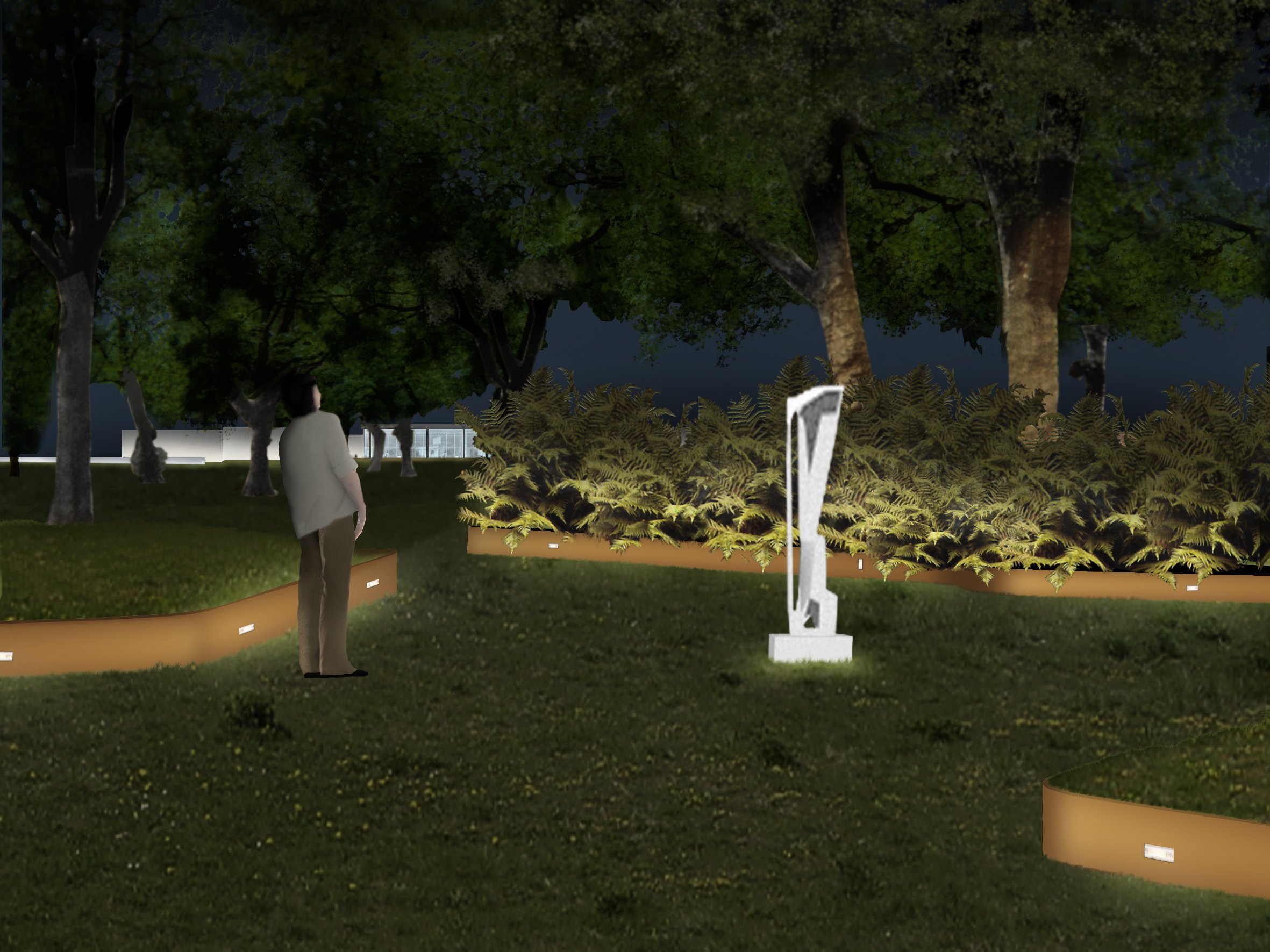 Das dominanteste Gestaltungselement sind die sogenannten Cluster. Diese bilden mit COR-TEN-Stahl eingefaßte Gehölz- und Staudenflächen, die sich unter bestehenden Baumgruppen situieren. Diese Inseln schaffen Frei-Räume für die Bürger und Kunst-Räume für Skulpturen, die so ein nur auf sich bezogenes Umfeld erhalten, ohne singulär ausgestellt zu werden.