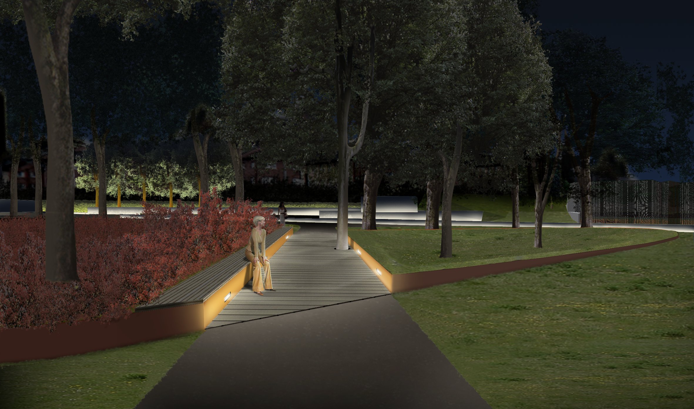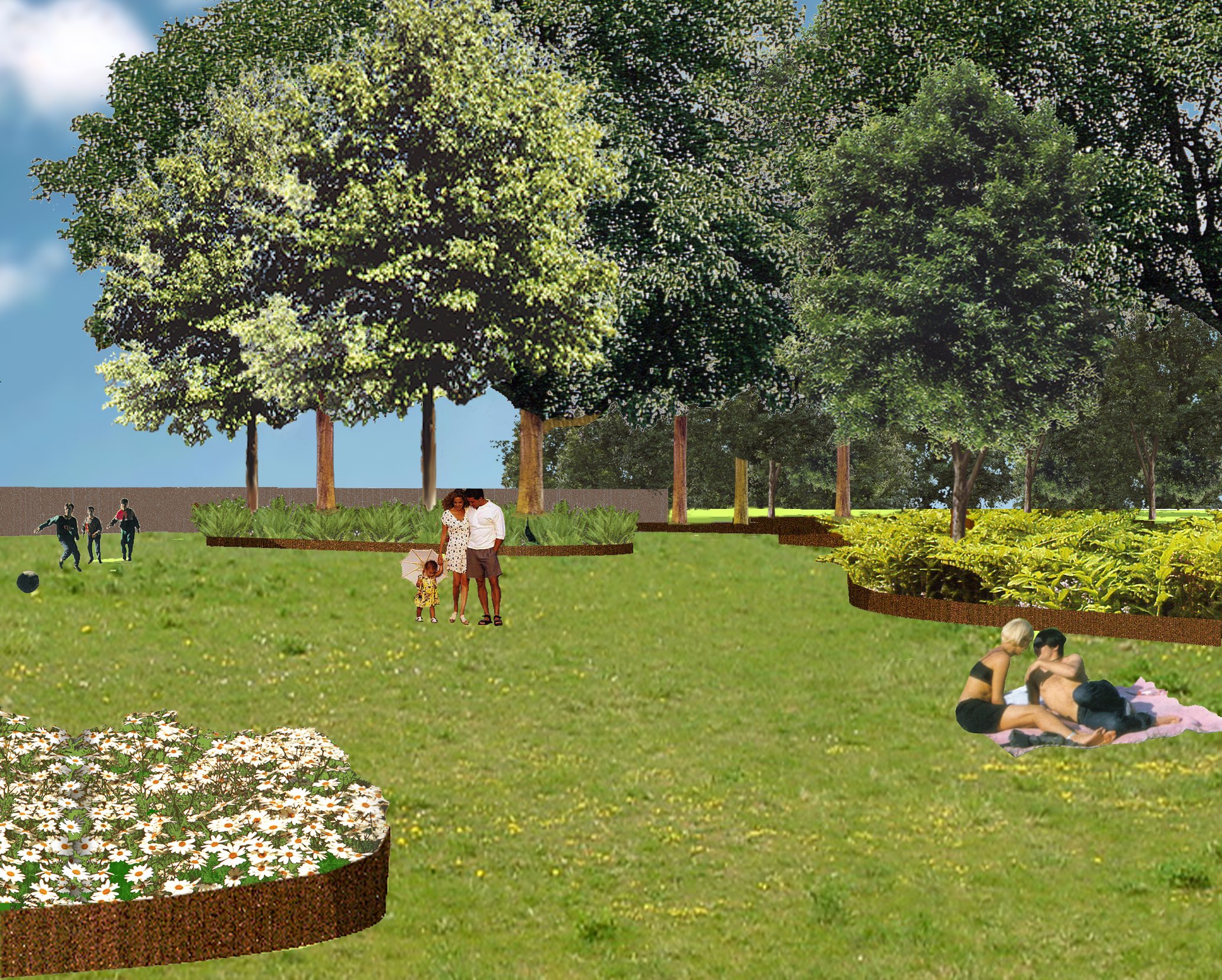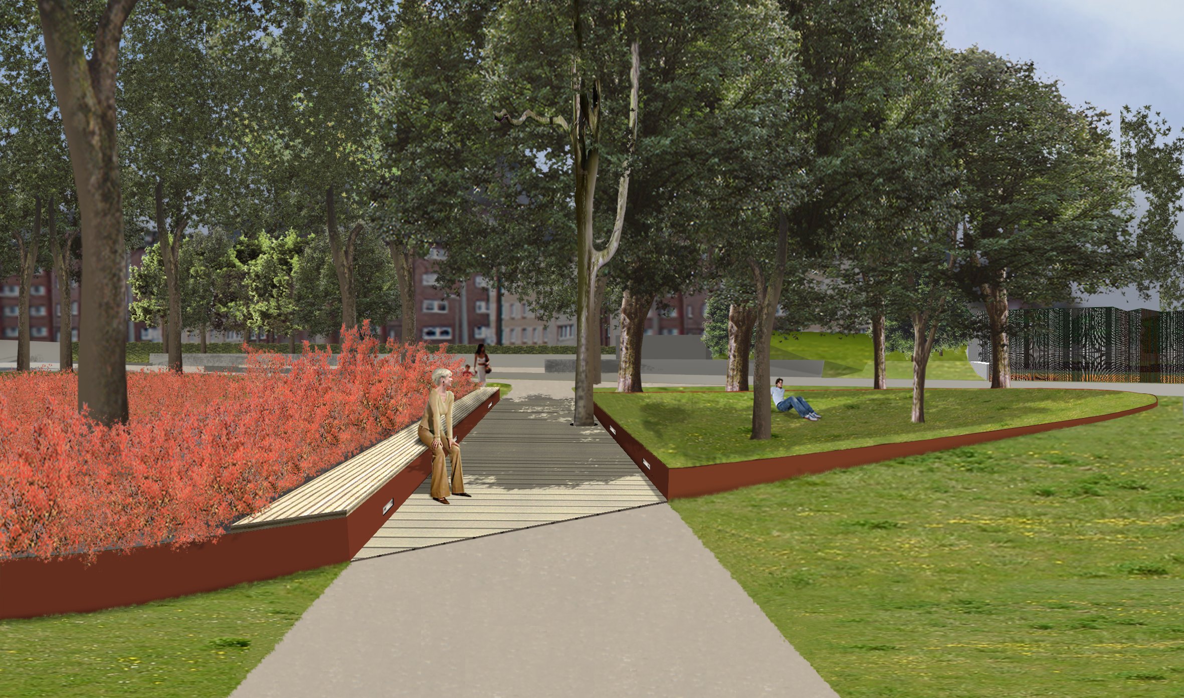 Zu den grundlegenden Maßnahmen gehören die Entfernung aller kranken und windbruchgefährdeten Bäume und die Neuordnung der Wege mit Ausbildung von kleinen Plätzen an den Wegekreuzungen. Der Rand des Parks wird durch Auslichtung transparenter zu seiner Umgebung gestaltet. Zwei Spangen bleiben als Aufenthaltsbereiche mit festgeschriebener Nutzung erhalten, werden aufgewertet und modernisiert. Um den Park zur Innenstadt zu öffnen, ist die Entwicklung eines ‘Diffusionsbereichs’ entlang der Friedrich-Wilhelm-Straße geplant. Großzügige Plattenformate befestigen dieses Areal, einzelne Stellen zeigen schon das Grün des Parks oder laden als Bänke zum Sitzen ein. Es entsteht eine städtisch geprägte Esplanade, die als Treffpunkt und Verweilraum unter Bäumen, als wichtige Fußgängerverbindung zwischen Bahnhof und Innenstadt und als Übergang zwischen Stadt und Park fungiert.