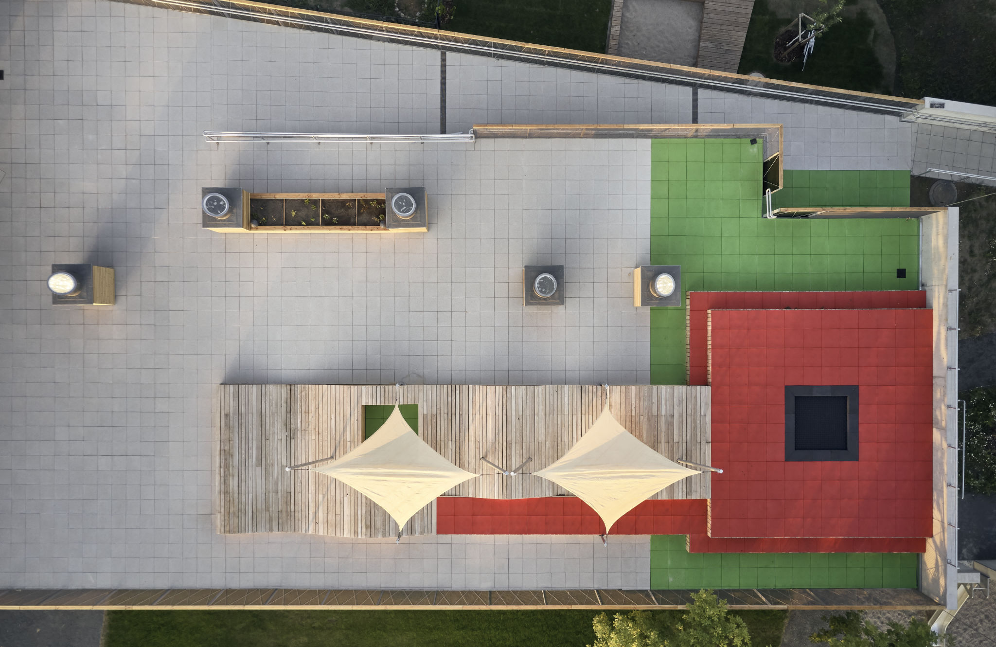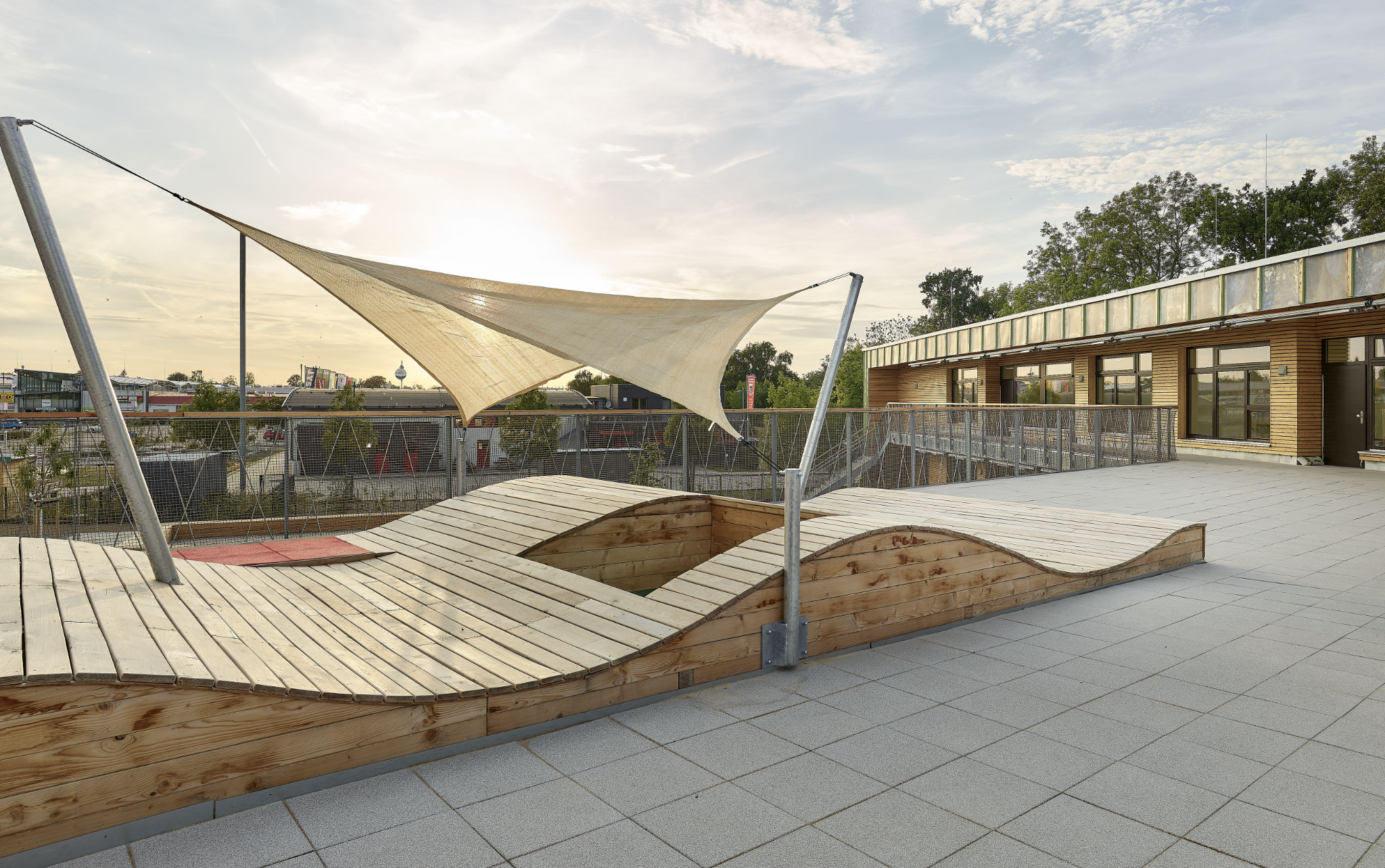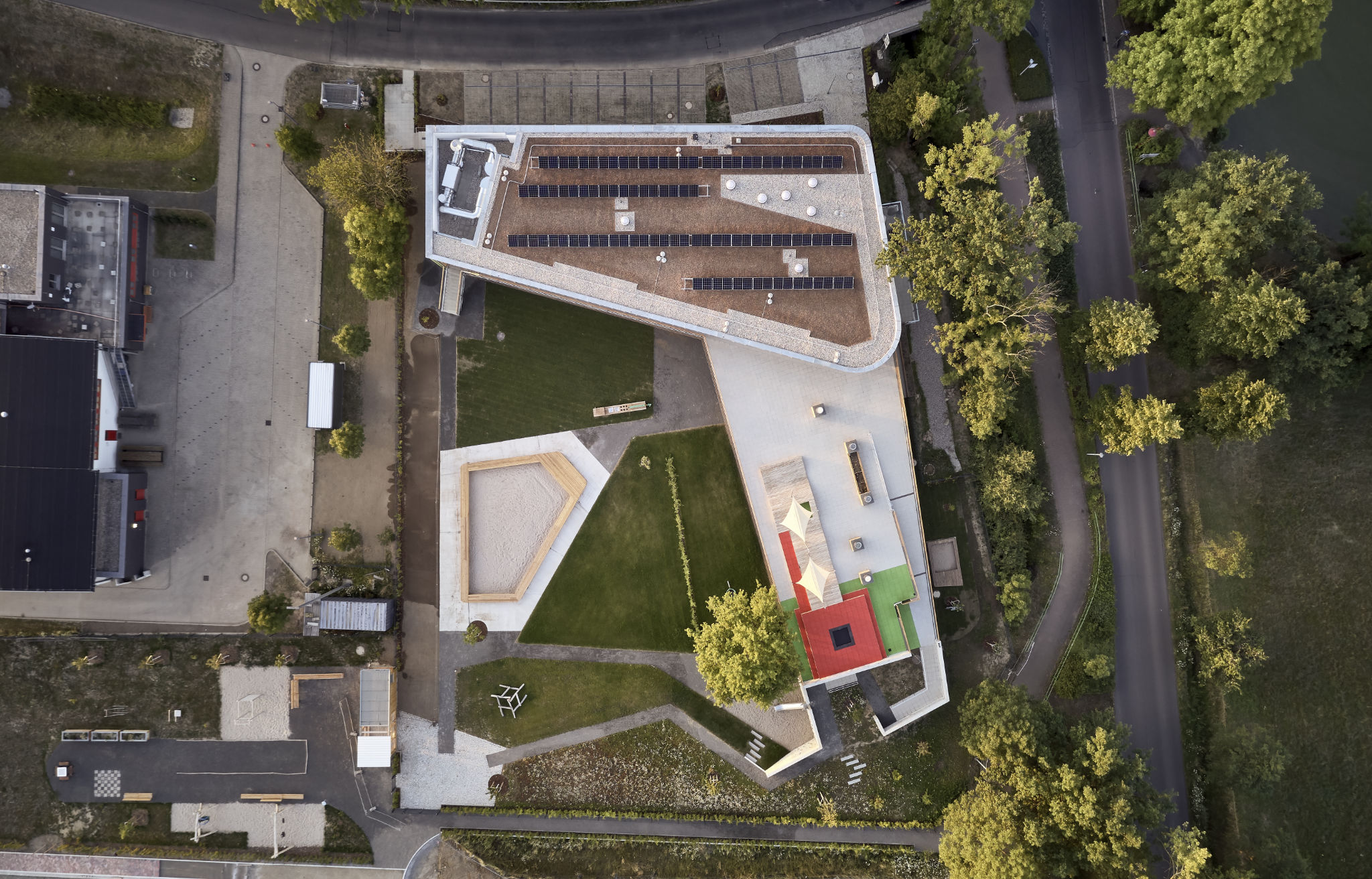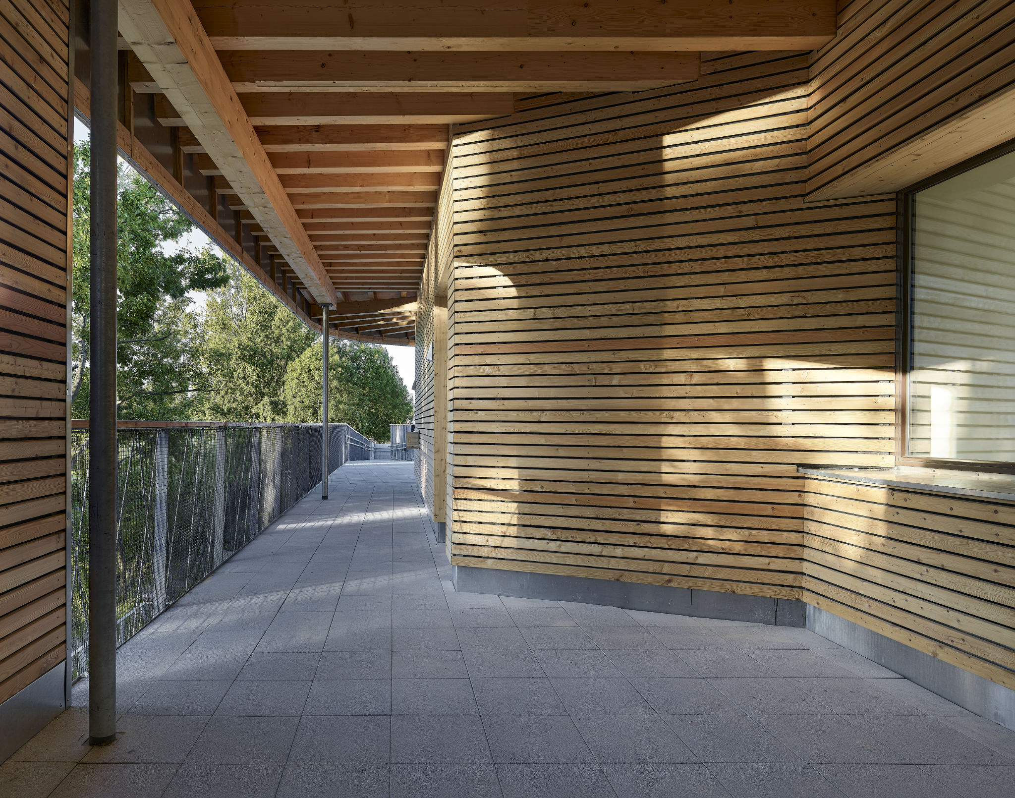 Hölzern ausgekleidete Unterschnitte legen die Gruppenräume als Gartenfassade frei. Aus der Straßenfassade entwickelt sich entlang der Freispielflächen eine kaftvolle Attikageste, die die zwei Gebäudeflügel und ihre Verschneidung nachzeichnet, um dann wieder Fassade zu werden. Hier umspielen sich verschiedene Raster und Fensteröffnungen, Holzlatten treten als Gliederungselemente hervor und bilden Fächer für Edelstahlscharen mit farbigen Aufkantungen.