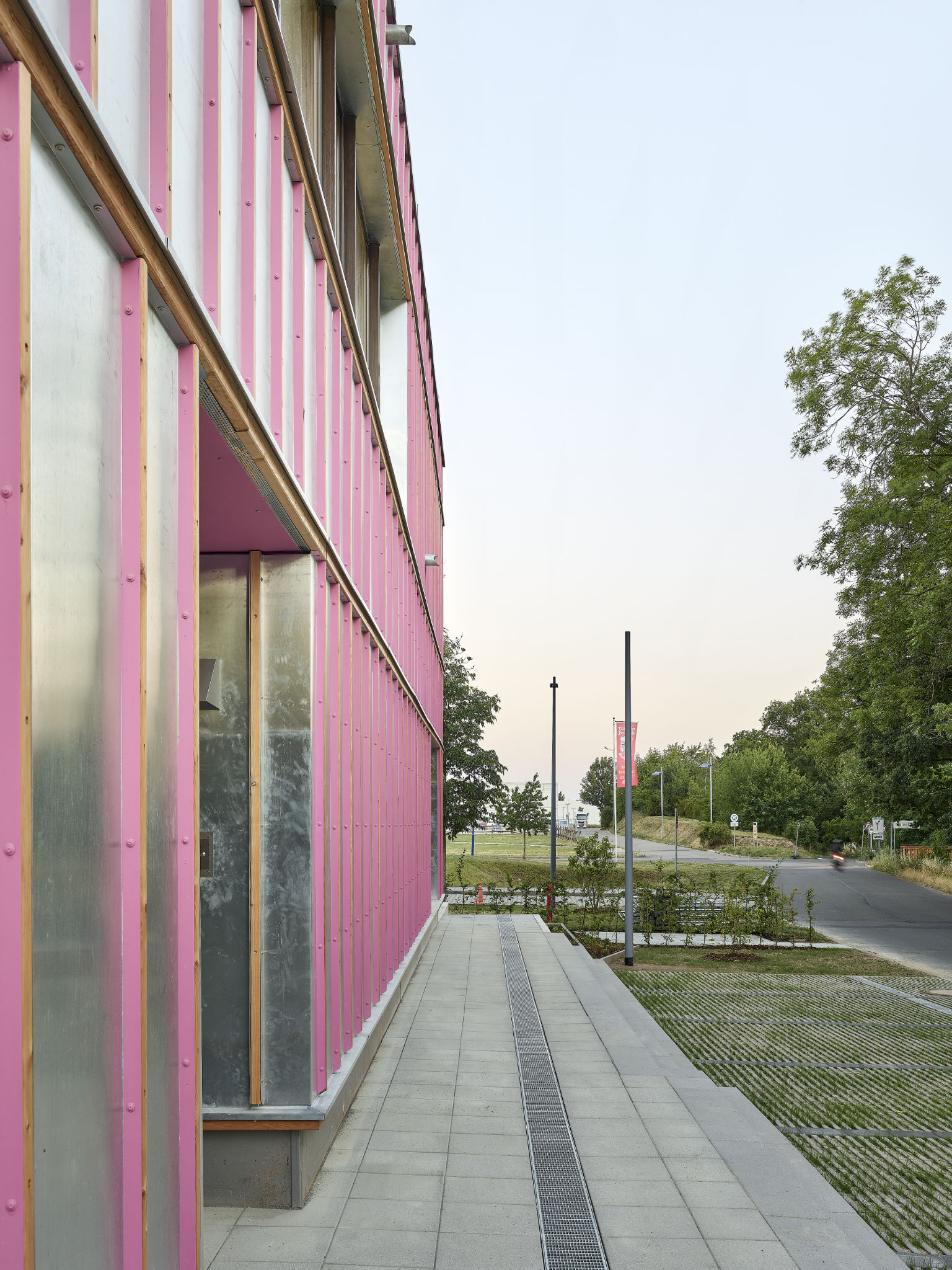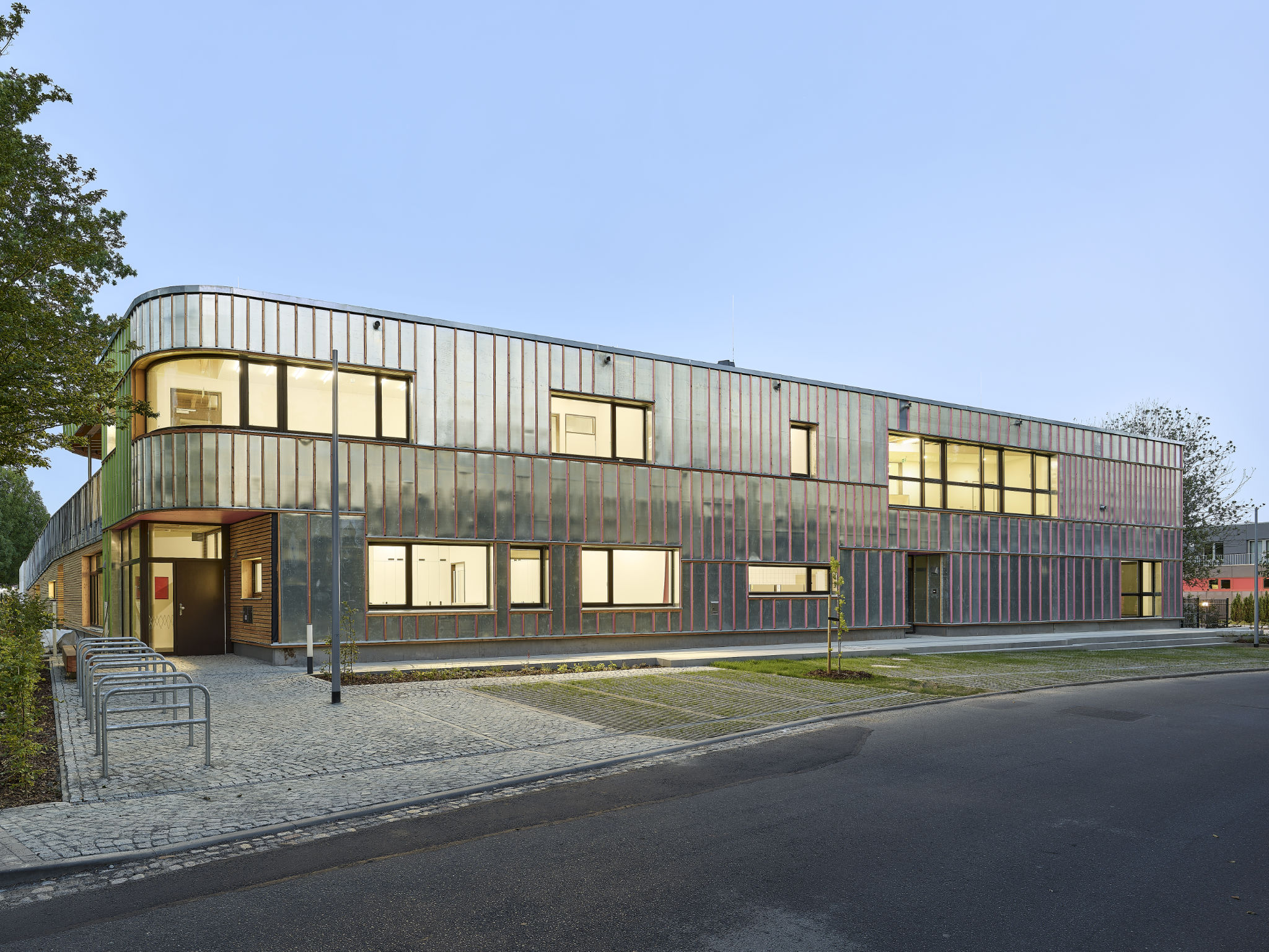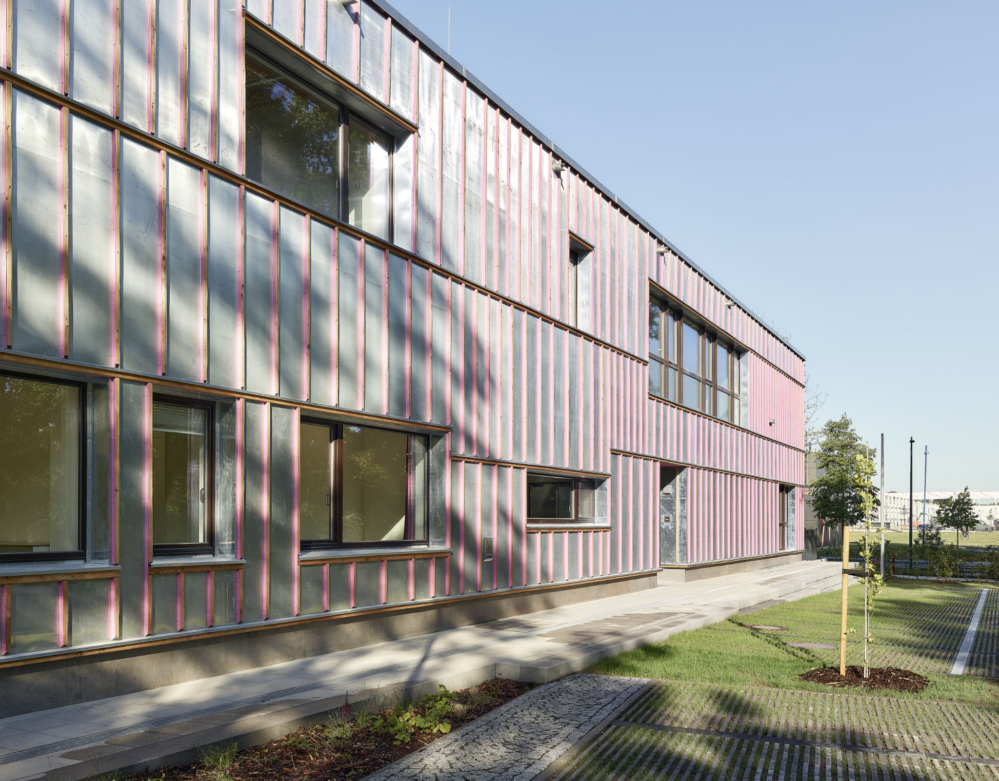 Die Kita ist Bindeglied zwischen gewachsenem Ortskern im Norden und dem zukünftigen Mehrgenerationenpark im Süden. In seiner gewinkelten Grundform geleitet das Haus die Besucher*innen auf ihren Wegen zum Eingang – und erwidert deren Bewegung. Im Wechsel der Blickwinkel schimmert das Haus mal metallisch, mal grün, mal pink. Lässt sich nicht festlegen auf eine architektonische Miene. Verwandelt sich als Reaktion auf seine Wahrnehmung. Kokettiert mit dem Unerwarteten. Gutes Kind.