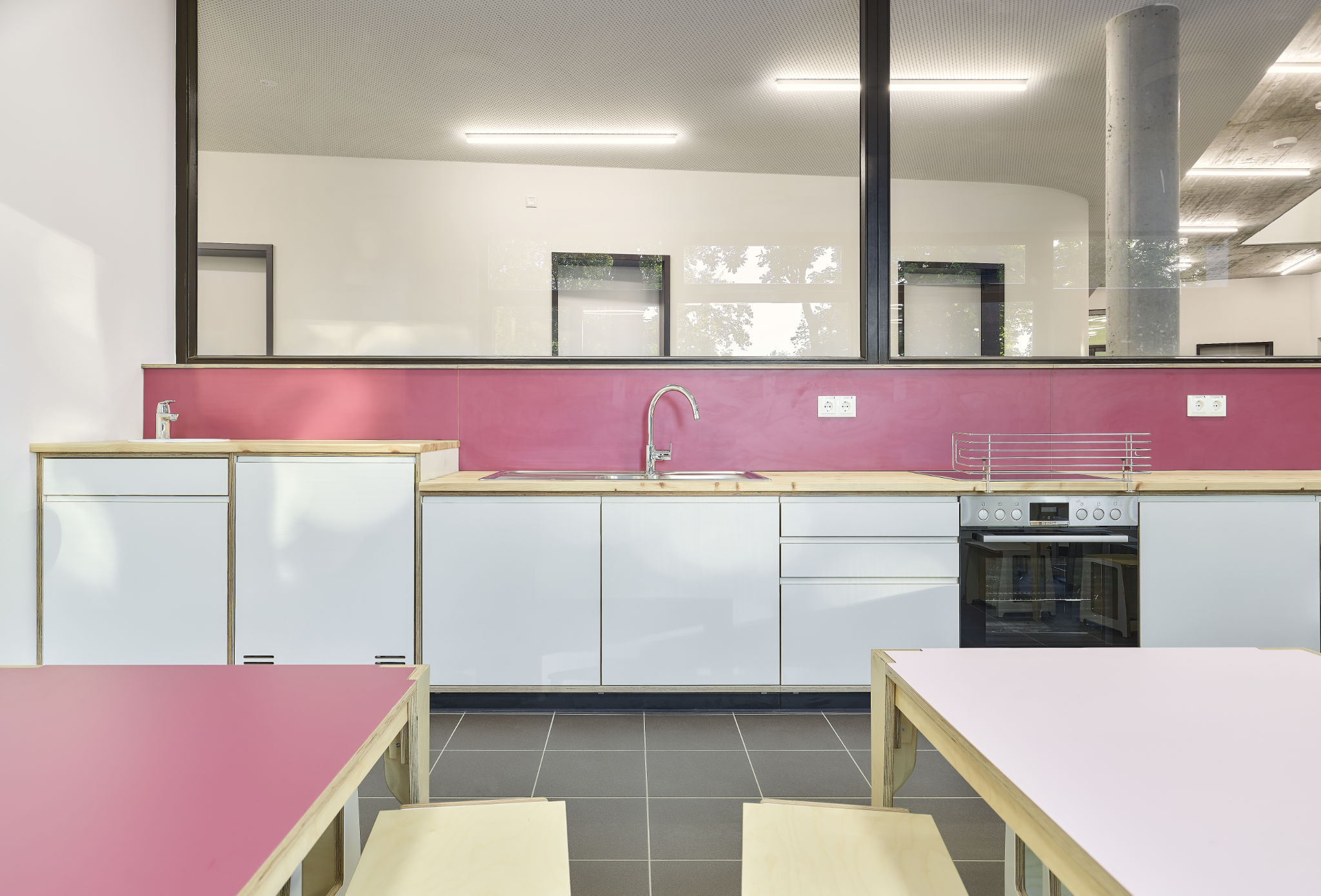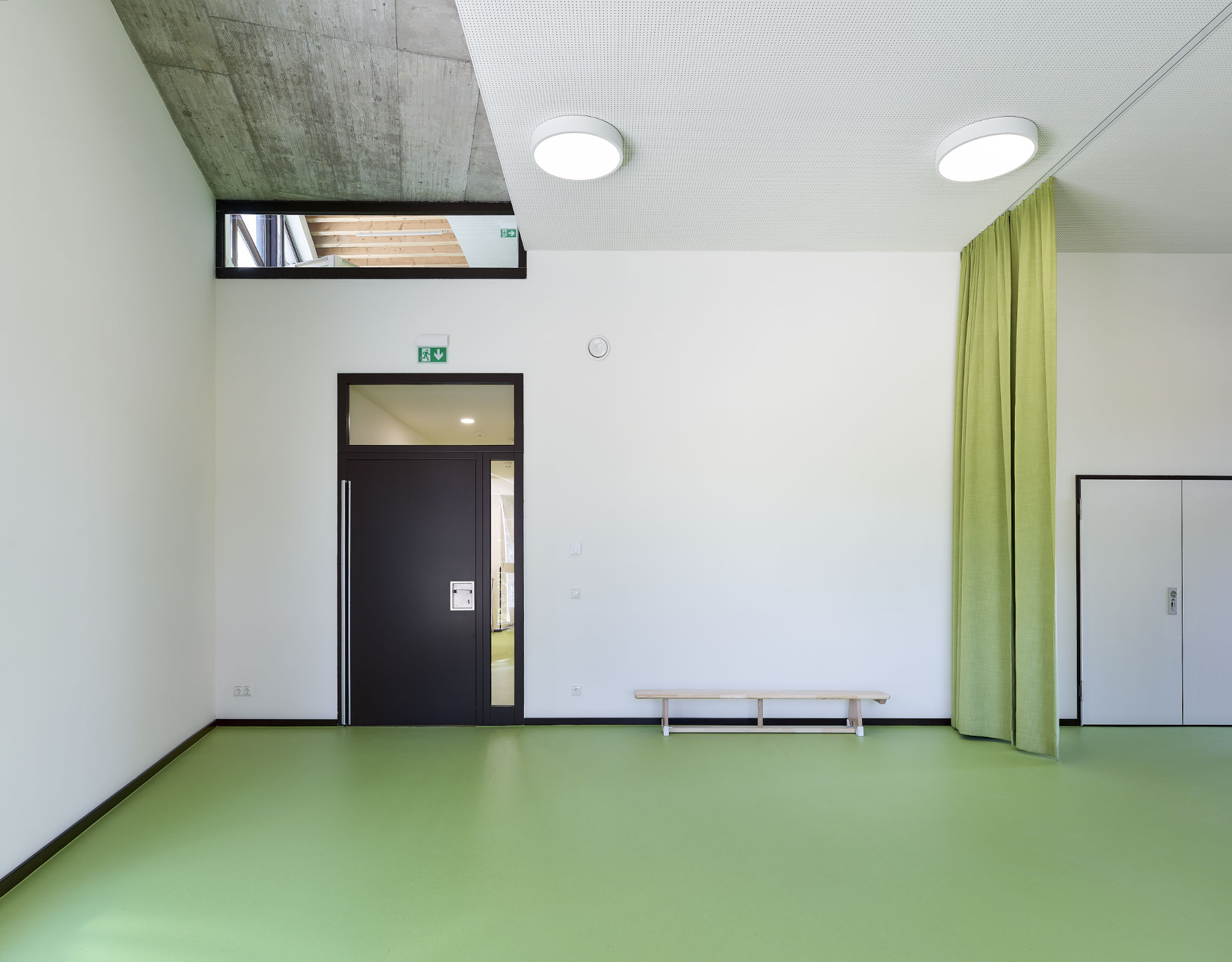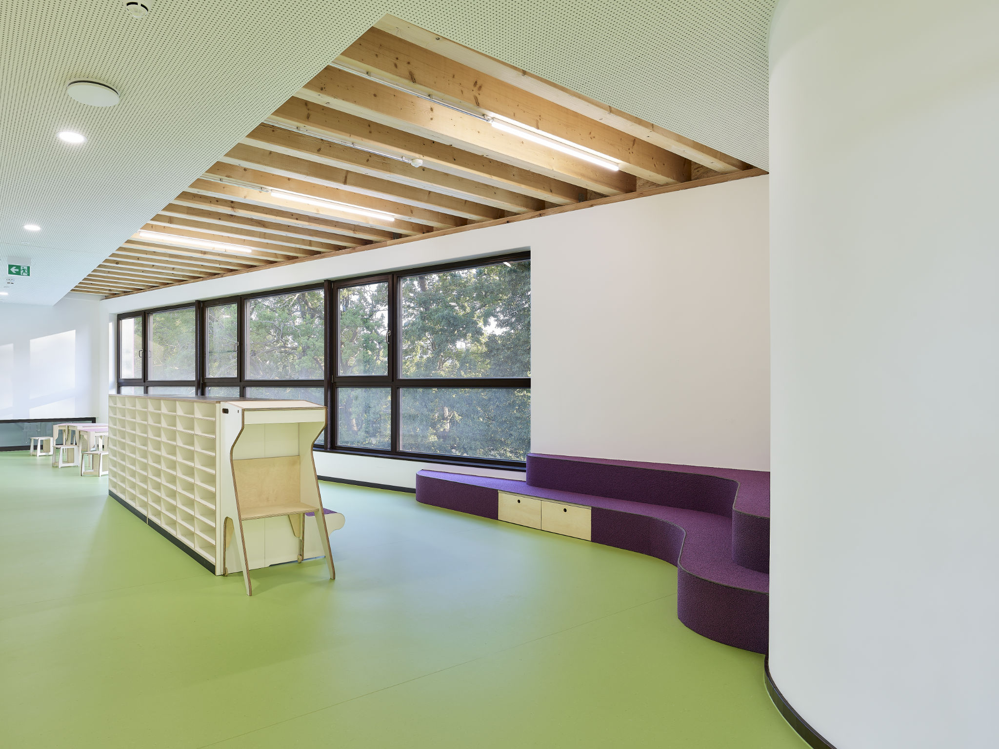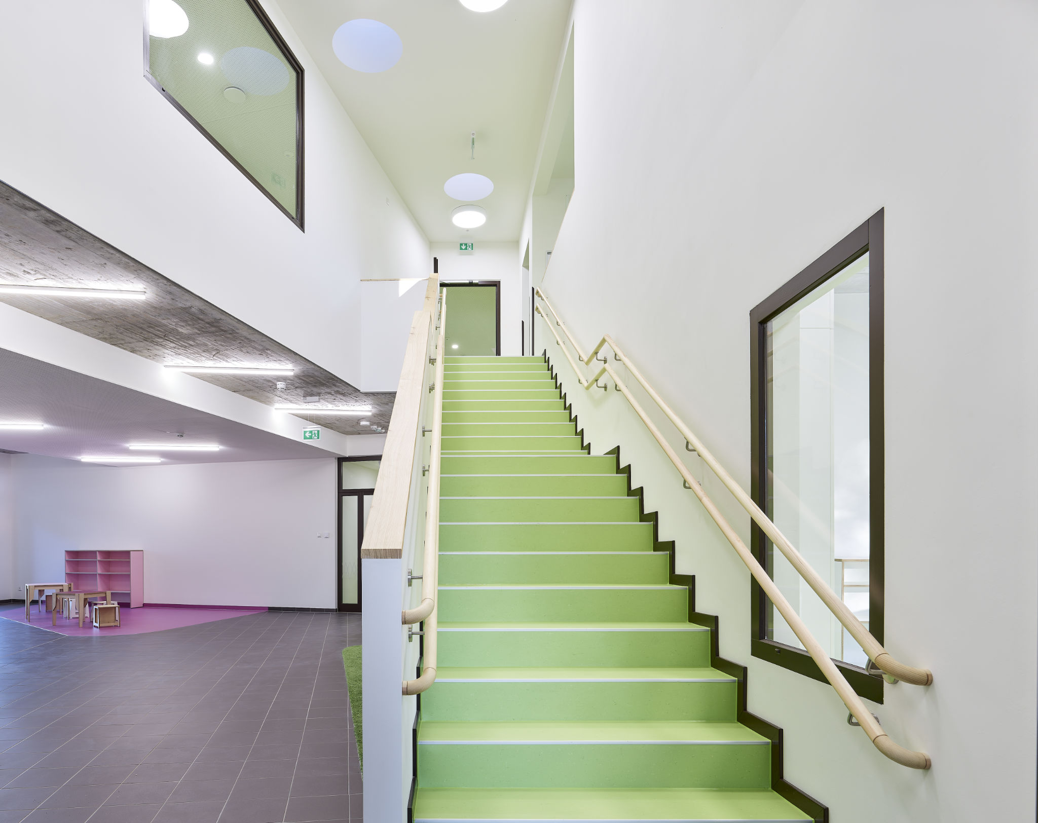 Es wurde besonderer Wert darauf gelegt, Integrationsplätze in allen Gruppenräumen aller Altersgruppen zu ermöglichen und eine altersübergreifende Durchmischung und Kommunikation zu fördern. Wie im Foyer sind auch im Spielflur vor den Gruppenräumen Projektinseln vorgesehen, die als Treffpunkt, Kommunikationsraum und Spielfläche dienen.