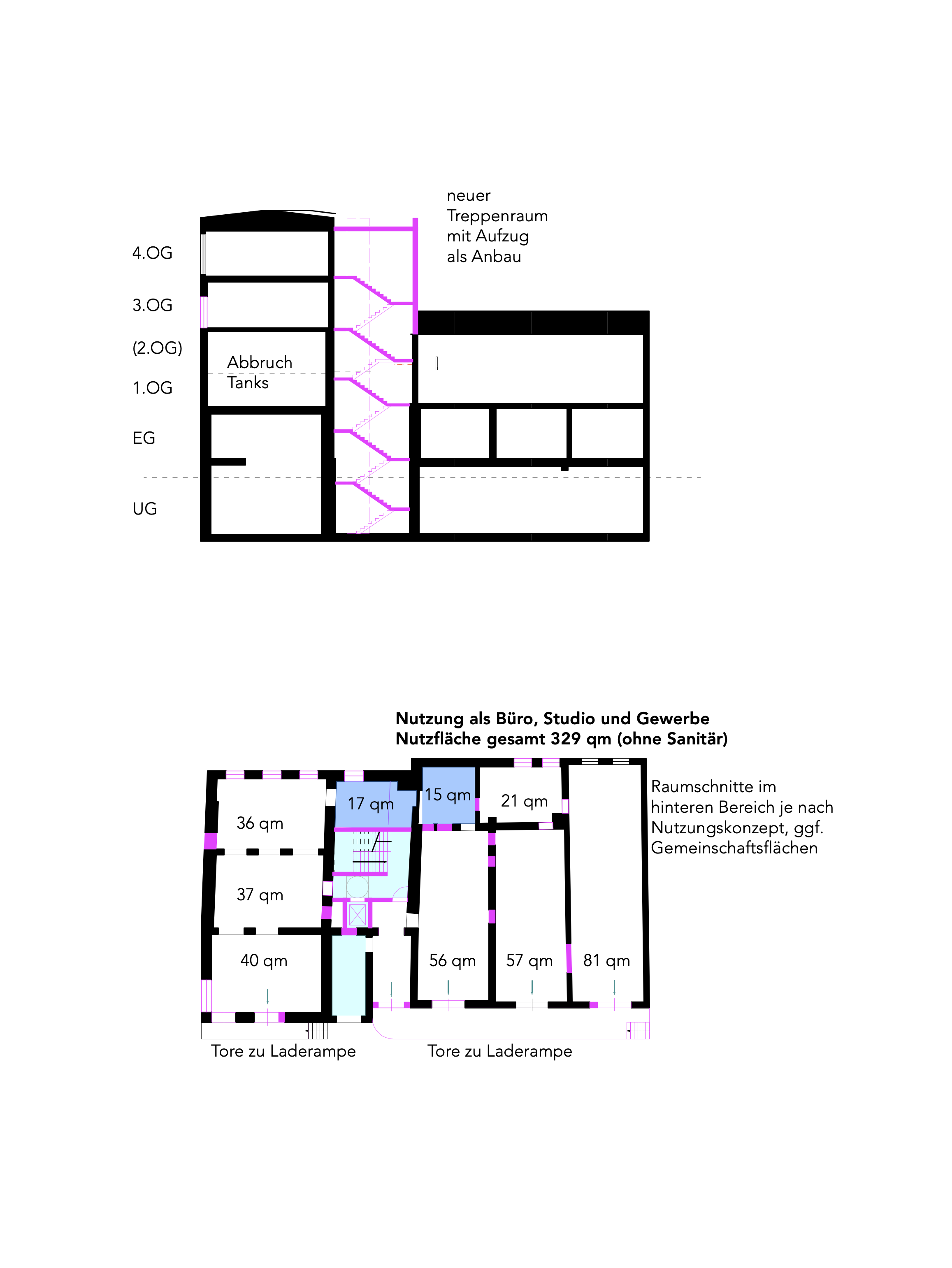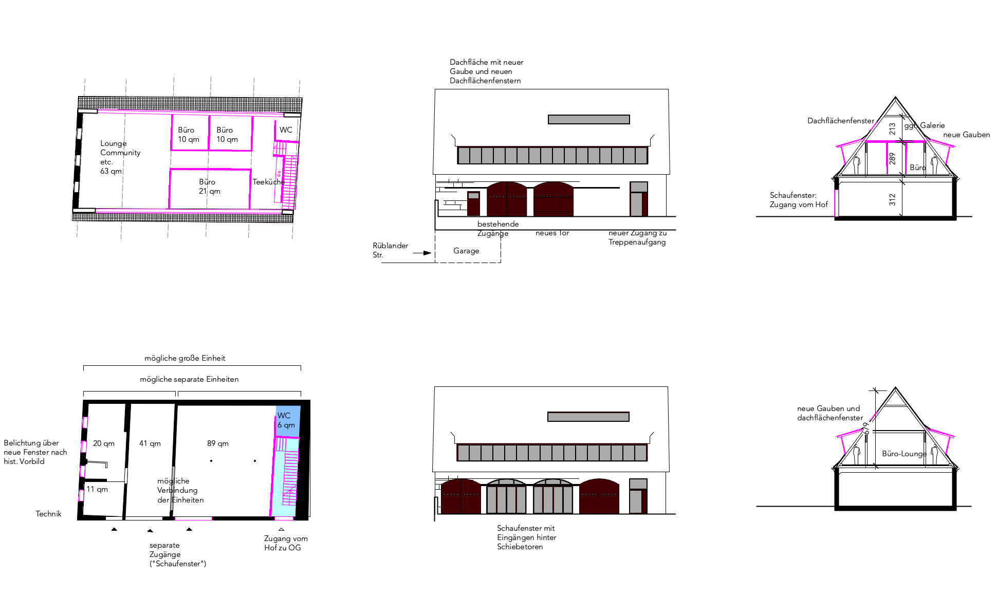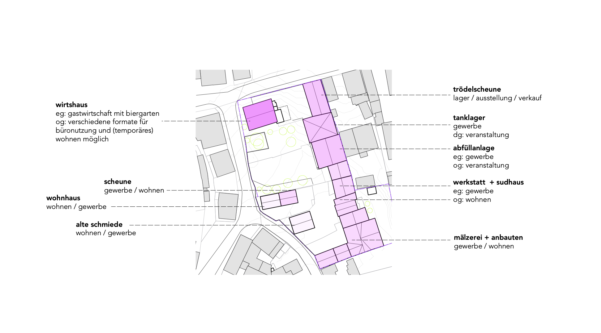 Im Rahmen der Planungswerkstätten wurde ein Teilgebiet des Areals konkret auf seine räumlichen Potenziale und mögliche baurechtliche Herausforderungen untersucht. Skizzenhaft wurden grundlegende Parameter planerisch antizipert: funktionale Gliederung des Ensembles und geeignete Nutzungsspektren, Erschließung und Brandschutz, Stellplatzschlüssel und Verkehrskonzept, erforderliche Abrissmaßnahmen und effizienzsteigerne Umbauszenarien, Nutzbarmachung und Attraktivierung der vorhandenen Räume…