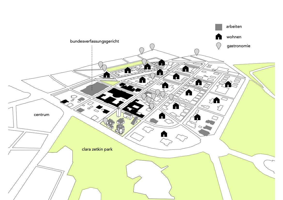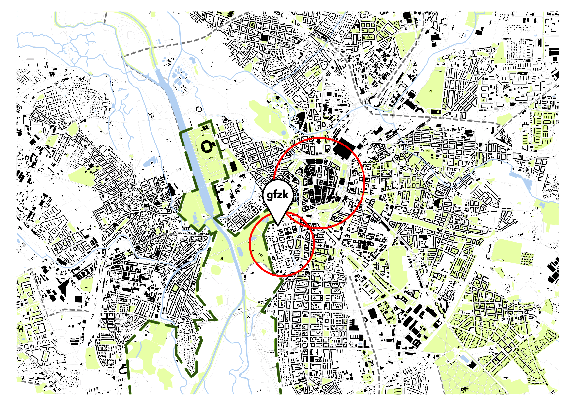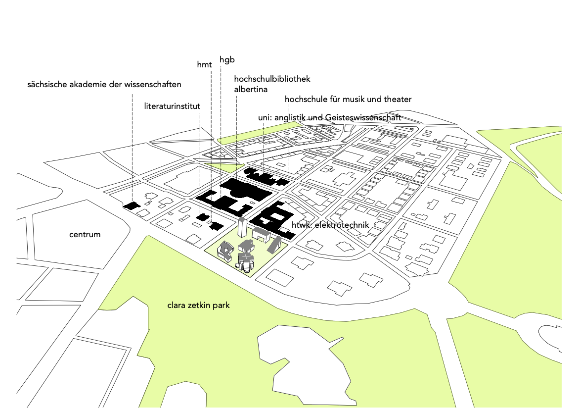 Eine Entwicklungsstudie für die Galerie für Zeitgenössische Kunst. Eine stadtprägende Institution. In prominenter Innenstadtlage. Wie lässt sich eine Nutzungsintensivierung zwischen Universität, Park, Innenstadt und Plattenbau städtebaulich initiieren? Wie können bereits vorhandene Nutzungen räsonieren?