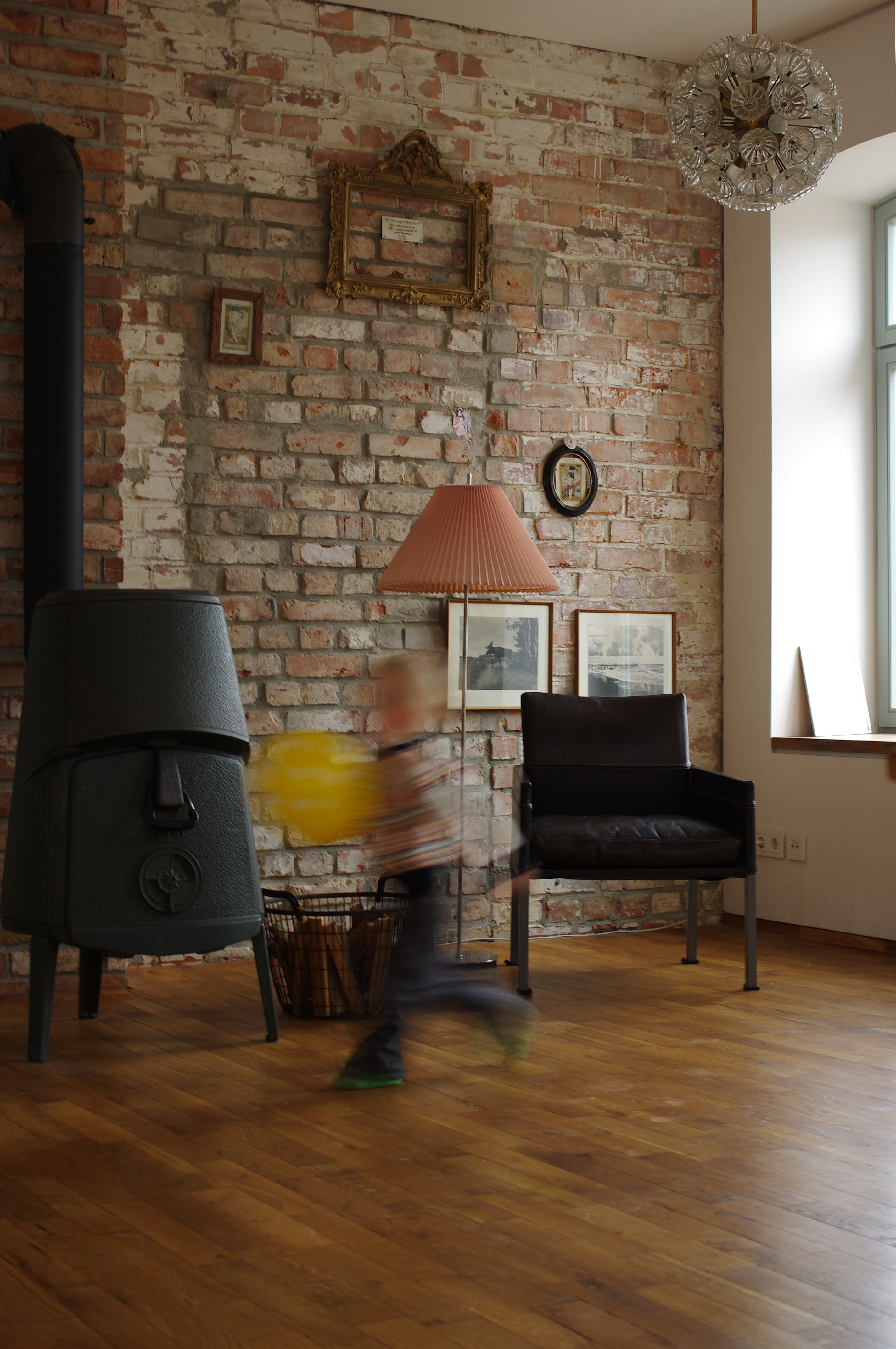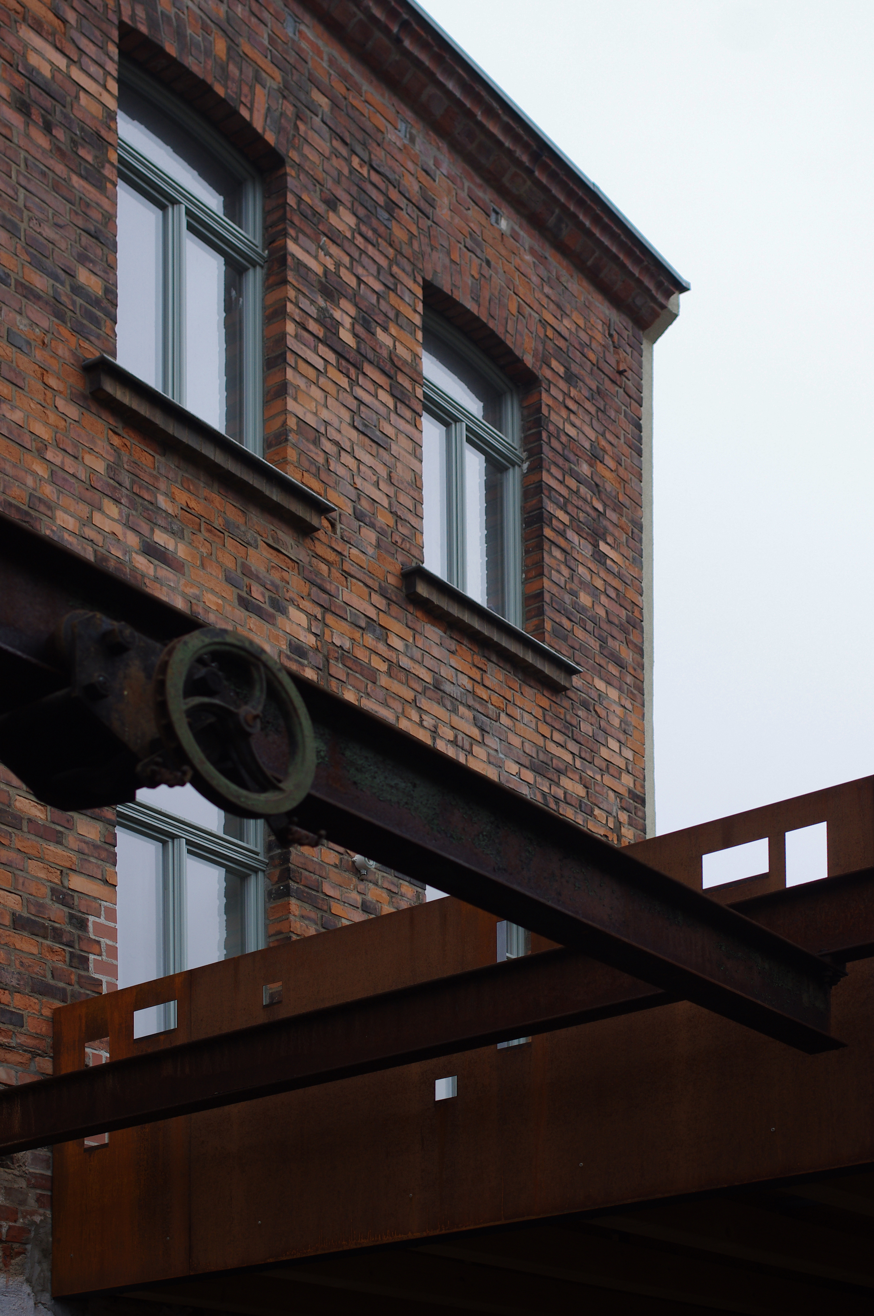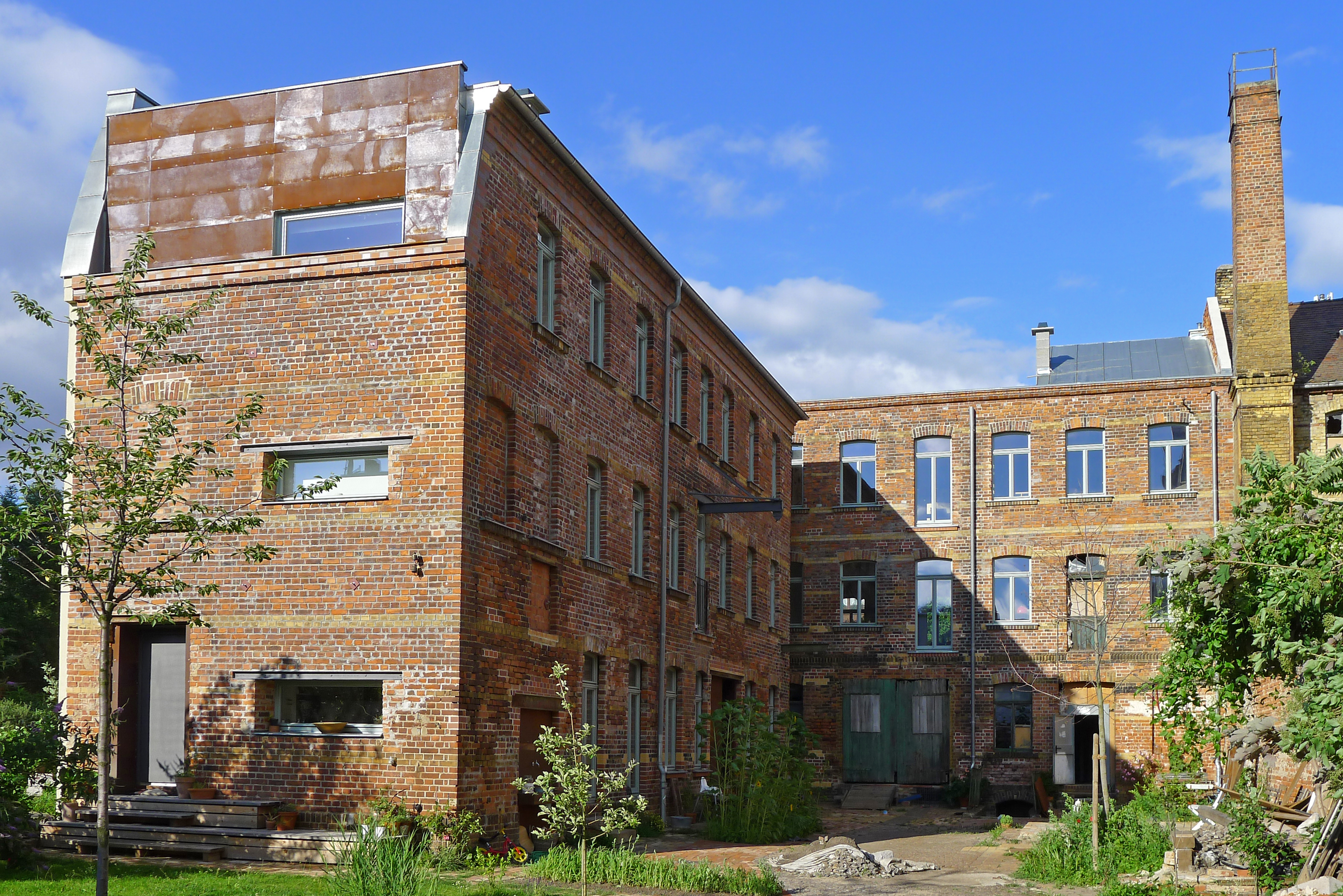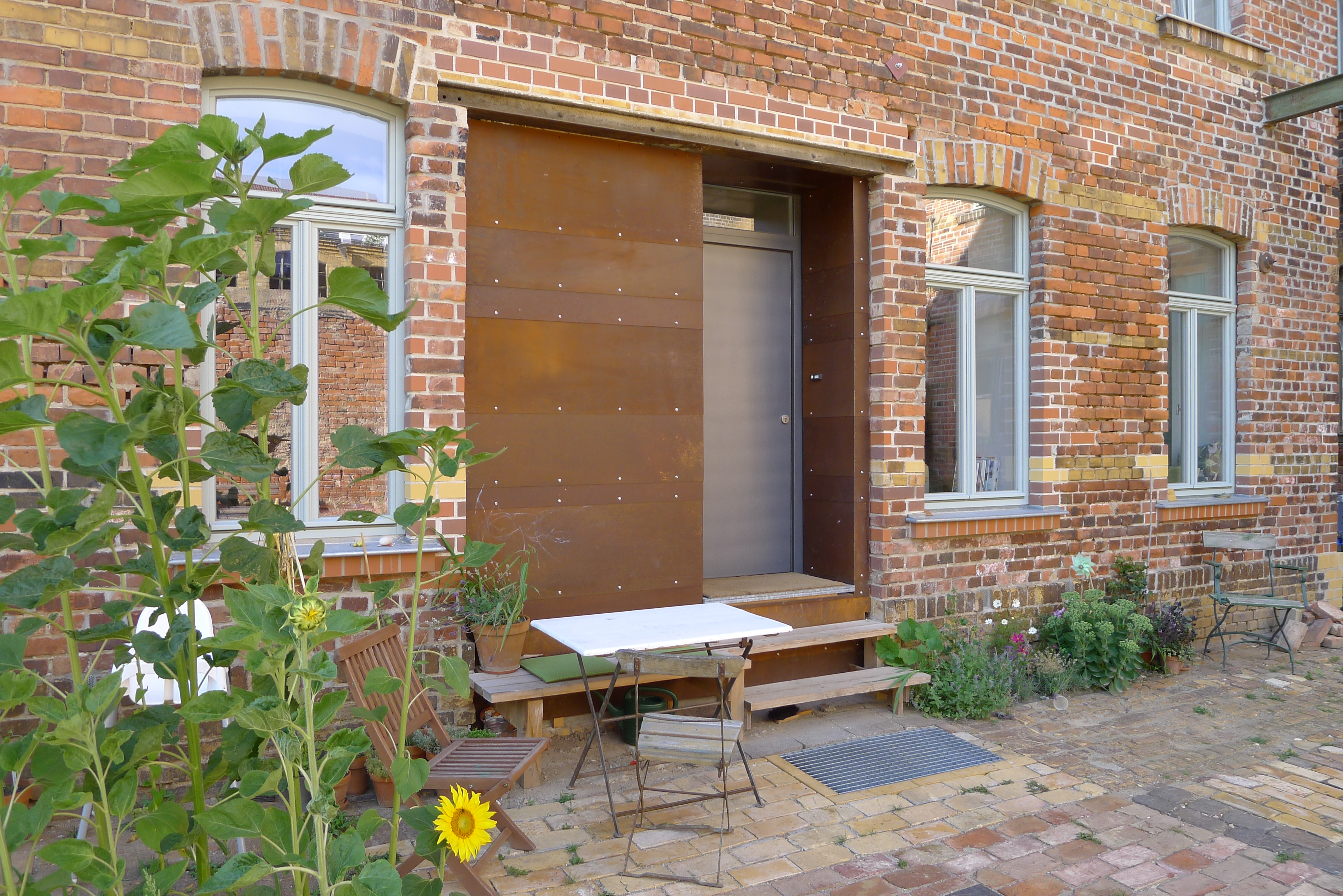 Der Umbau des leerstehenden Fabrikgebäudes zum selbstgenutzten Wohnbau berücksichtigt dessen ehemalige Nutzung und die Tradition des Ortes: Wir greifen die vorgefundenen Gegebenheiten auf und erhalten die denkmalgeschützte Klinkerfassade als Zeugnis der industriellen Tradition. Ebenso bleiben einzelne stilprägende Elemente wie ein alter Kran an der Fassade, freiliegende Stahlträger oder Transmissions-Wellen an den Decken bestehen. Auch an anderen Stellen bleibt Geschichte sichtbar – in der Aufarbeitung alter Türen, die die Fassade mitprägen, im Erhalt eines historischen Treppenhauses. Freiräume und Leerstellen (wie unsere sogenannte Spielwiese, einer großen Industriehalle mit offenem Lichthof nach hinten) sind integraler Teil der Konzeptidee. Auch das neue Material an der Gebäudehülle und im Außenbereich orientiert sich an der Geschichte des Gebäudes: Gerostete Schwarzstahlbleche treffen auf Klinkerfassade.