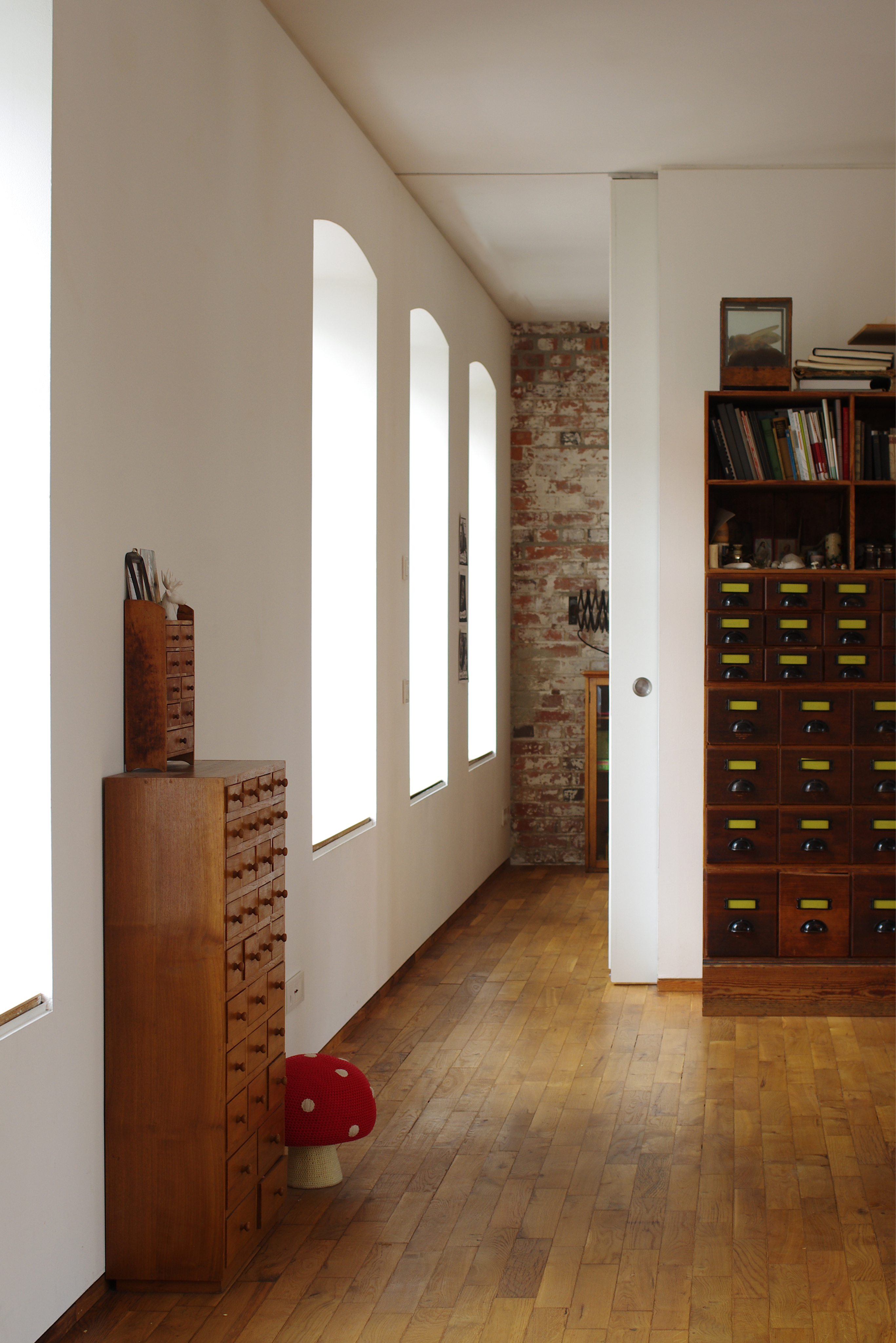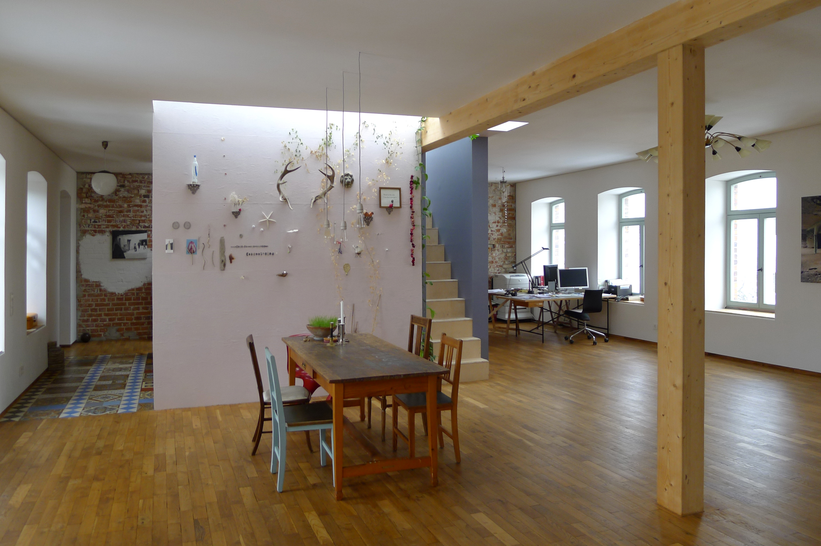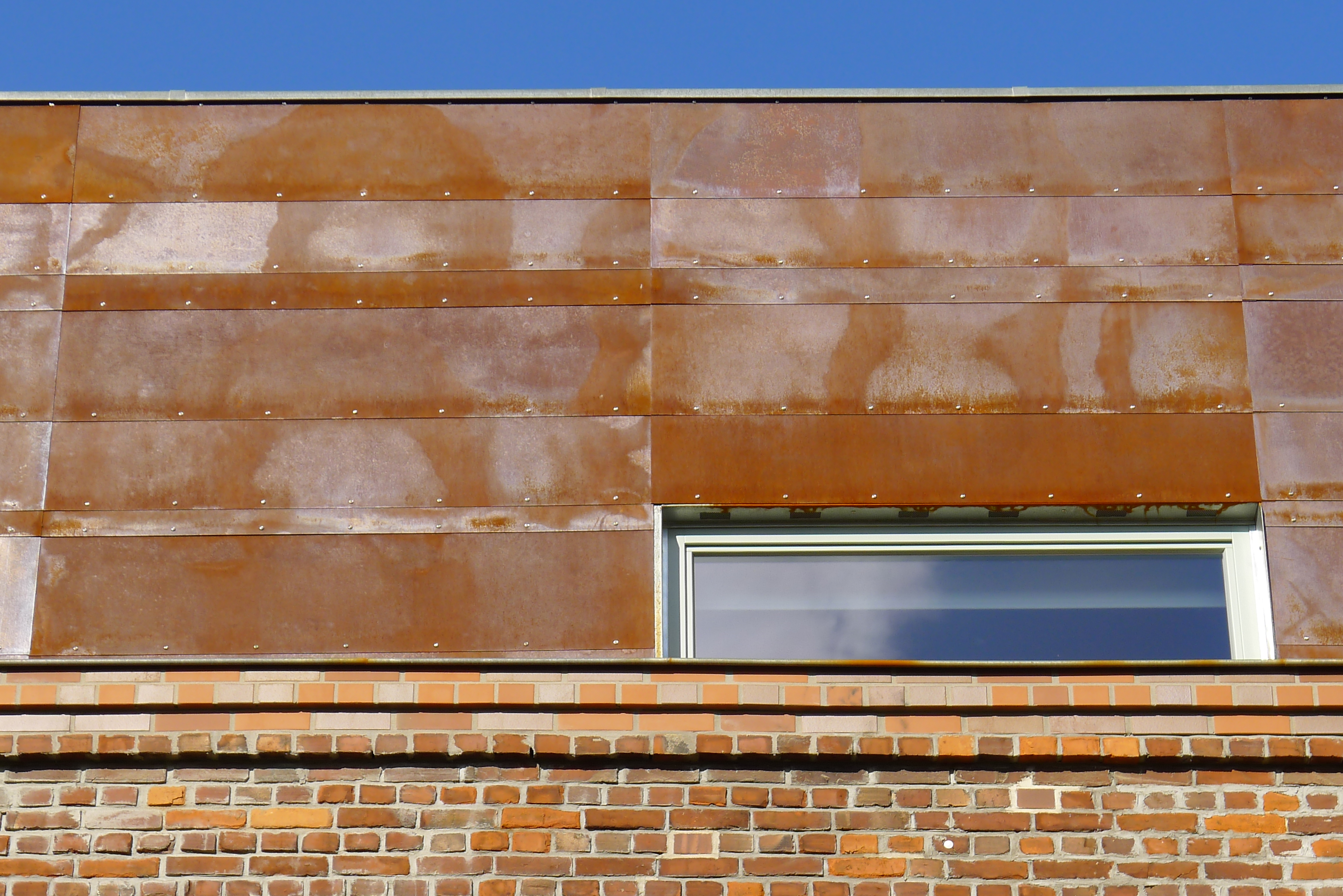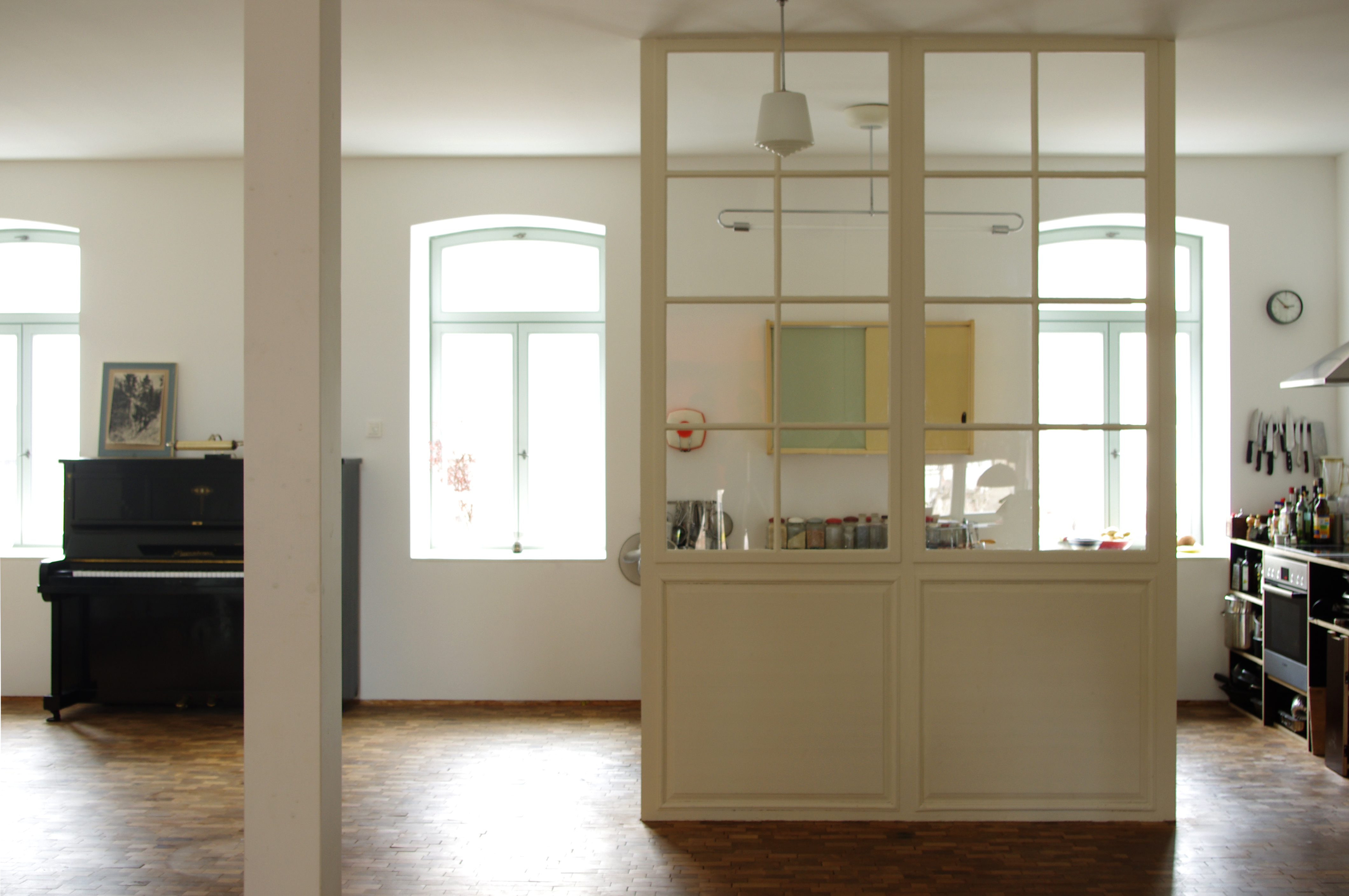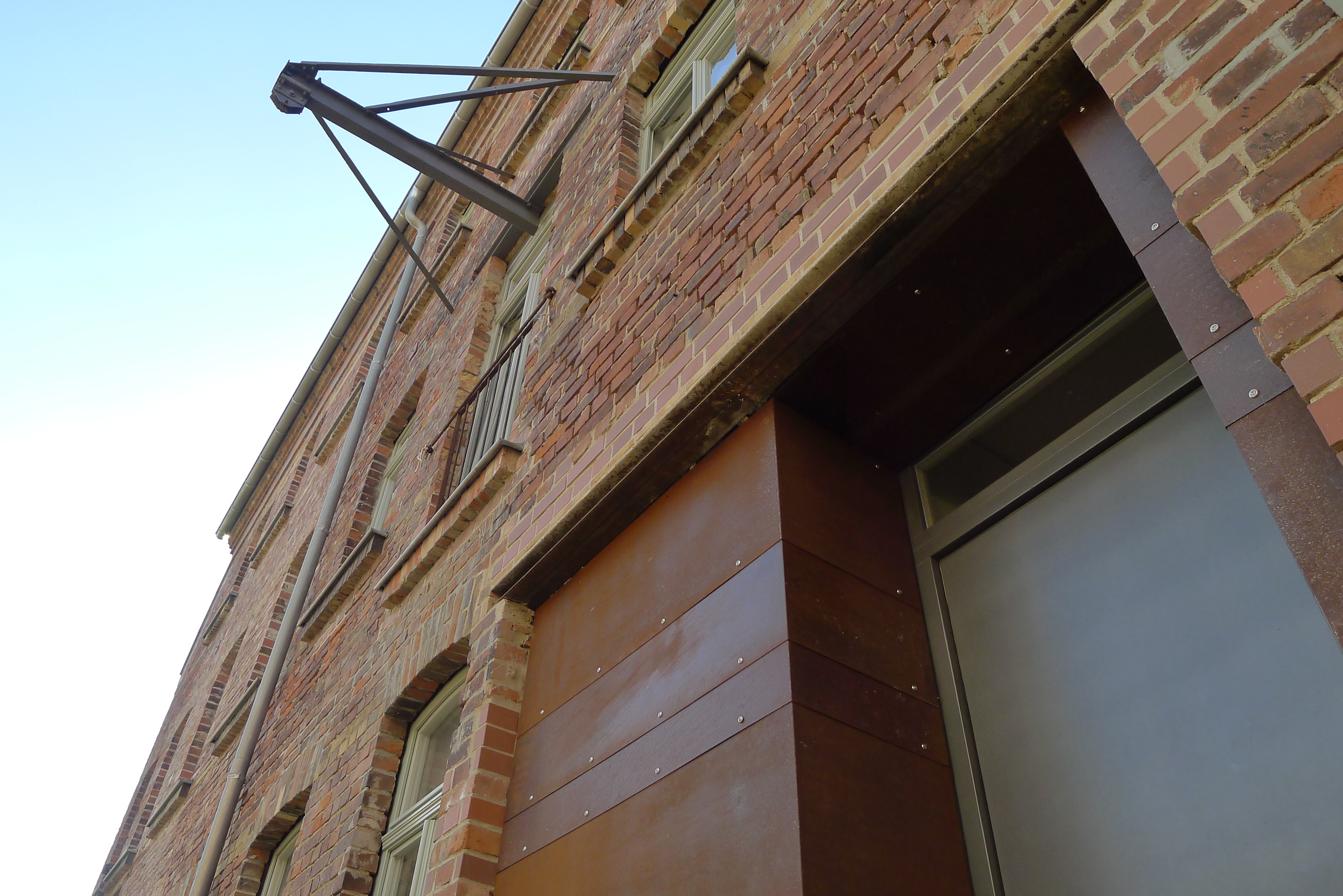 Der Umbau des leerstehenden Fabrikgebäudes zum selbstgenutzten Wohnbau berücksichtigt dessen ehemalige Nutzung und die Tradition des Ortes: Wir greifen die vorgefundenen Gegebenheiten auf und erhalten die denkmalgeschützte Klinkerfassade als Zeugnis der industriellen Tradition. Ebenso bleiben einzelne stilprägende Elemente wie ein alter Kran an der Fassade, freiliegende Stahlträger oder Transmissions-Wellen an den Decken bestehen. Auch an anderen Stellen bleibt Geschichte sichtbar – in der Aufarbeitung alter Türen, die die Fassade mitprägen, im Erhalt eines historischen Treppenhauses. Freiräume und Leerstellen (wie unsere sogenannte Spielwiese, einer großen Industriehalle mit offenem Lichthof nach hinten) sind integraler Teil der Konzeptidee. Auch das neue Material an der Gebäudehülle und im Außenbereich orientiert sich an der Geschichte des Gebäudes: Gerostete Schwarzstahlbleche treffen auf Klinkerfassade.