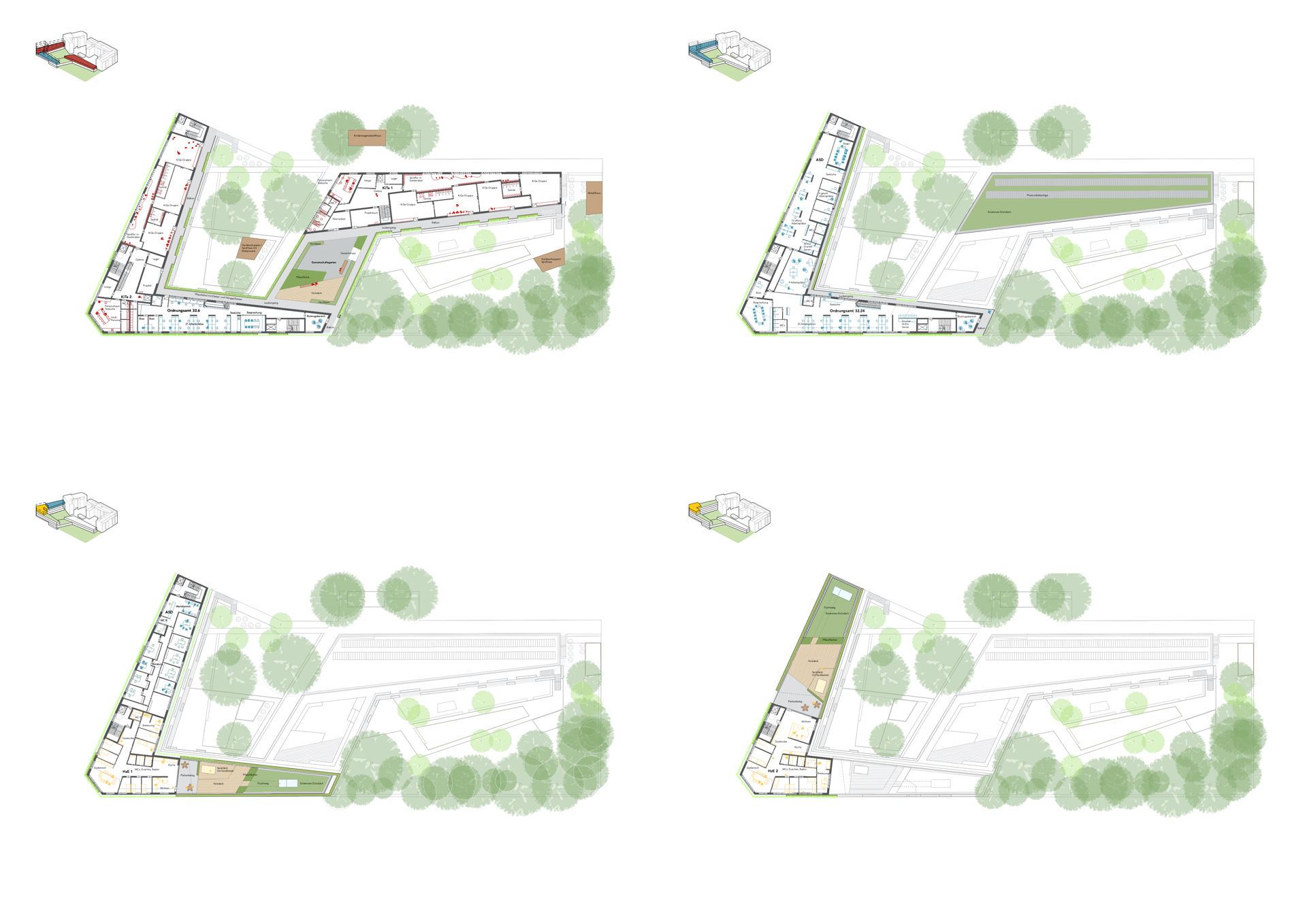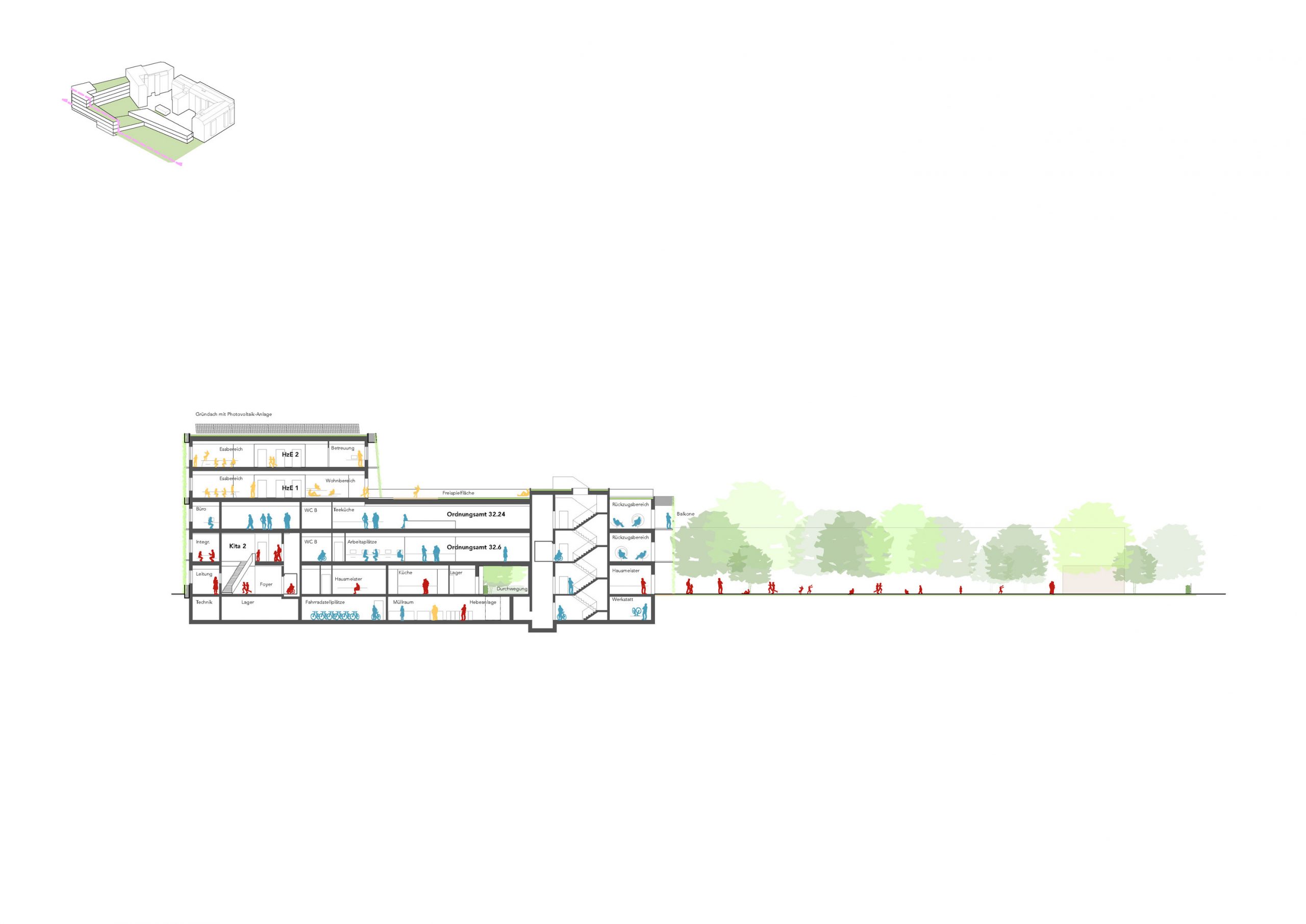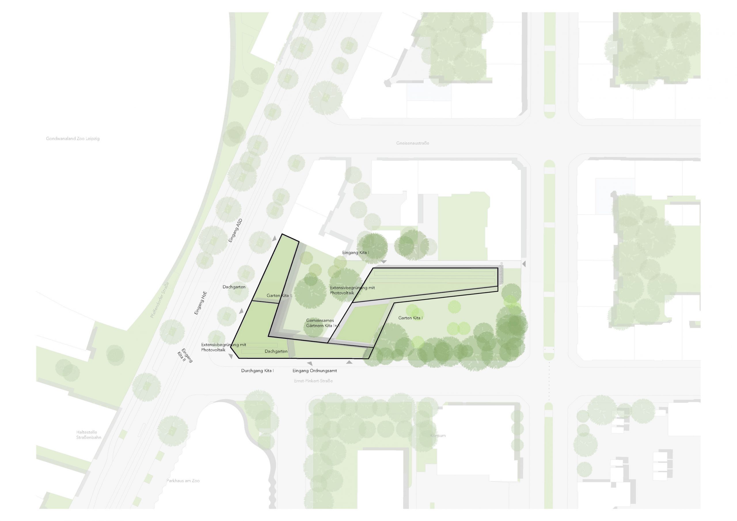 Die Eingänge der verschiedenen Nutzungsbausteine werden als jeweils eigene Adresse im Stadtraum angelegt: In Unterschnitten enstehen ebenerdige, sichtbare und überdachte Eingangsbereiche. Die Kitas befinden sich im EG und 1. OG. Die luftigen Foyers mit den zugeordneten Mehrzweckräumen bilden großzügige Eingangsbereiche und Verteiler in die Spielflure der Kindergarten- und Krippenbereiche. Alle Gruppenräume haben direkten Garten- oder Balkonzugang. Ein gemeinsamer Dachgarten verbindet beide Kindertagesstätten. Das Ordnungsamt erstreckt sich vom 1. OG bis ins 2. OG des südlichen Gebäudeflügels und wird von der Ernst-Pinkert-Straße erschlossen. Es hat dort direkten Zugang zur Tiefgarage, in der die Dienstfahrzeuge und die Umkleiden untergebracht sind. Der Eingang zum Allgemeinen Sozialdienst befindet sich an der Pfaffendorfer Straße, die Büroräume sind im 1. OG, der öffentliche Bereich im 2. OG angeordnet. Der separate Zugang für die beiden Wohngruppen liegt ebenfalls an der Pfaffendorfer Straße, die Gruppen liegen im 4. und 5. OG und verfügen über großzügige Dachterrassen mit Blick über den Zoo und das Rosental.
