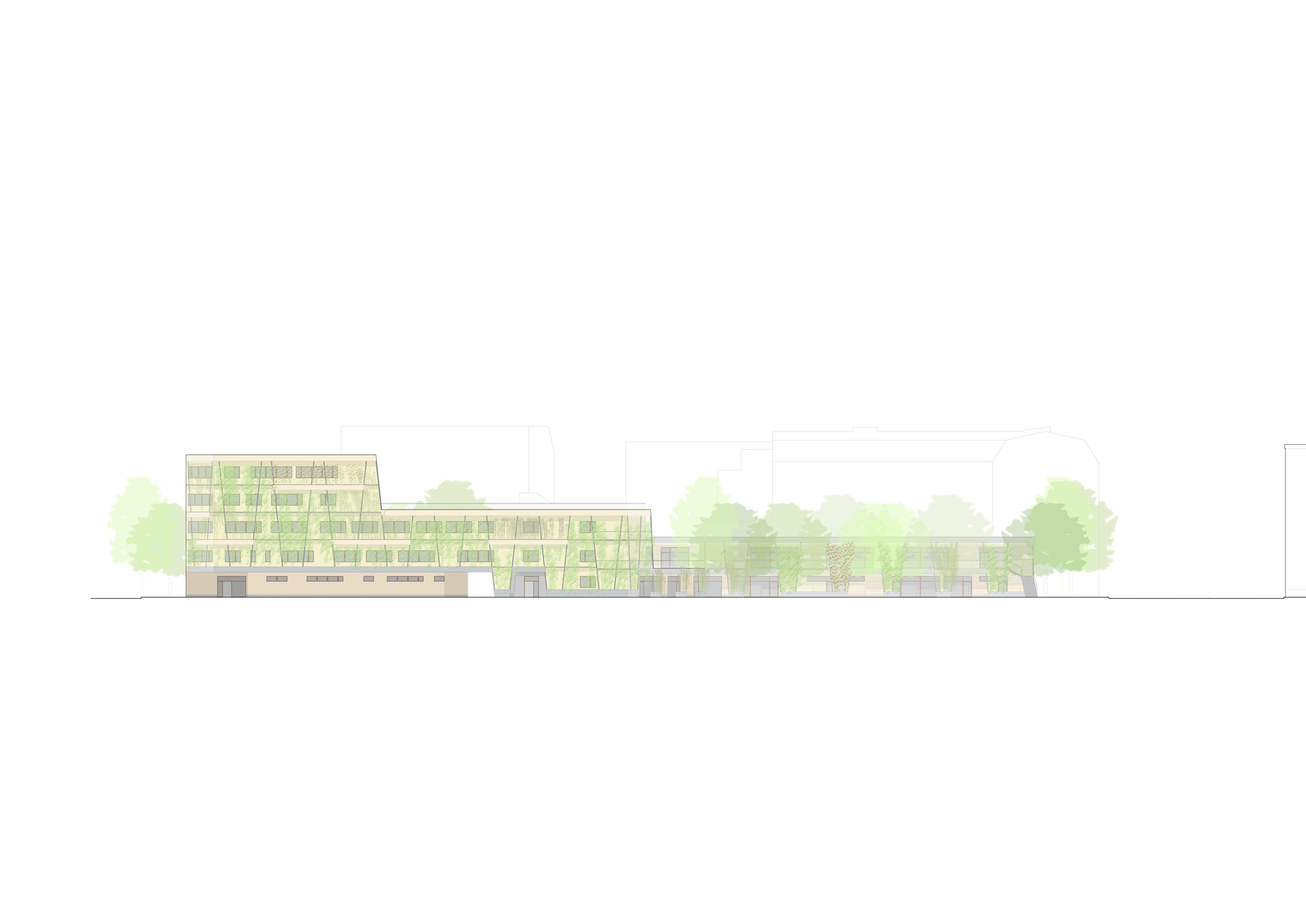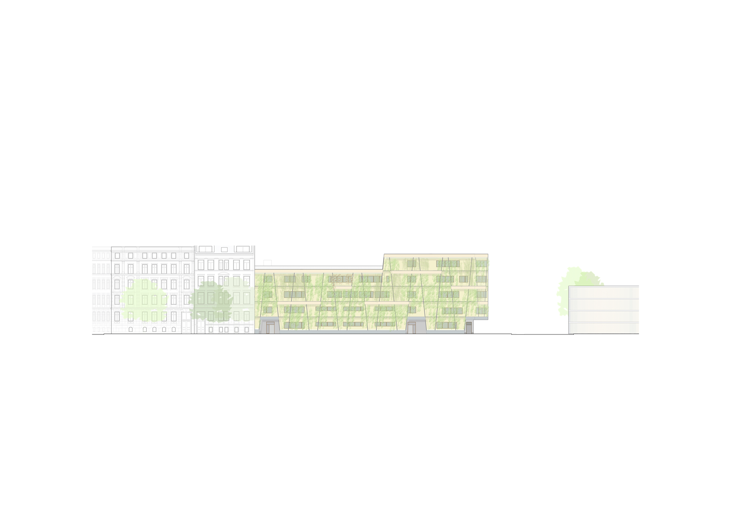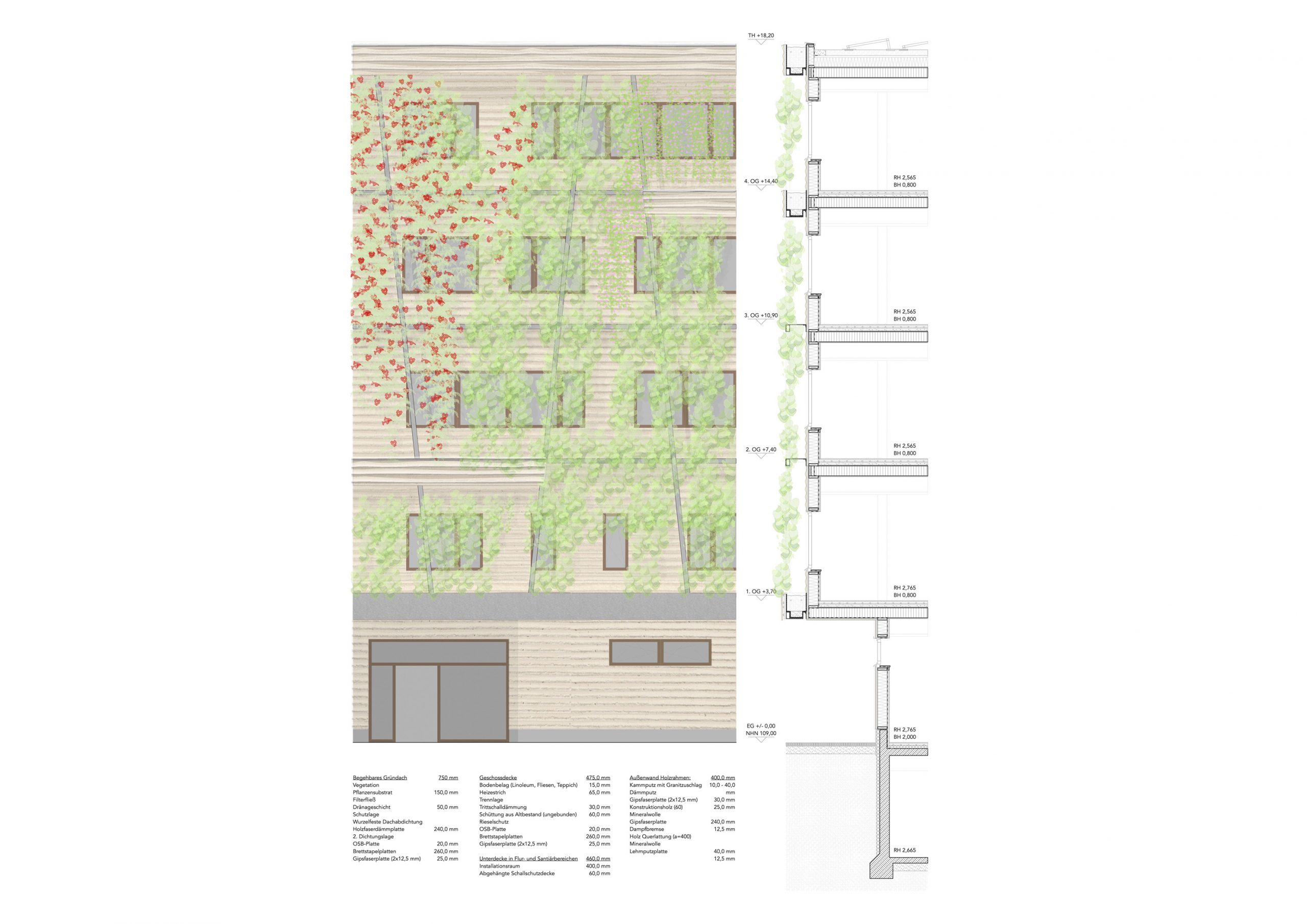 Die Fassade lebt, blüht, kühlt, duftet: Verschiedene Pflanzen werden an einem Ranknetz miteinander verwoben. An den repräsentativen Fassaden sind sie als großflächiger Vorhang mehr als ökologische Applikation, sie werden zu gestaltbarem Fassadenmaterial. Pflanztröge zitieren das gründerzeitliche Sockelmotiv und bilden den unteren Fassadensaum. Im Bereich der Eingänge wird dieser Sockel zum gelüpften Vordach, in den oberen Geschossen treten punktuell weitere Tröge in die grüne Fläche. Die Pflanzkästen gliedern die Fassade vertikal, erlauben auch hängende Pflanzungen, wie Klettertrompete (campsis radicans) und Klematis (clematis montana), die sich mit der Großen Pfeifenwinde eng verweben. Es entsteht eine organische, sich im Laufe des Jahres wandelnde Texturierung der Fassade.