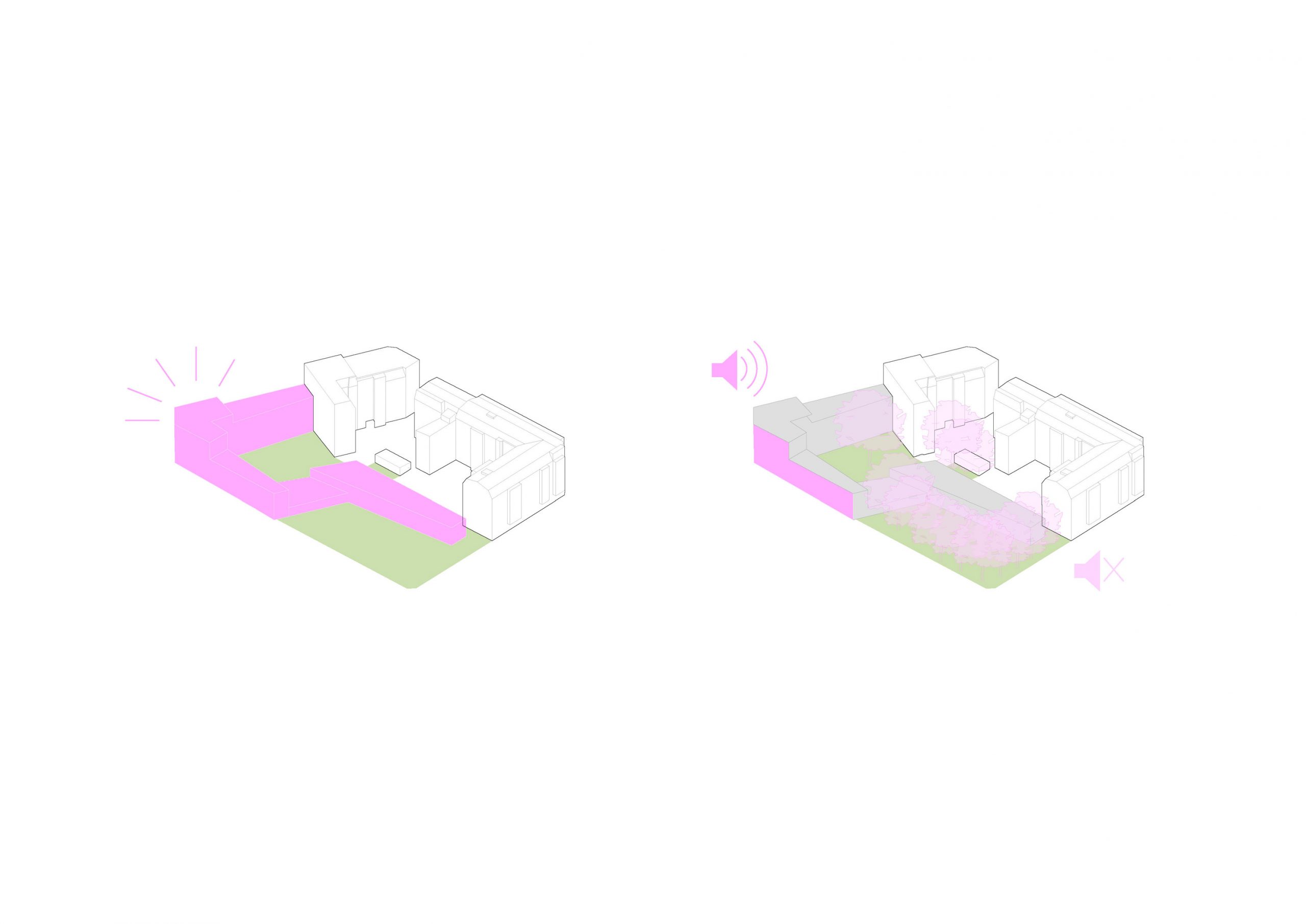 Die Gebäudekubatur erlaubt diverse Freiräume, sowohl ebenerdig als auch auf den Dächern. Im Aussenraum werden die polygonalen Grundrisse der Innenräume fortgesetzt. Die Gärten sind geprägt von weitläufigen Grün-, Sand- und Pflasterflächen unter großen Altbäumen, neu gepflanzten Großsträuchern, langen Sitzbänken und reduziertem Materialeinsatz. Ruhe und Weite prägen die parkartigen Freiräume, die von den Kindern verlebendigt werden sollen.