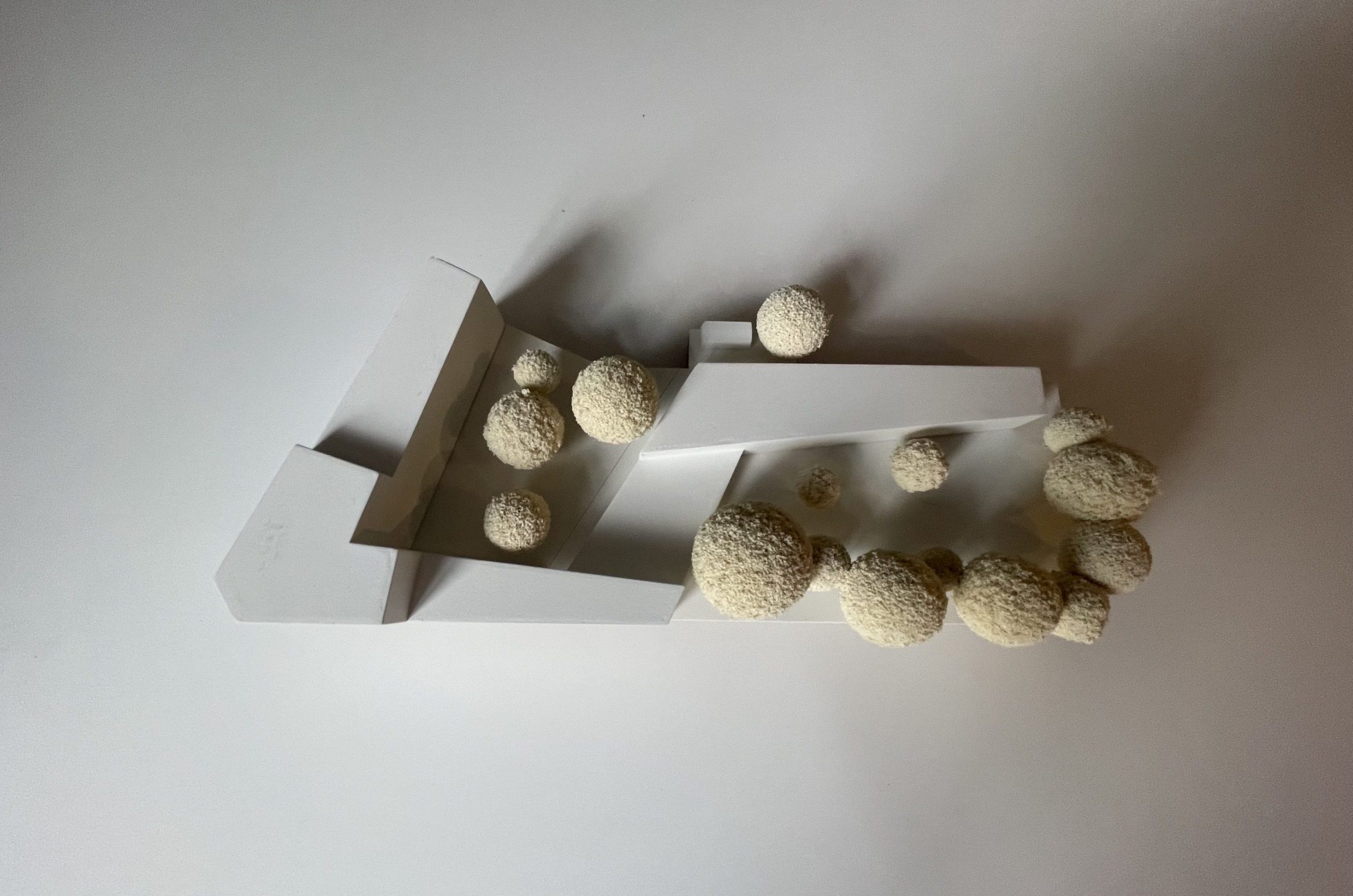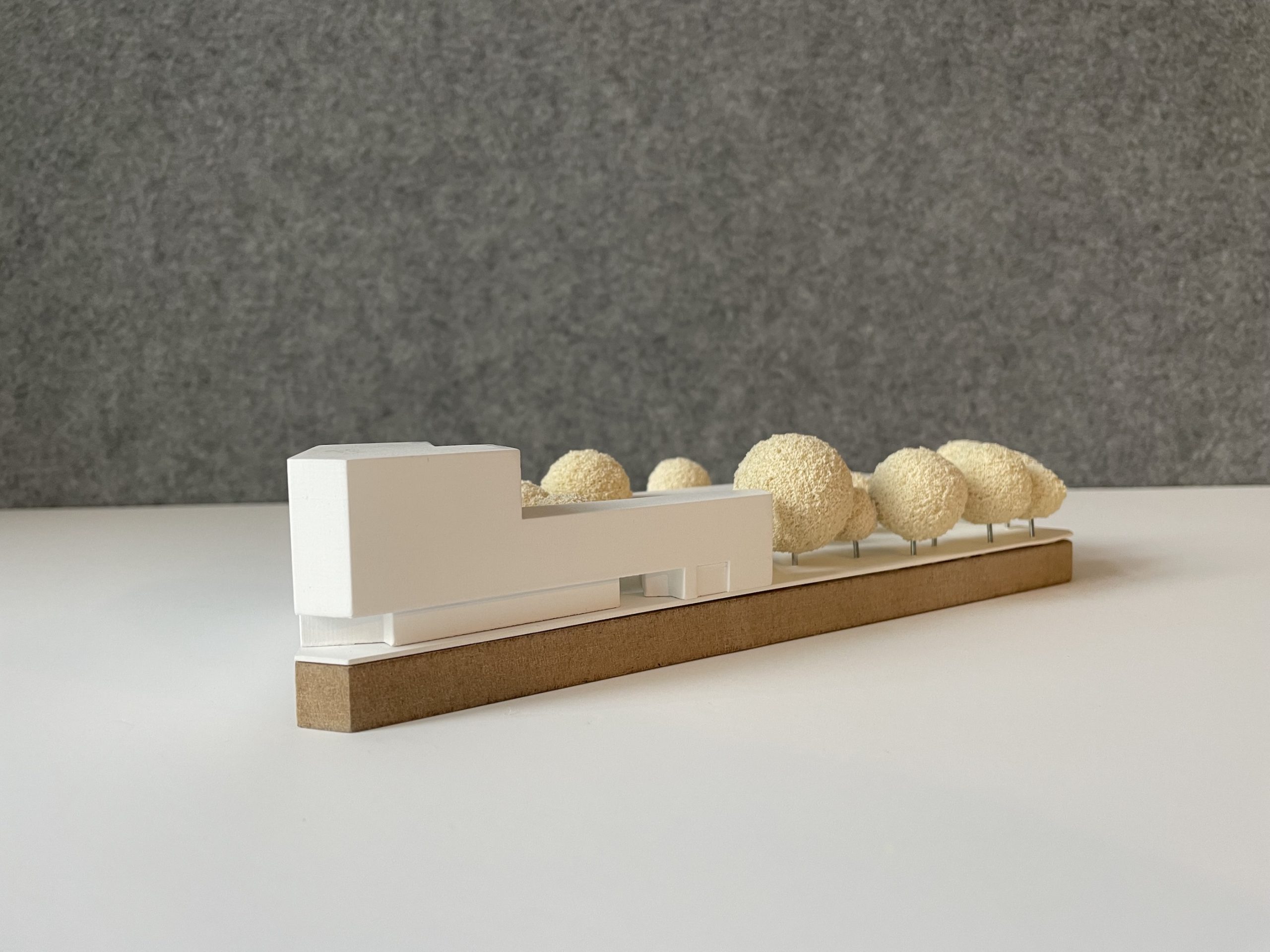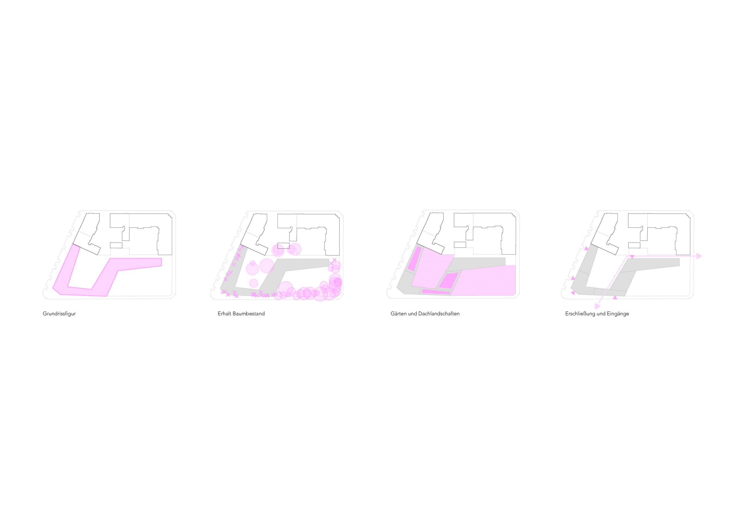 Das historische Motiv raumbildender Eckbebauungen wird aufgegriffen und spielerisch in eine eigenständige städtebauliche Figur überführt. Die nutzungsorientierte Höhenstaffelung des mäandernden Baukörpers vermittelt ein lebendiges Stadtbild: Das Haus schafft mit vier Geschossen einen wirkungsvollen Immissionsschutz zur Pfaffendorfer Straße, akzentuiert mit der 5-geschossigen Eckbebauung eine markante Stadtadresse und leitet mit drei und zwei Geschossen in den inneren Bereich des Wohnviertels über. Der eingeschossige Zwischenriegel sorgt räumlich für eine sanfte Trennung der beiden Kita-Freispielflächen, fungiert aber mit seinem Dachgarten zur gemeinschaftlichen Nutzung auch als verbindendes Element. Die Kubatur bietet darüber hinaus weitere Dachflächen zur differenzierten Nutzung als Grün- und Energiedächer an.