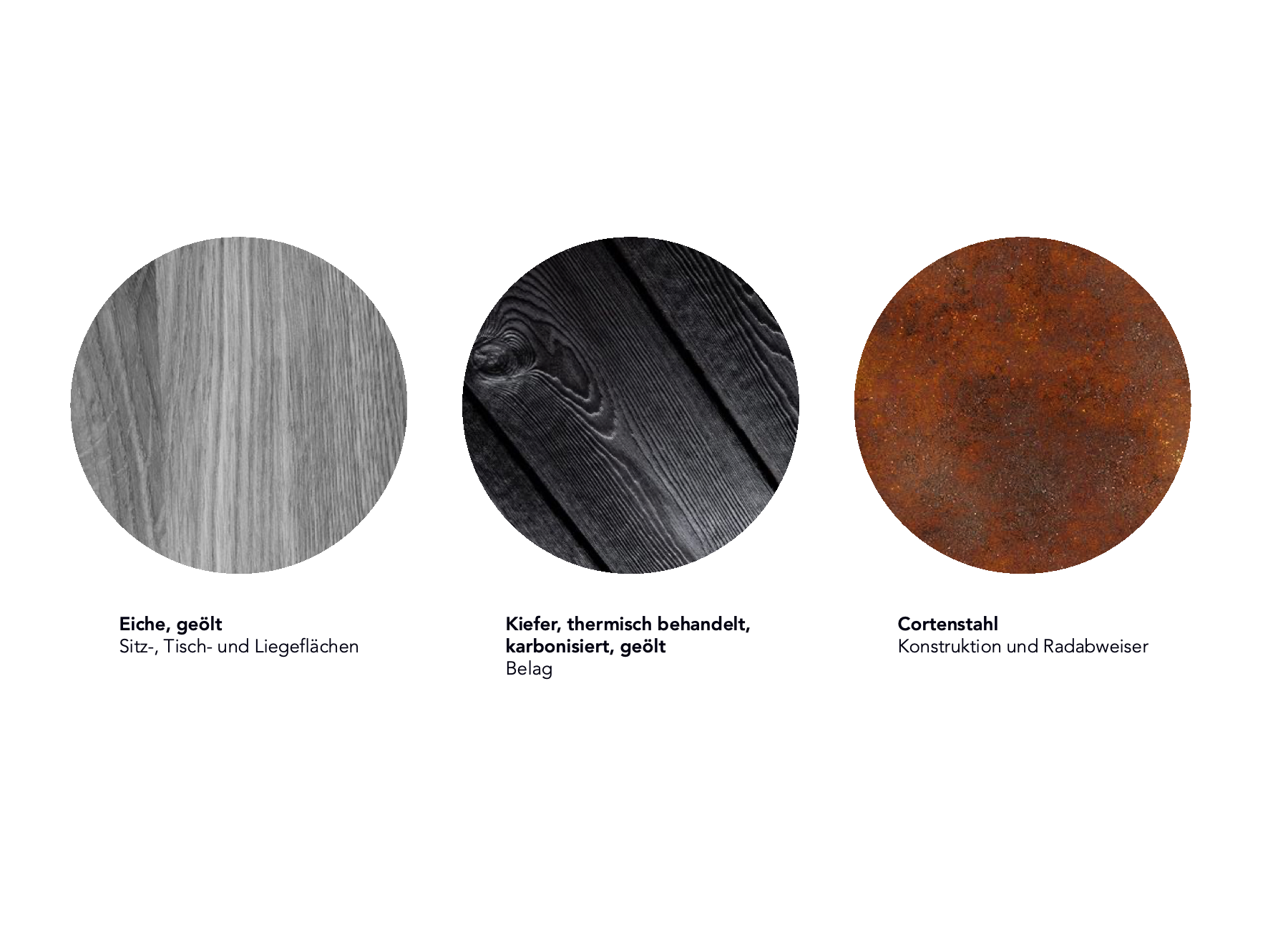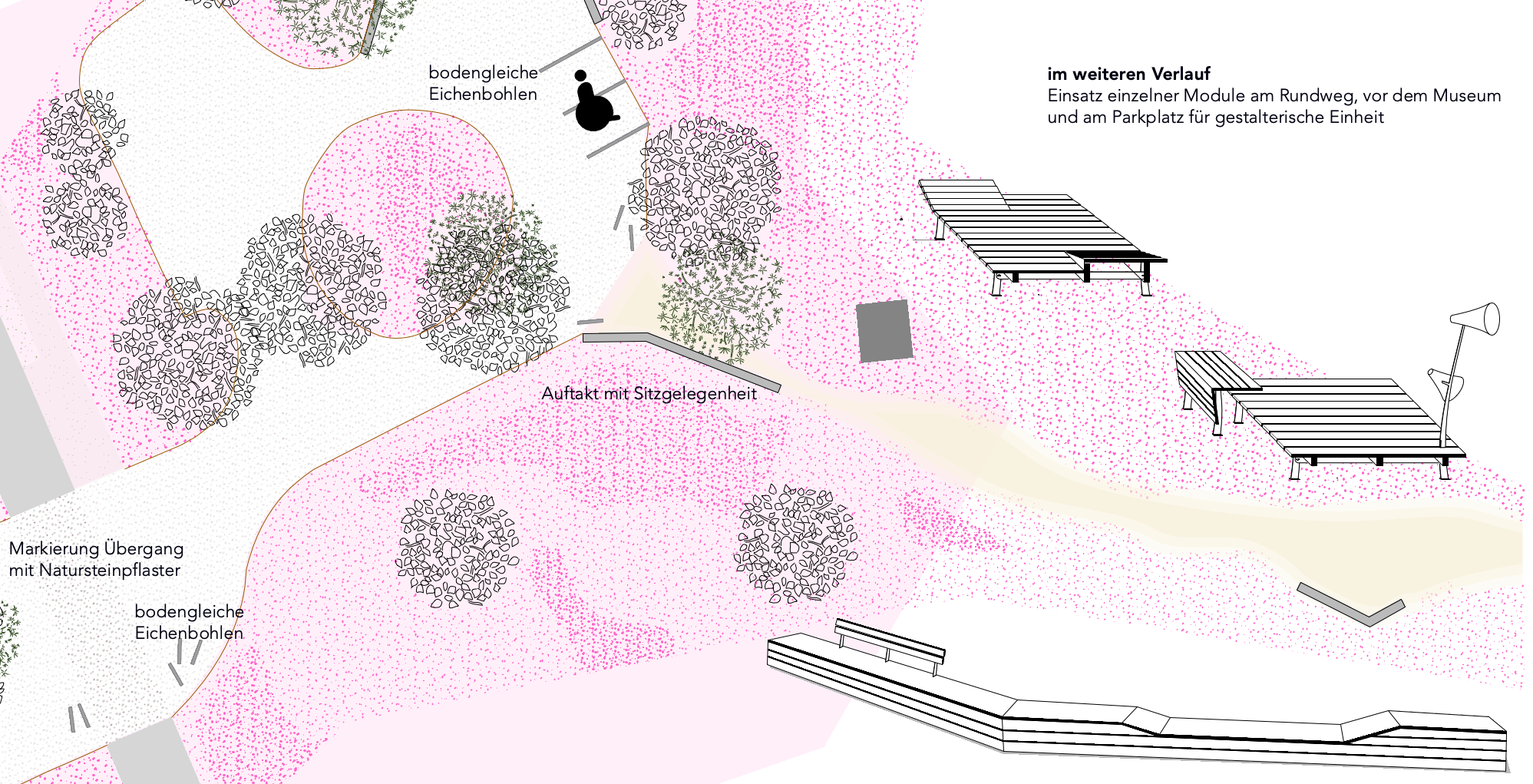 Zur gestalterischen Einheit werden diese Materialien auch auf dem Parkplatz, vor dem Museum und das Mobiliar in Einzelmodulen am Rundweg eingesetzt. Das schafft Orientierung und ein einheitliches Bild, verbindet drei Orte zu einem. So werden z.B. Eichenbohlen an markanten Punkten bodengleich im Boden eingebaut und der Cortenstahl findet sich auch in der Einfassung der Parkplatzflächen wieder. Die Straße wird beim Übergang mit einer Natursteinpflasterfläche markiert, die vor dem Museum wieder auftaucht.