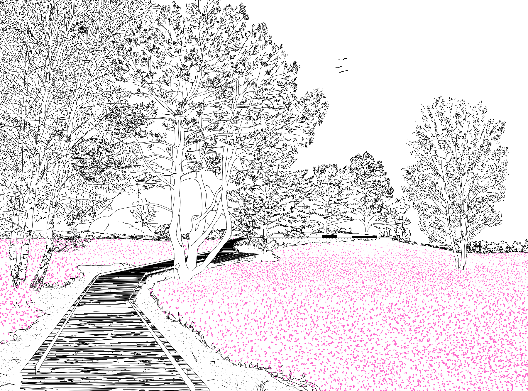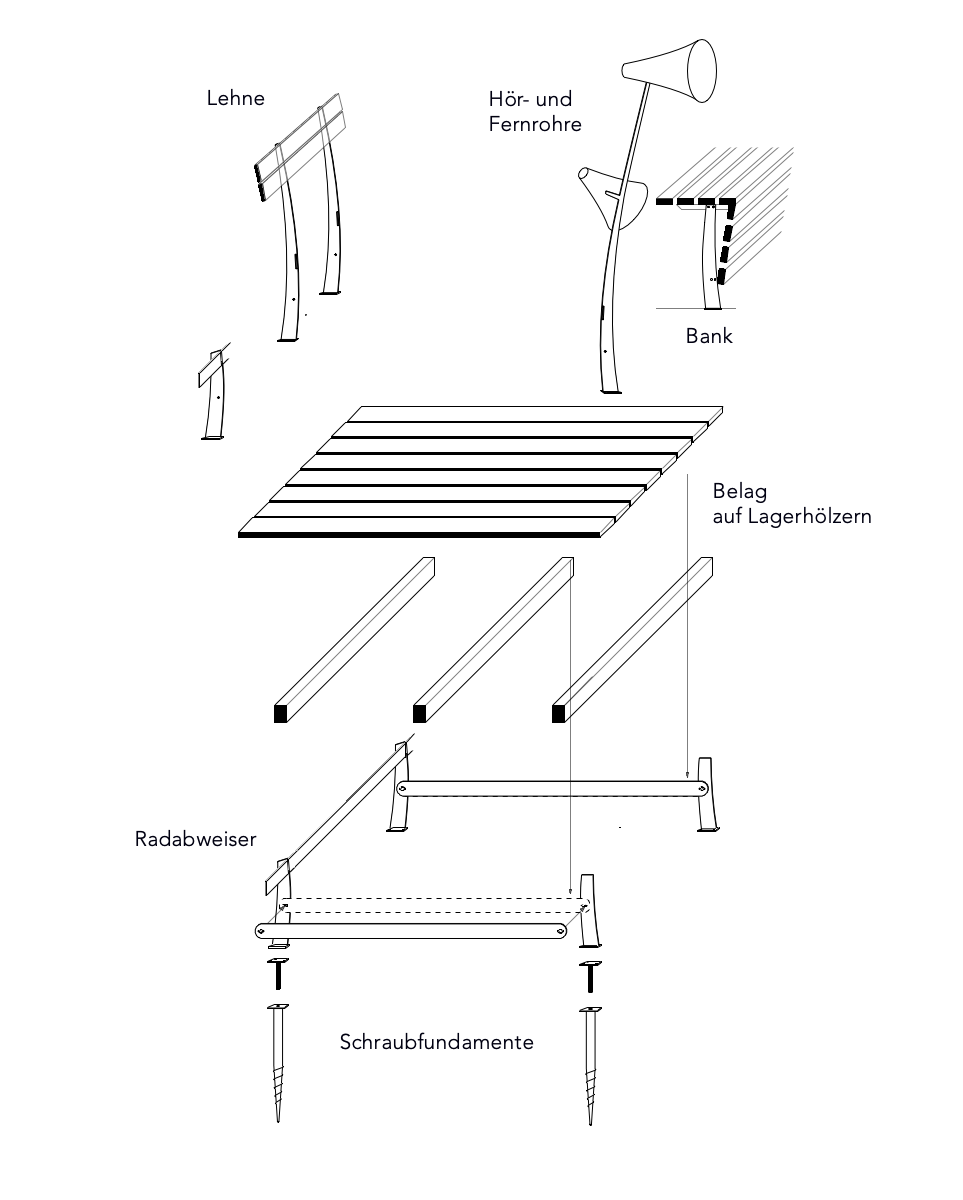 Weiterhin wird auf eine sensible und filigrane Gestaltung und Bauweise des Wegs mit langlebigen heimischen Materialien gesetzt. Wie ein Reptil zieht sich der Steg mit markanter Form mit hoher Wiedererkennbarkeit durch die Landschaft bis hoch zum Aussichtsplateau, verbreitert sich manchmal zu Verweilräumen mit Bänken, bietet Sitz- und Liegeflächen, Fern- und Hörrohre und auch Tische zum Schreiben und Zeichnen an. Es werden drei Materialien verwendet: Die Laufflächen des Stegs werden mit karbonisierte Kiefer beplankt. So zeichnet sich der Steg als Landmarke deutlich in die umgebenden Landschaft ein und verweist durch das schwarze verkohlte Holz auf deren Entstehung durch Feuer. Alle Sitz-, Liege- und Tischflächen werden aus massiver, geölter Eiche gefertigt, mit der Zeit wird diese vergrauen und mit den schwarzen Laufflächen und der Tragkonstruktion aus Corten-Stahl ein harmonisches Bild ergeben.