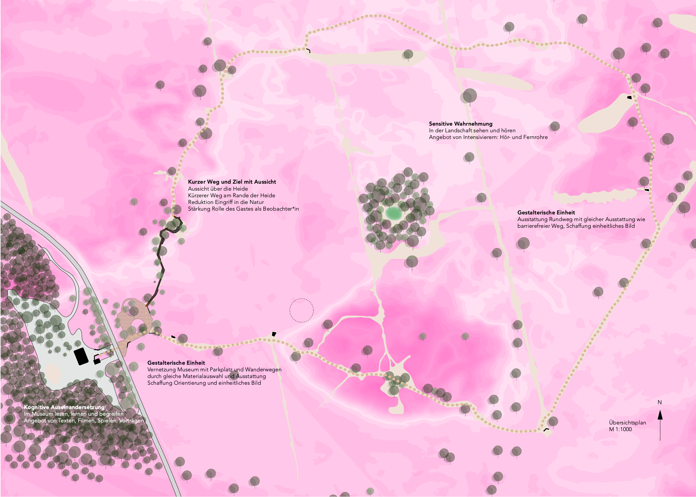 Gen Osten führt der Weg zweihundert Meter mitten durch die Heide und das Ziel lässt aufgrund seiner Höhe und der angrenzenden Düne keine umfassende Aussicht über die Heidelandschaft zu. So empfehlen wir die „Umsetzung“ des Weges gen Norden. Der hier bestehende Weg ist wesentlich kürzer und dringt nicht so weit in die Heidelandschaft vor. Der Eingriff in die Natur wird reduziert. Der Weg bietet mehrere interessante Verweilsituationen und führt zu einem tatsächlich attraktiven Ziel mit spektakulärer Aussicht auf die Heide für alle!