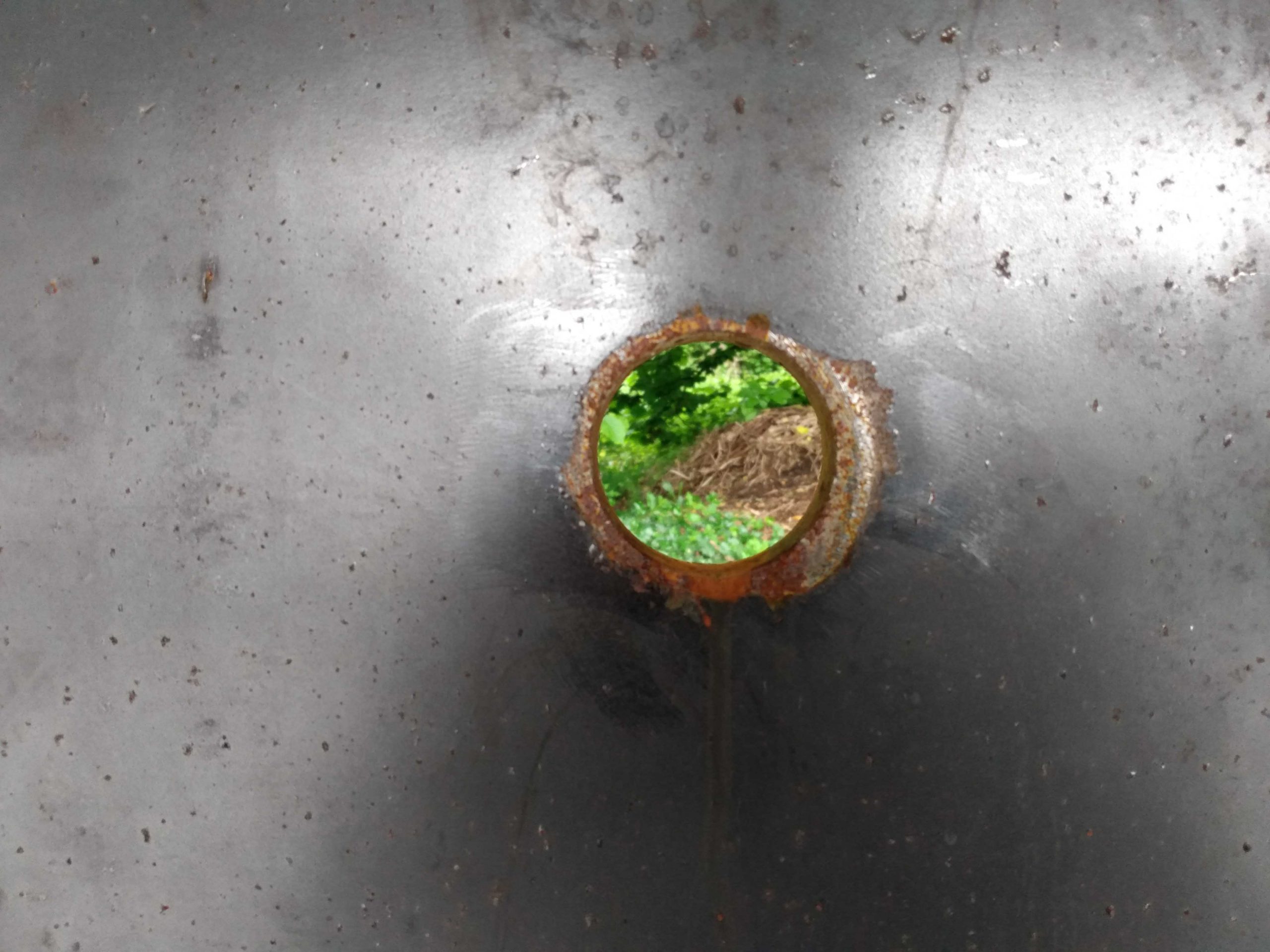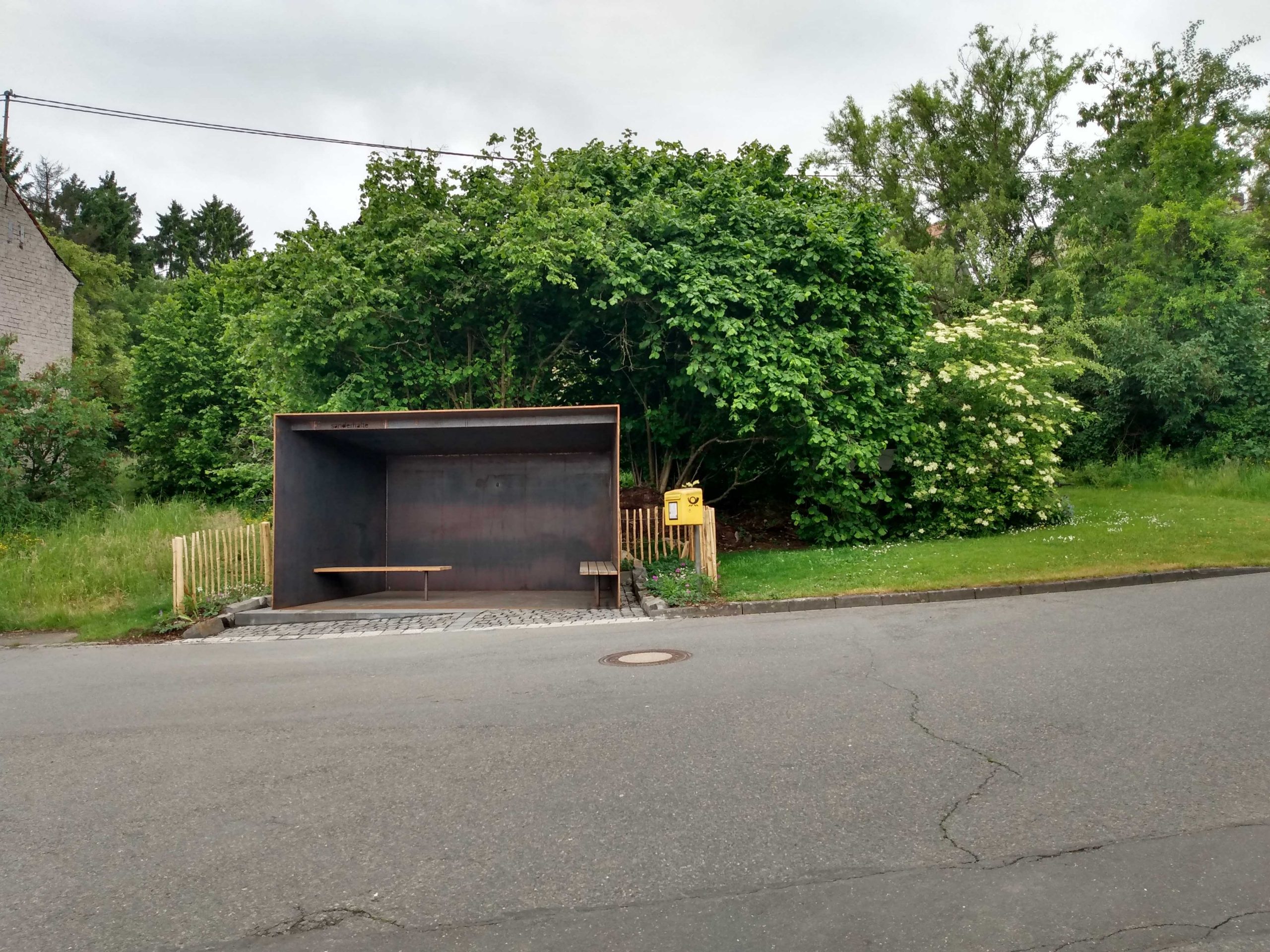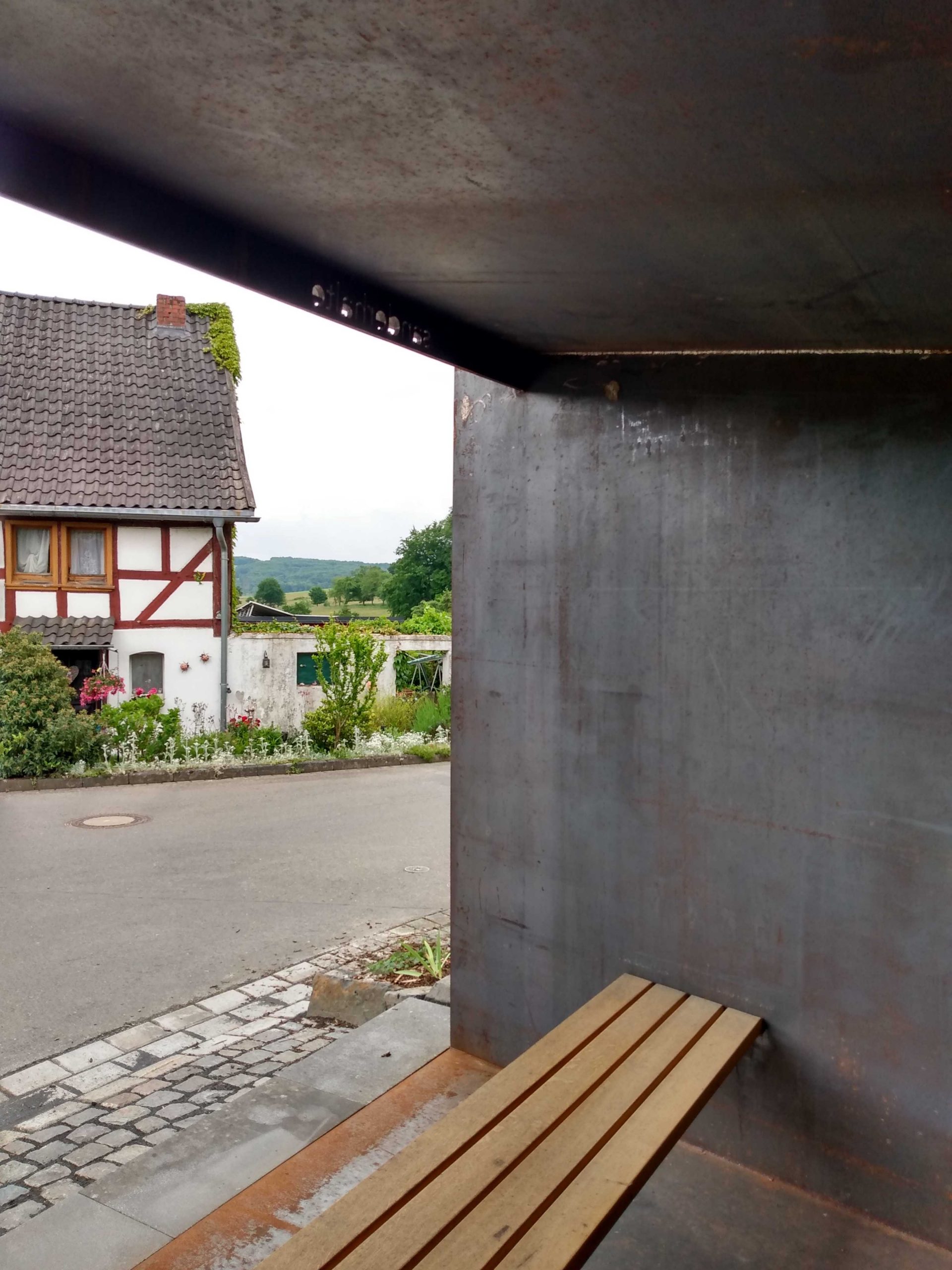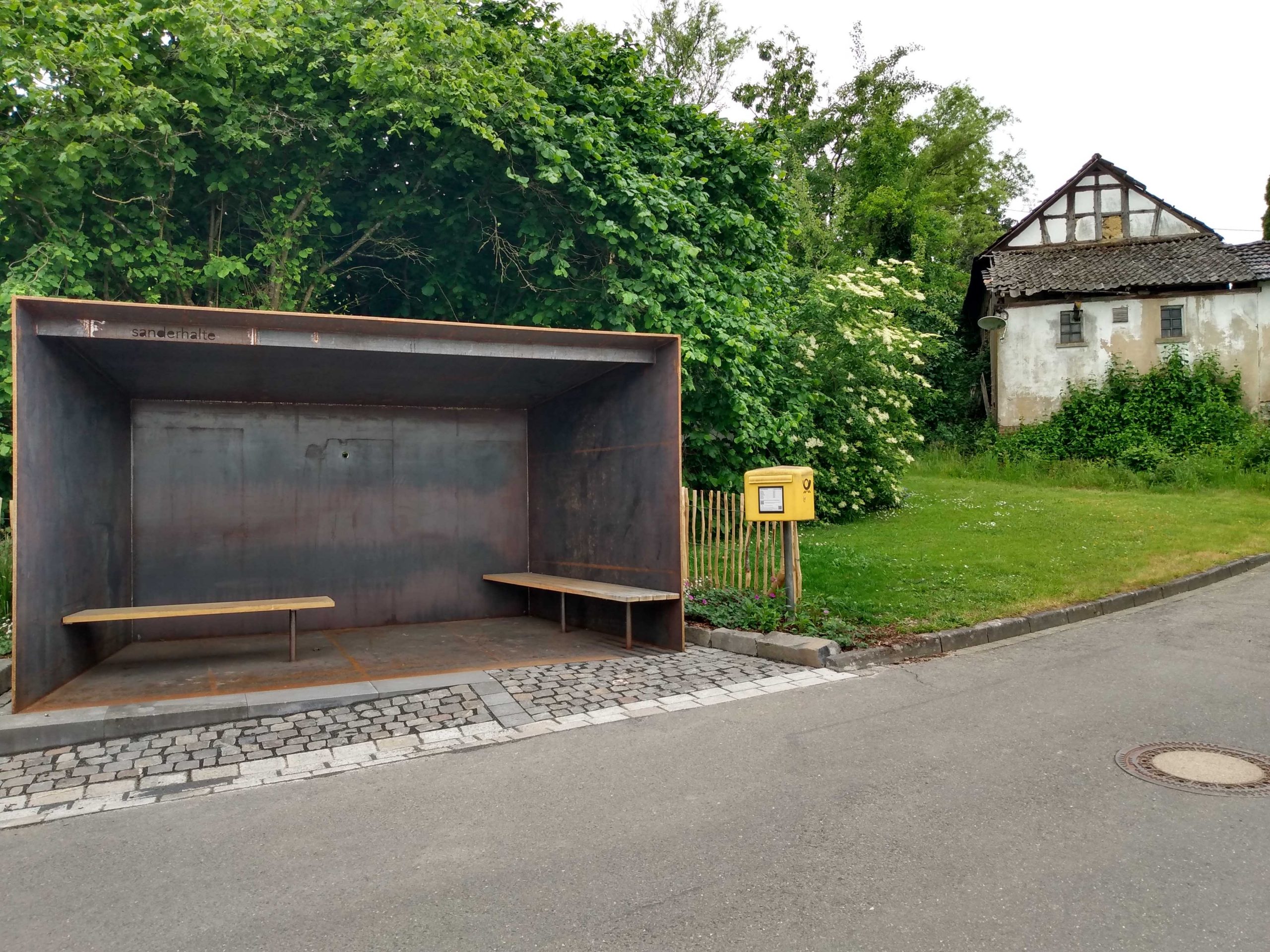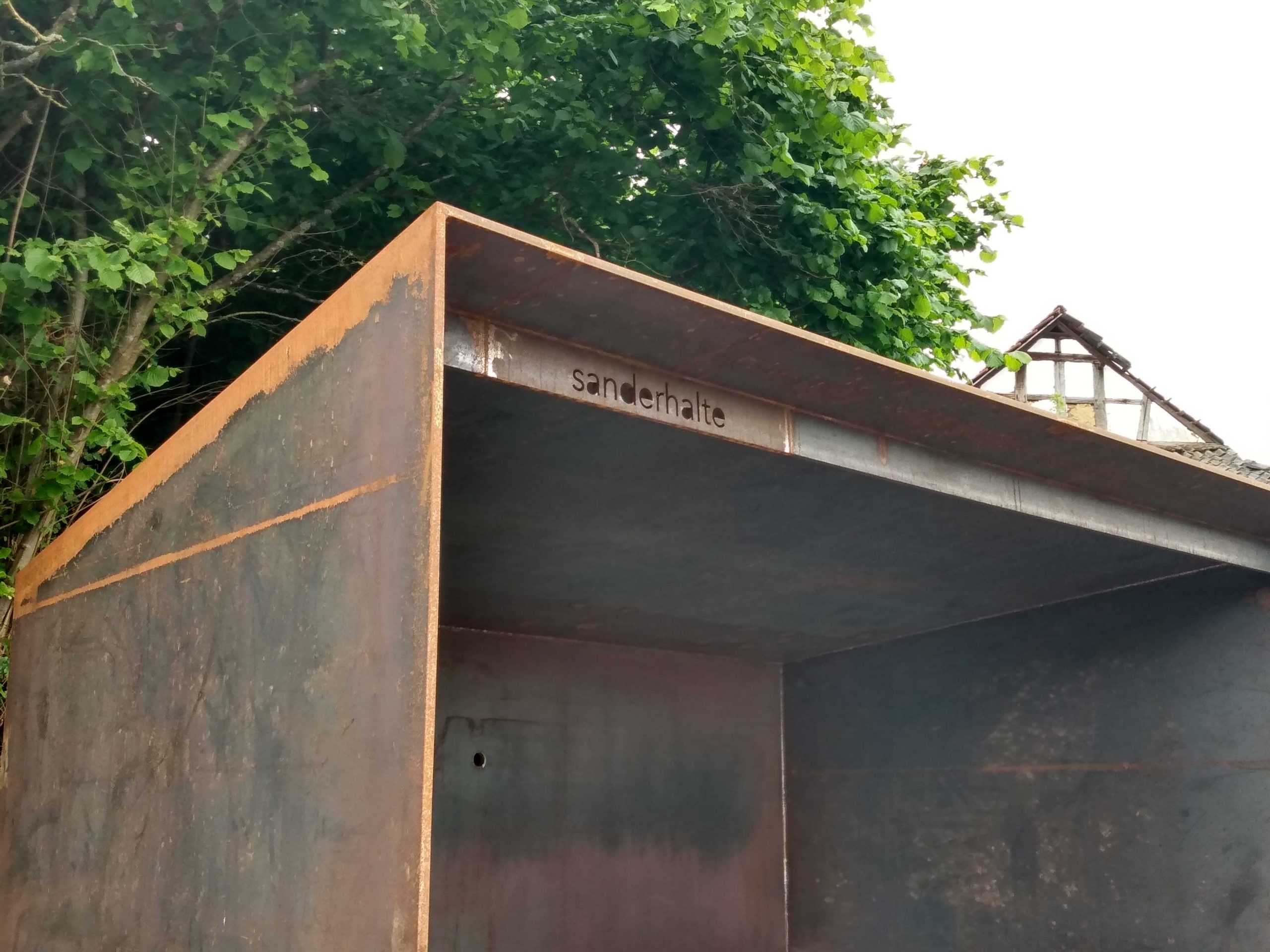 Das bestehende Wartehäuschen an der Basaltstraße wurde ersetzt durch einen scharf geschnittenen, zur Straße geöffneten Körper aus massiven Stahlplatten. Basaltpflaster vermittelt barrierefrei den Höhenunterschied zwischen der abschüssigen Straße und der leicht zurückgesetzten „Sanderhalte“. Boden-, Seiten- und Dachplatte verjüngen sich trichterartig nach hinten, wo in der Rückwand ein Kuckloch ausgelassen ist.
