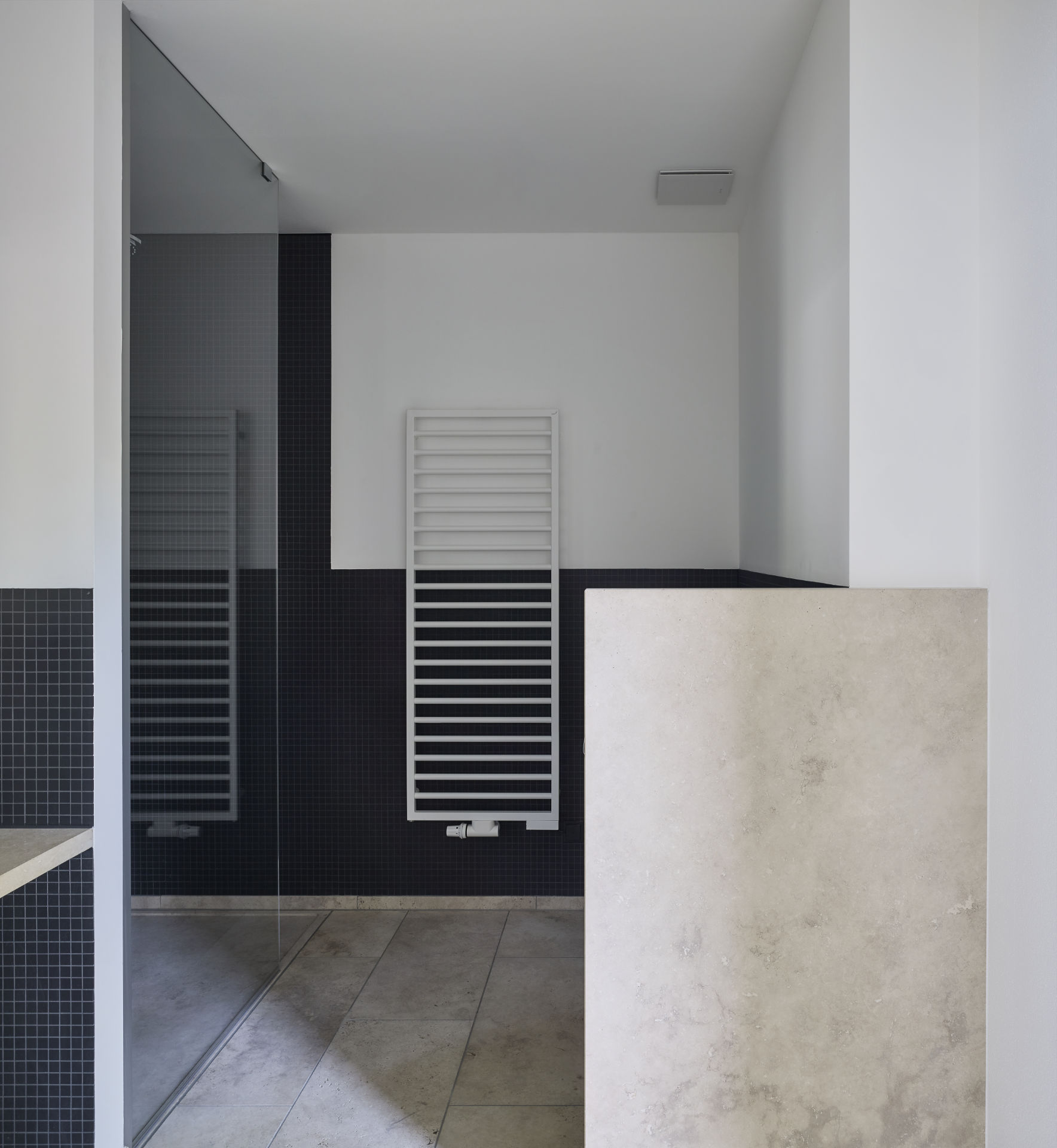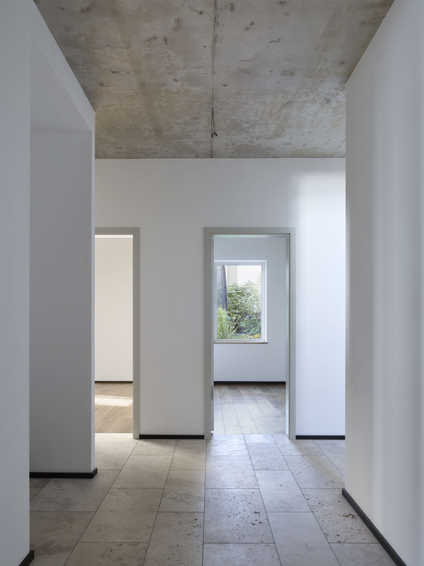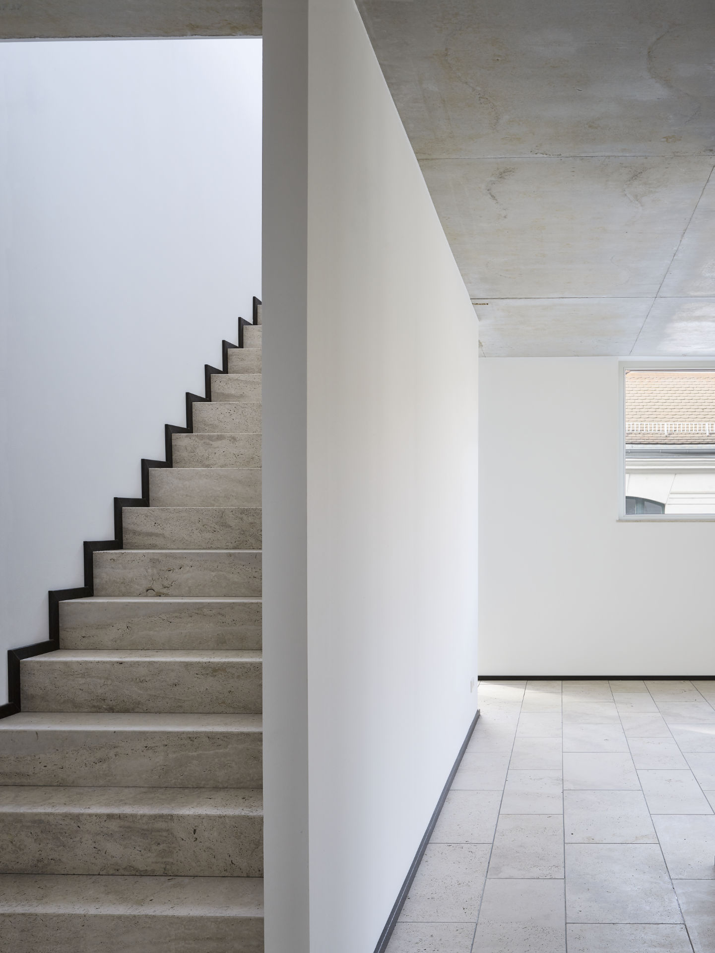 Die reduziert gestalteten Innenräume mit Sichtbetondecken und mit Travertin-Böden als schwere Materialien geben die horizontalen Flächen vor. Die lediglich in den Schlafräumen verlegten Eichenholz- und die Terrassendielen stehen hierzu in Kontrast. Wie bei den angrenzenden neuen Baukörpern werden an den Fassaden ein durchgefärbter Kratzputz, sowie lackierte Holzgeländer mit flächigen Ornamenten eingesetzt. Die Gebäudekubatur wird mit großen Durchdringungen und Fensteröffnungen strukturiert. Diese lassen die in den Baukörper integrierten Freiräume sichtbar werden. Die Schnittstellen zwischen Aussen- und Innenräumen werden durch raumhohe Verglasungen mit Schiebefenstern definiert. Es entstehen vom Erdgeschoss bis in die Obergeschosse Hofsituationen, welche sich vom 2. Obergeschoss über eine Aussentreppe verbunden zum Dachgarten erweitern.
