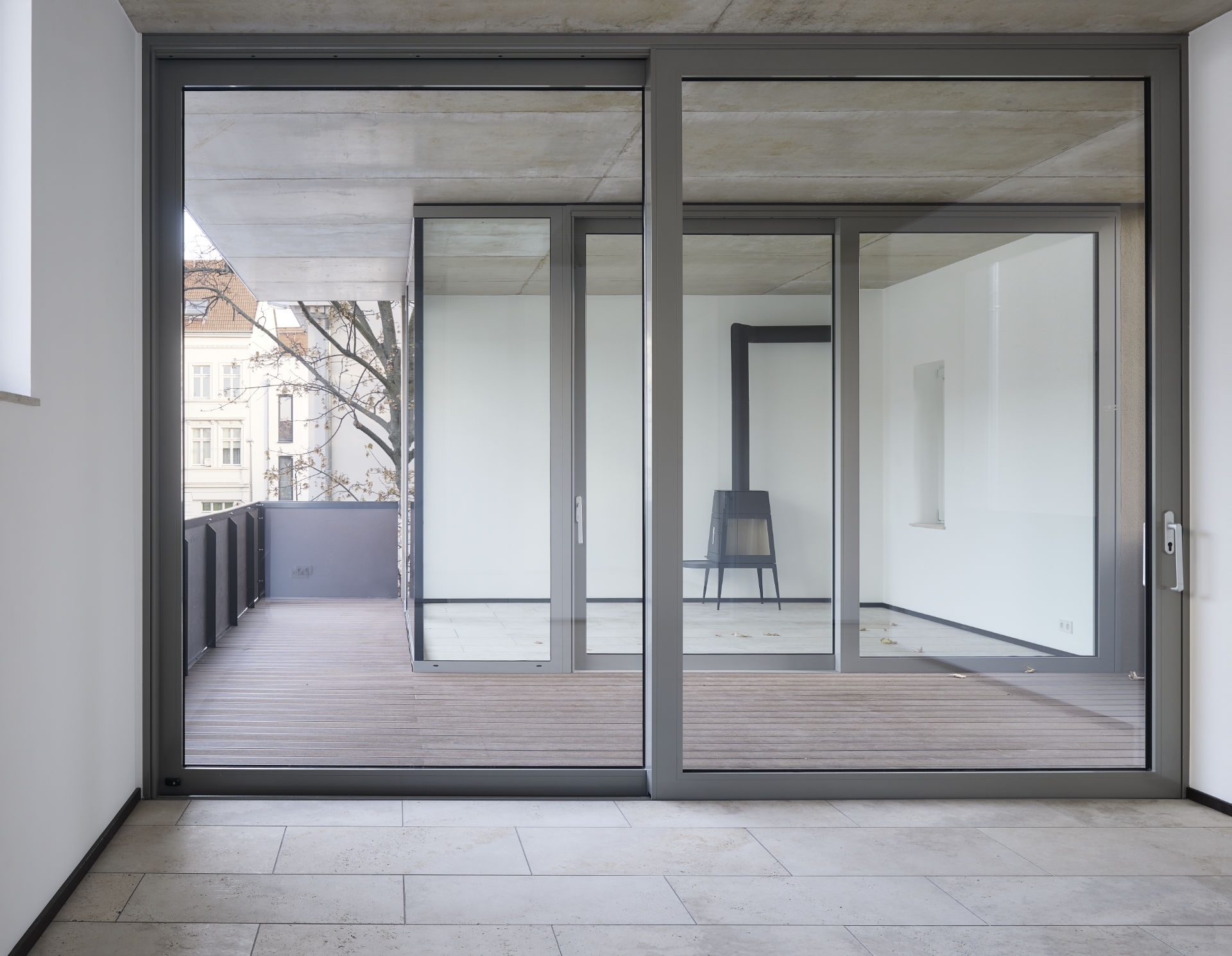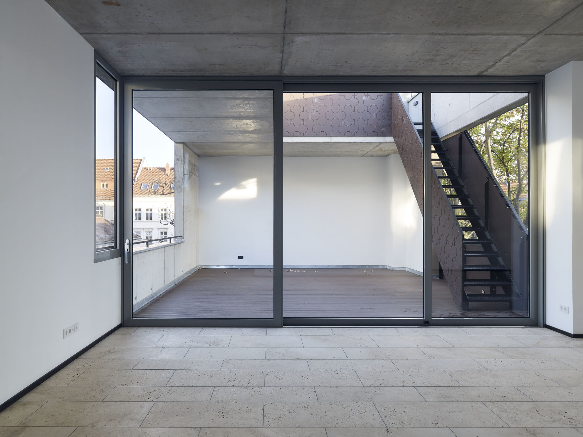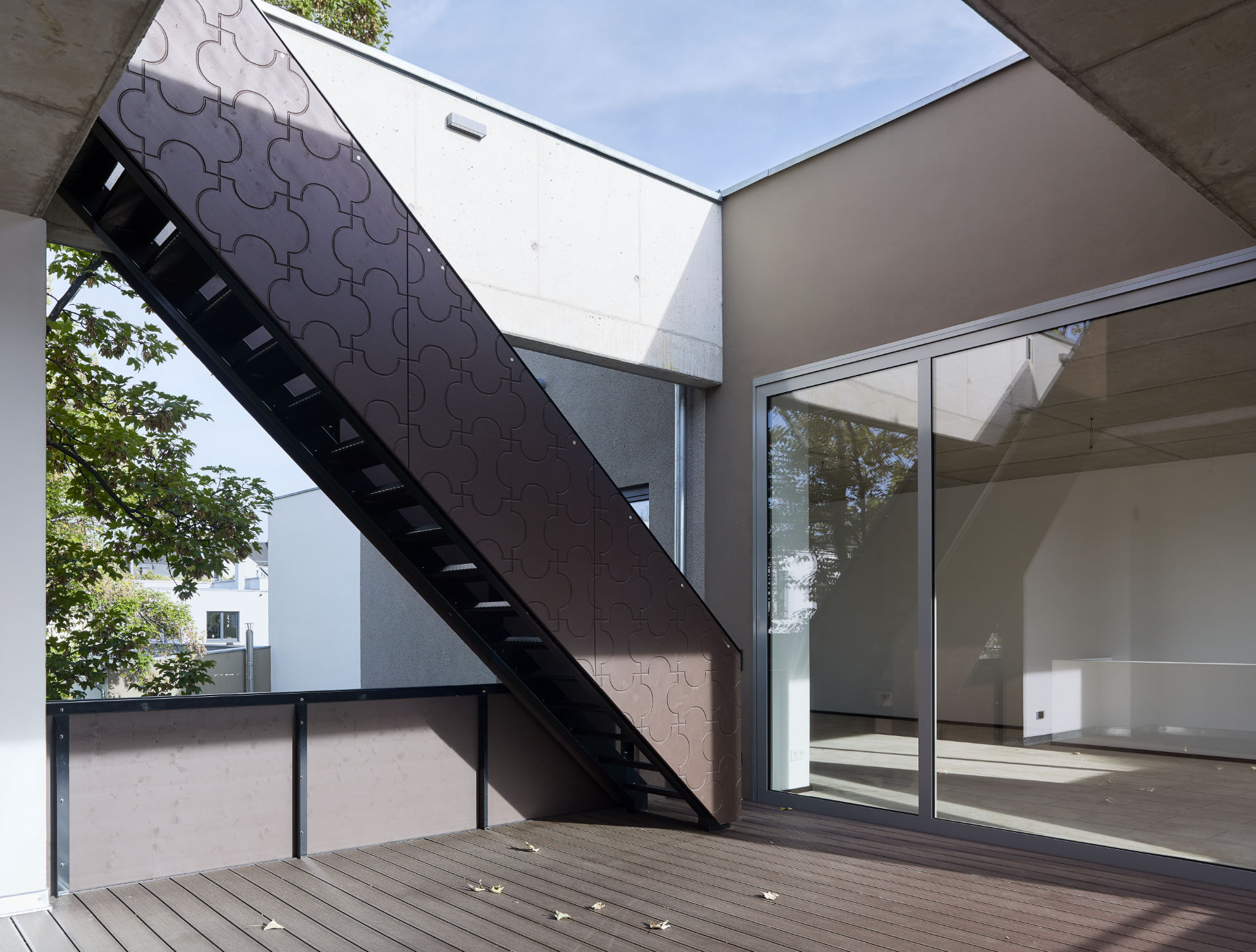 Die schon thematisierte Freiraumtypologie Gemeinschaftshof, privater Garten, Terrasse, Loggia, dass Verhältnis von öffentlichem und privatem Raum befragt dieses Haus weiter.
